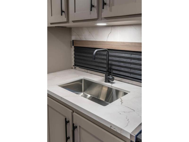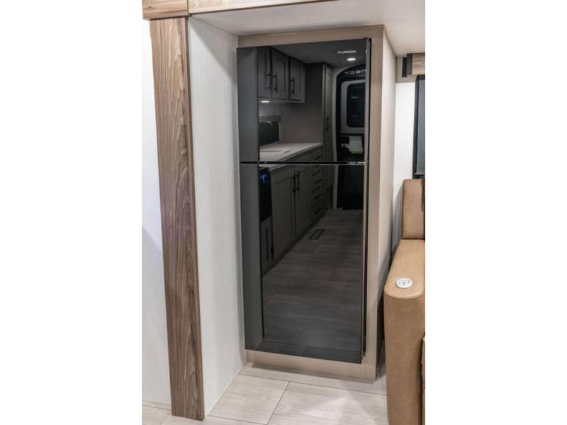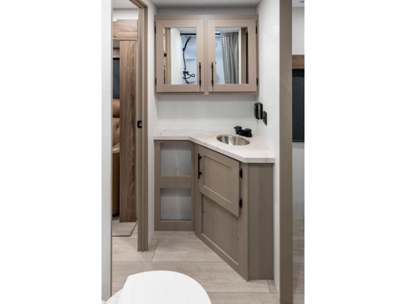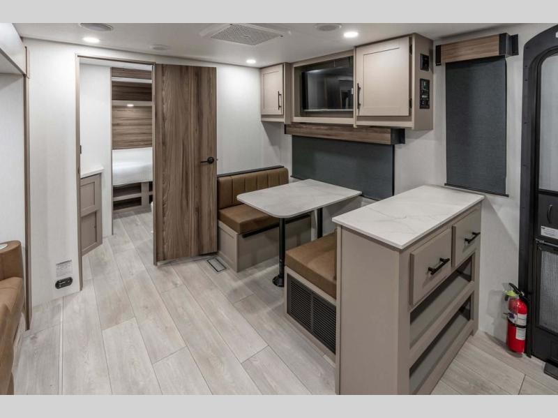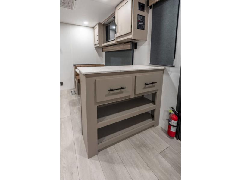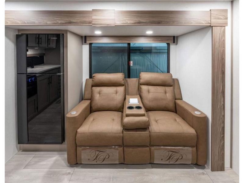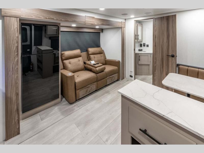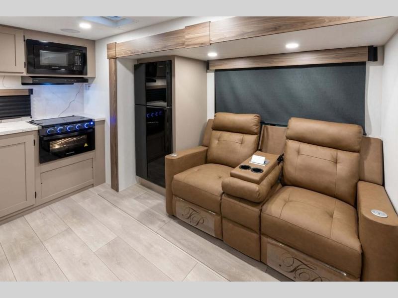 The spacious rear kitchen is equipped with a pantry for ample storage, a three-burner cooktop for culinary creativity, a refrigerator, and a cozy booth dinette for meals or socializing. This unit also has a hutch for additional storage and display. You can unwind in the plush theater seating, organize all of your footwear in the convenient shoe storage. Further, you can relax and refresh after a long day of adventures in the walk-through bath, which provides easy access and convenience, and have a good night's sleep in the spacious front bedroom boasting an ample queen bed and two wardrobes to keep your favorite outfits neat. Finally, head outside and create unforgettable memories under the protection of the exterior power awning.