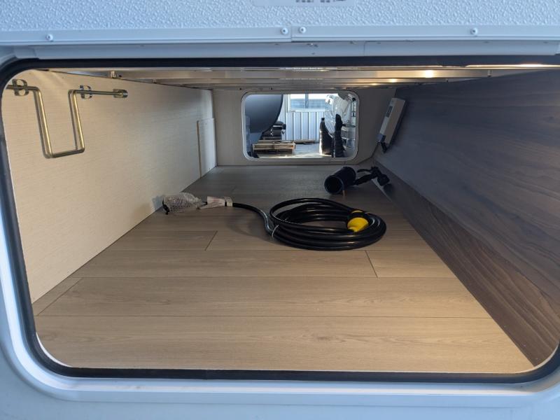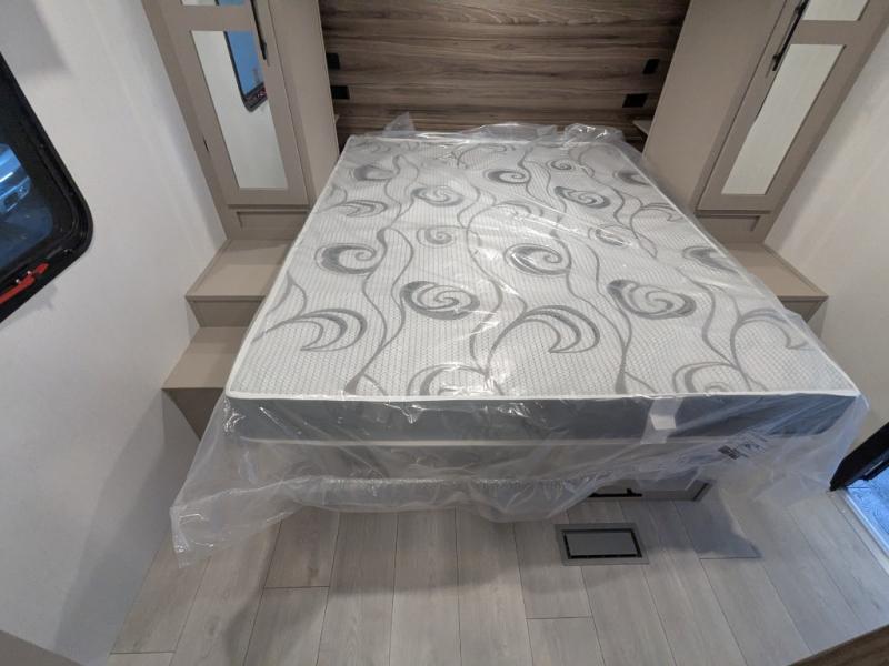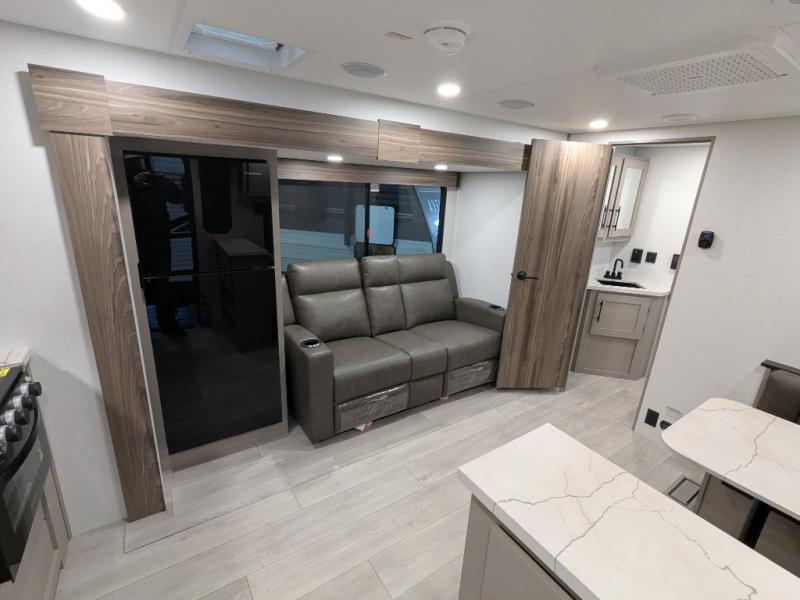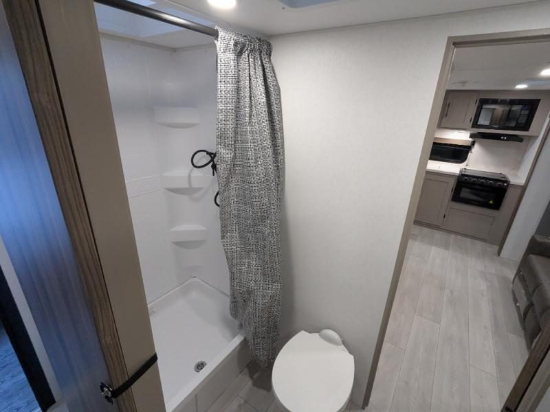The spacious rear kitchen is equipped with a pantry for ample storage, a three-burner cooktop for culinary creativity, a refrigerator, and a cozy booth dinette for meals or socializing. This unit also has a hutch for additional storage and display. You can unwind in the plush theater seating, organize all of your footwear in the convenient shoe storage. Further, you can relax and refresh after a long day of adventures in the walk-through bath, which provides easy access and convenience, and have a good night's sleep in the spacious front bedroom boasting an ample queen bed and two wardrobes to keep your favorite outfits neat. Finally, head outside and create unforgettable memories under the protection of the exterior power awning.