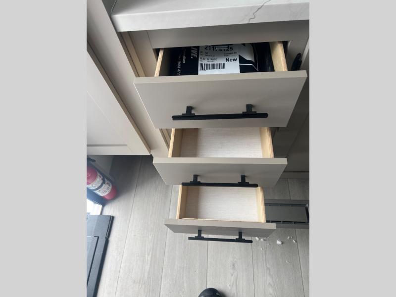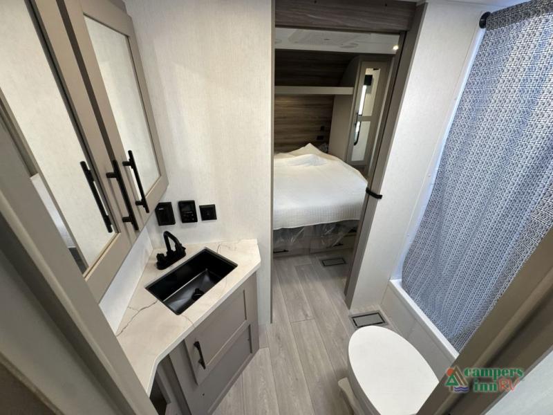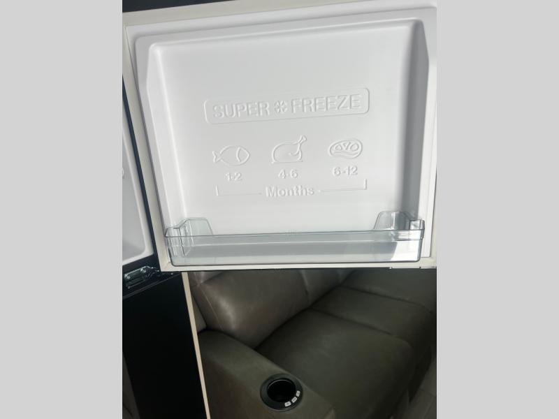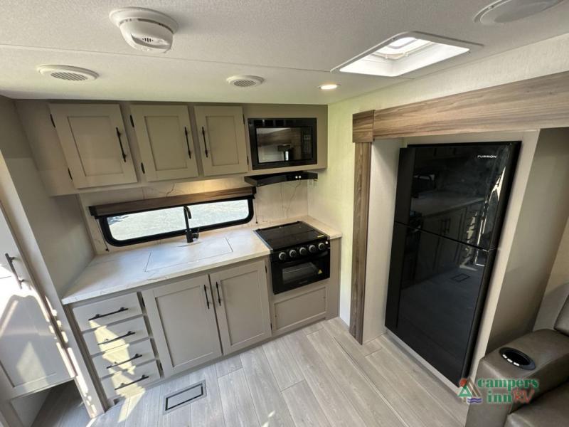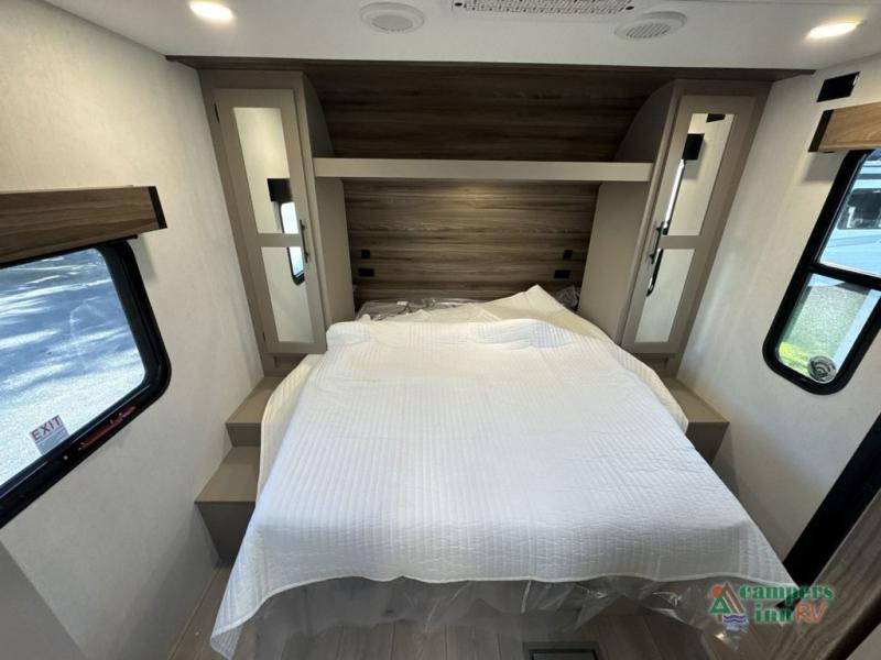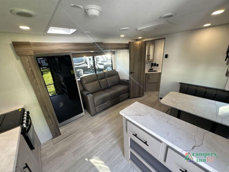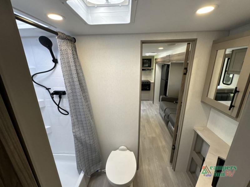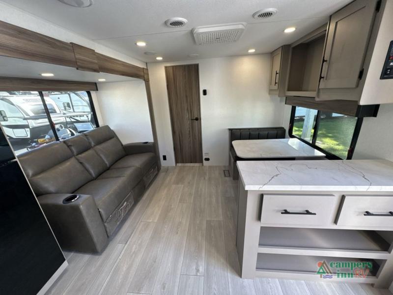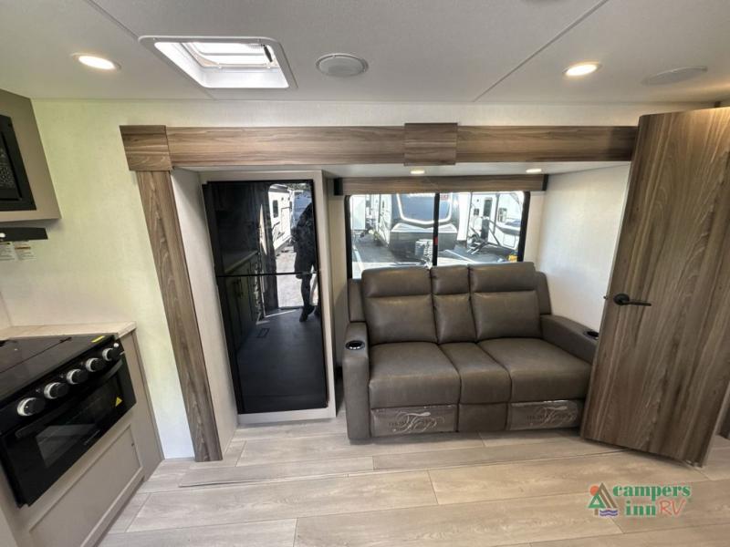 The spacious rear kitchen is equipped with a pantry for ample storage, a three-burner cooktop for culinary creativity, a refrigerator, and a cozy booth dinette for meals or socializing. This unit also has a hutch for additional storage and display. You can unwind in the plush theater seating, organize all of your footwear in the convenient shoe storage. Further, you can relax and refresh after a long day of adventures in the walk-through bath, which provides easy access and convenience, and have a good night's sleep in the spacious front bedroom boasting an ample queen bed and two wardrobes to keep your favorite outfits neat. Finally, head outside and create unforgettable memories under the protection of the exterior power awning.
