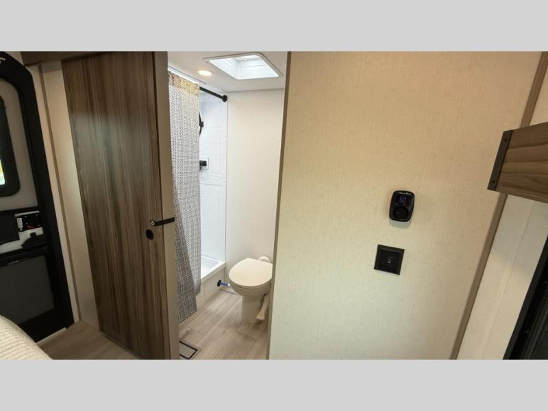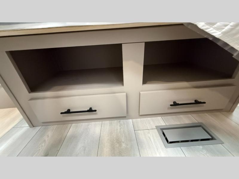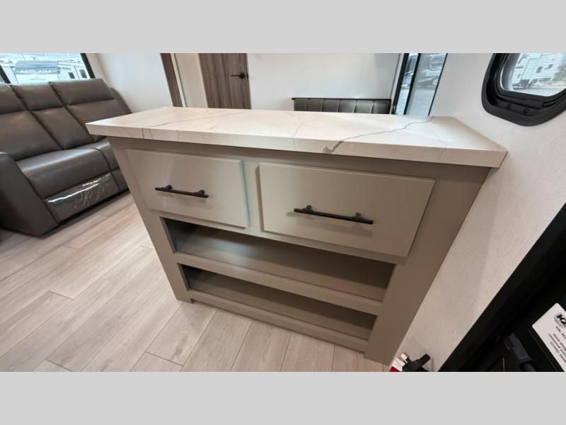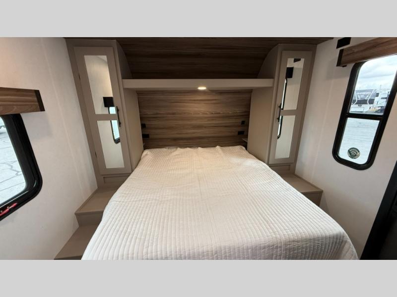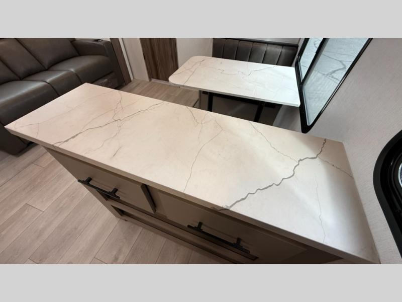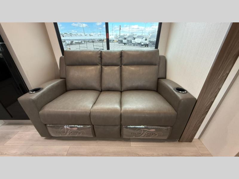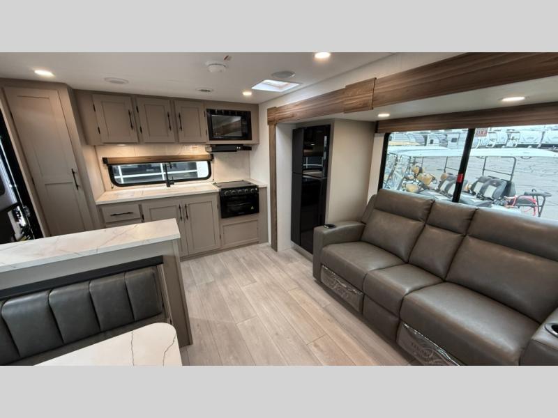 The spacious rear kitchen is equipped with a pantry for ample storage, a three-burner cooktop for culinary creativity, a refrigerator, and a cozy booth dinette for meals or socializing. This unit also has a hutch for additional storage and display. You can unwind in the plush theater seating, organize all of your footwear in the convenient shoe storage. Further, you can relax and refresh after a long day of adventures in the walk-through bath, which provides easy access and convenience, and have a good night's sleep in the spacious front bedroom boasting an ample queen bed and two wardrobes to keep your favorite outfits neat. Finally, head outside and create unforgettable memories under the protection of the exterior power awning.