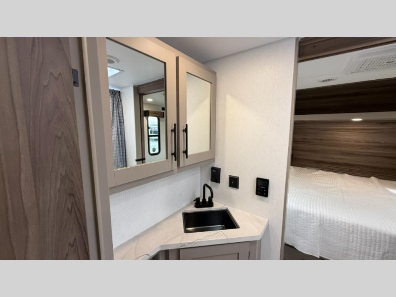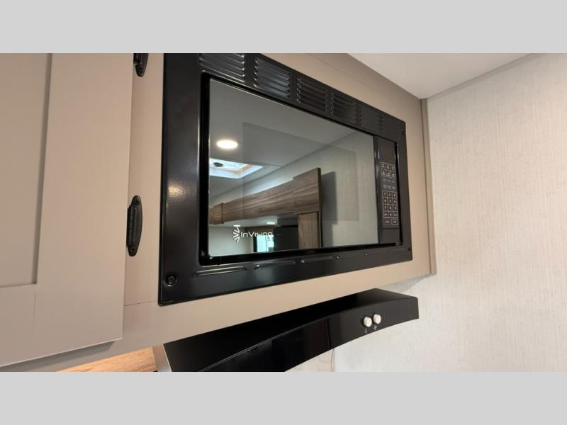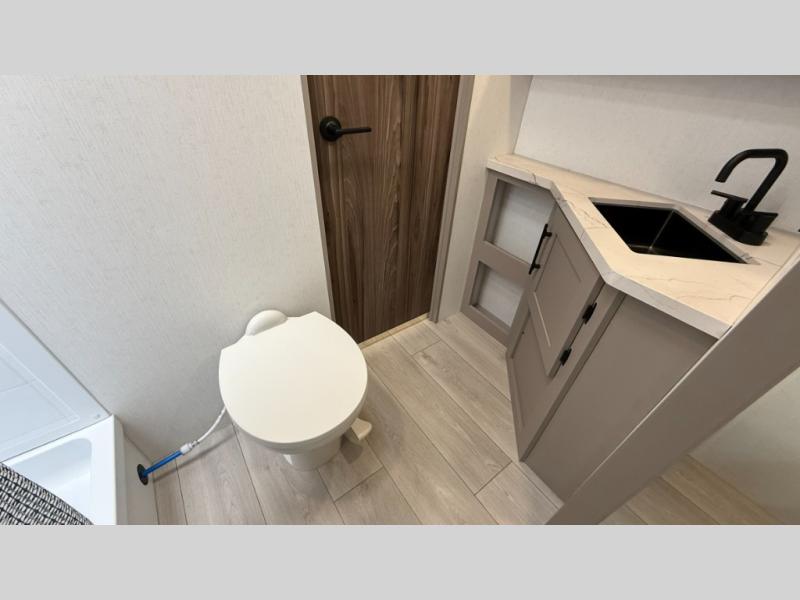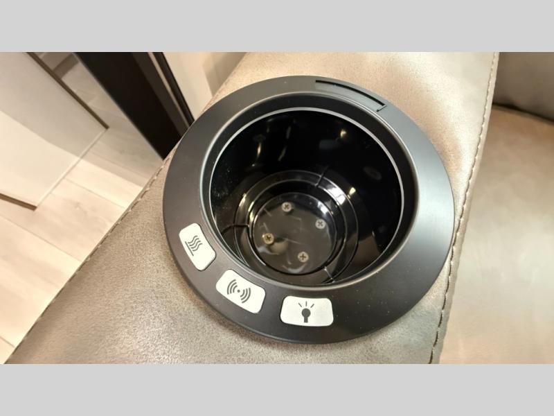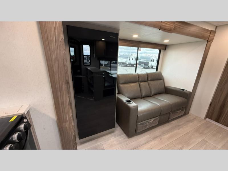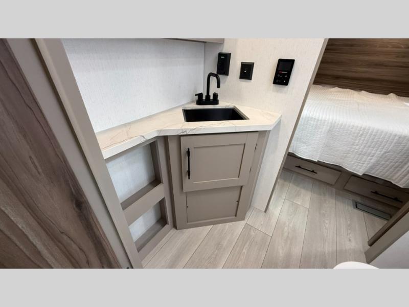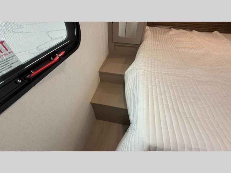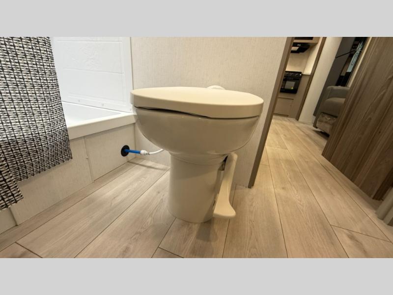 The spacious rear kitchen is equipped with a pantry for ample storage, a three-burner cooktop for culinary creativity, a refrigerator, and a cozy booth dinette for meals or socializing. This unit also has a hutch for additional storage and display. You can unwind in the plush theater seating, organize all of your footwear in the convenient shoe storage. Further, you can relax and refresh after a long day of adventures in the walk-through bath, which provides easy access and convenience, and have a good night's sleep in the spacious front bedroom boasting an ample queen bed and two wardrobes to keep your favorite outfits neat. Finally, head outside and create unforgettable memories under the protection of the exterior power awning.