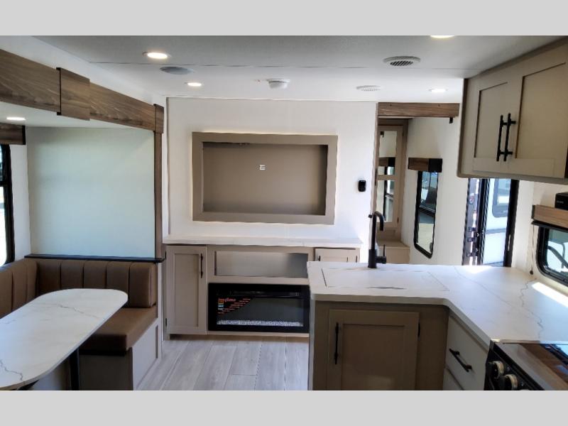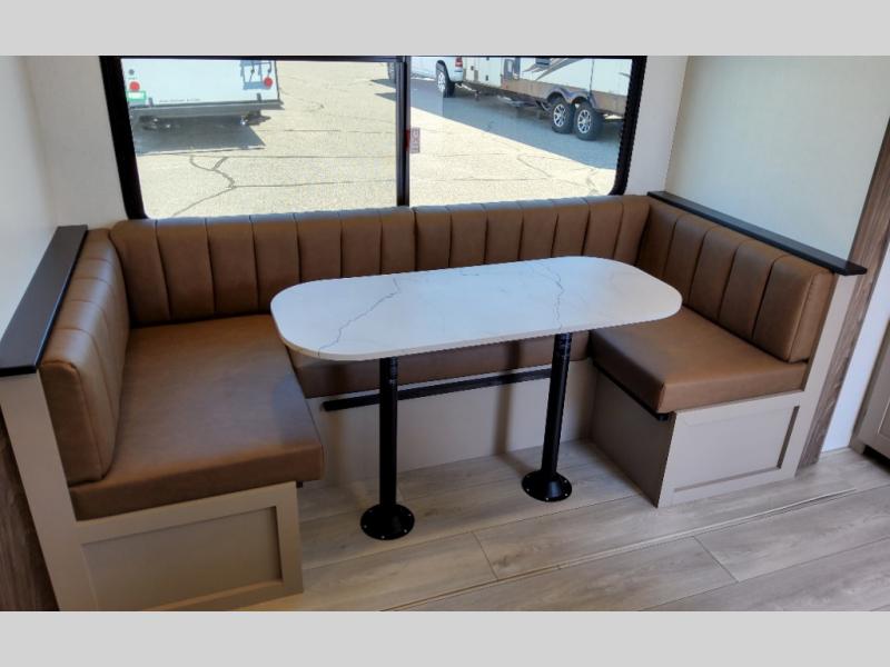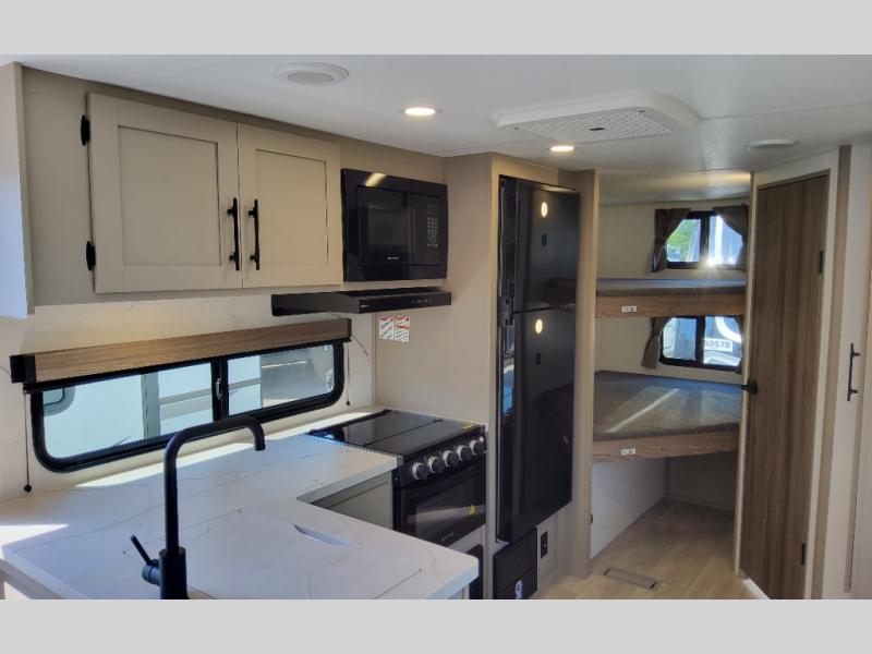 Get ready for outdoor fun at your favorite campground or RV park, and relaxation both outside and inside this trailer! The 18' power awning provides protection from the elements and the LED light strip allows you to stay up late, the outside kitchen and griddle provide amenities to make meals in the great outdoors, plus the trunk door and the pass-through storage give you access to stow items away. When you are ready to call it a night, there is a queen bed in the front private bedroom, double-size bunks next to the full bathroom, and a U-shaped dinette slide offers extra sleeping space. The next morning, the cook can make meals using the L-shaped kitchen with full amenities, or head back outdoors to use the outside amenities.