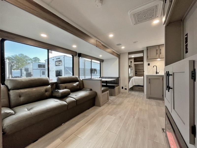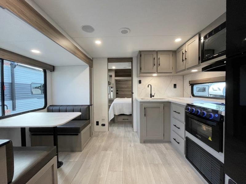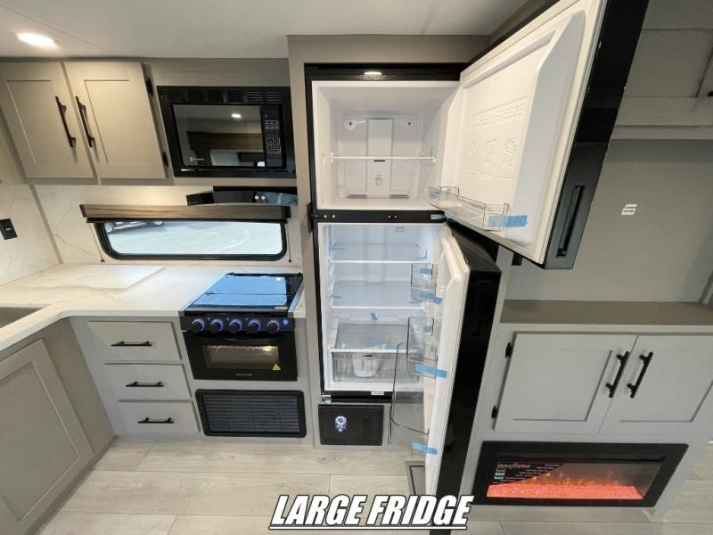 Headed to the RV park with your family and friends? Want enough space to allow overnight guests to stay the night on occasion? This trailer gives you double-size bunks, a 70" sofa and a booth dinette that offer extra sleeping space while you enjoy your own walk-around queen bed in the front private bedroom. You will also have dual wardrobes, and a TV mount to add your own TV. Everyone will stay refreshed and cleaned using the rear corner full bathroom, and fed by the cook that has an inside kitchen with full amenities including an L-shaped counter and a large sink. There is also a walk-in pantry with coat hooks next to the entry to utilize as a multi-purpose closet. And there is an outside kitchen with a griddle and a refrigerator, a 20' power awning with an LED light strip, and a pass-through storage for the larger camping items.