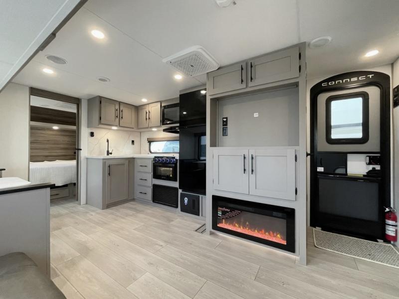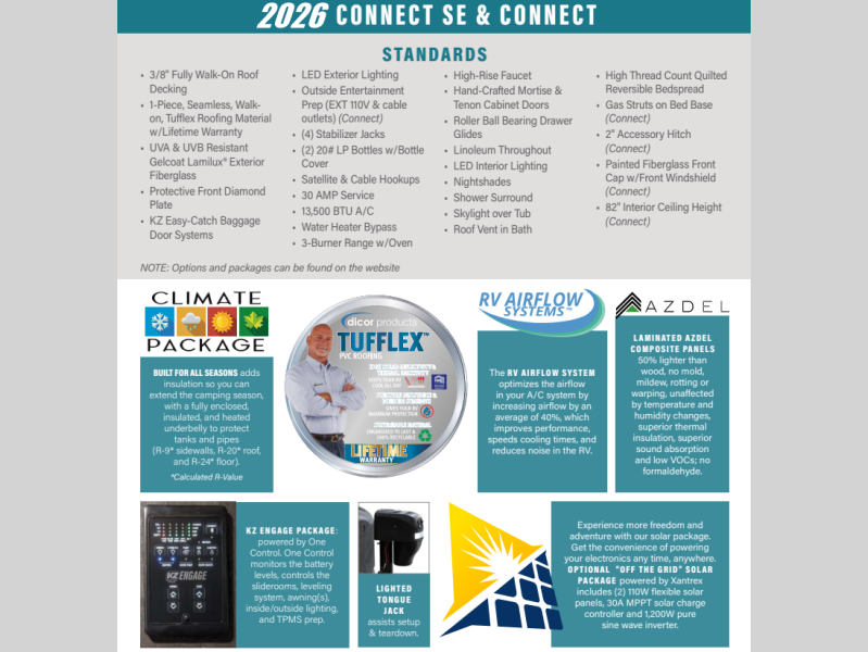 Each Connect SE travel trailer by KZ includes an NXG frame, which is a high quality, highly engineered frame that provides a lightweight yet strong foundation for your RV. The Climate package provides added insulation to extend your camping season year-round with a fully enclosed, insulated and heated underbelly to protect the tanks and pipes. Some top features include the 17-inch range with illuminated control knobs, the seamless countertops with a deep undermount stainless steel kitchen sink including a sink cover for added countertop space, and a black high-rise faucet. You will also enjoy the KZ Engage that is powered by OneControl to monitor and control the battery levels, the slide(s), the leveling system, the awning(s), plus the inside and outside lighting. Choose your favorite today!
