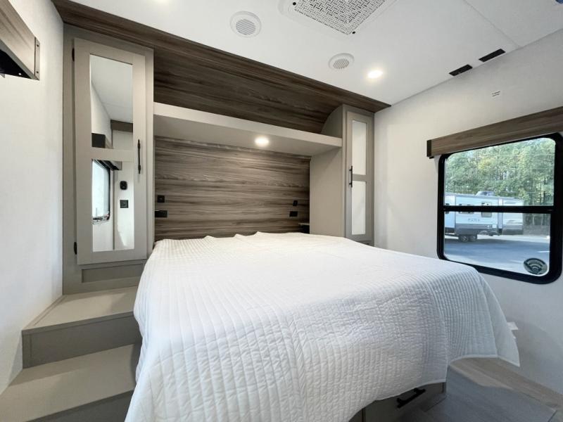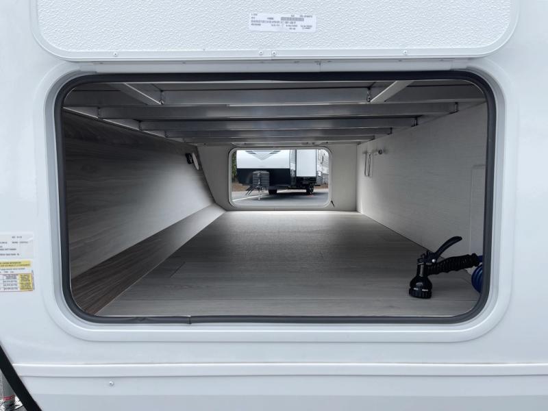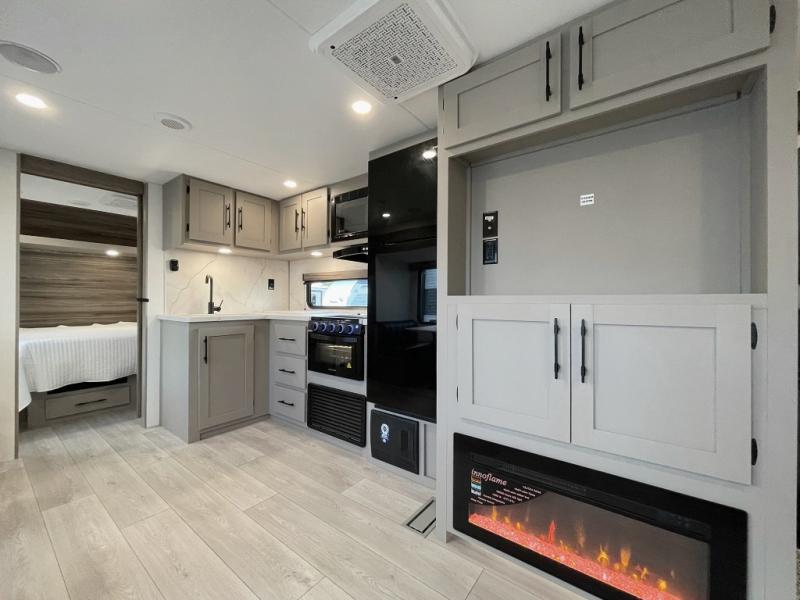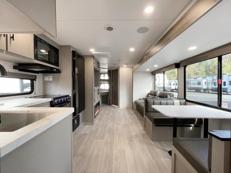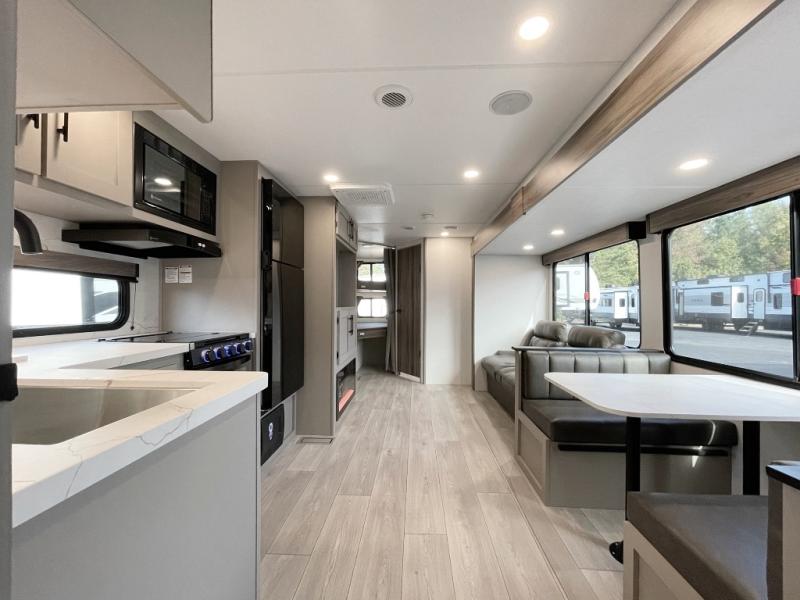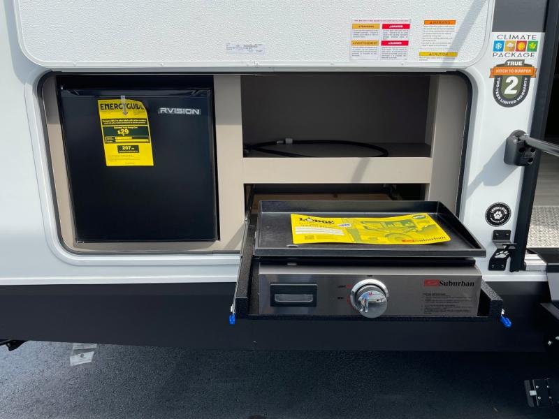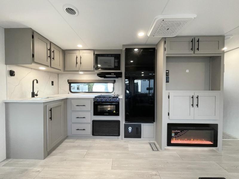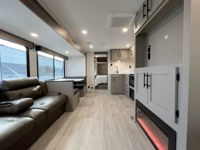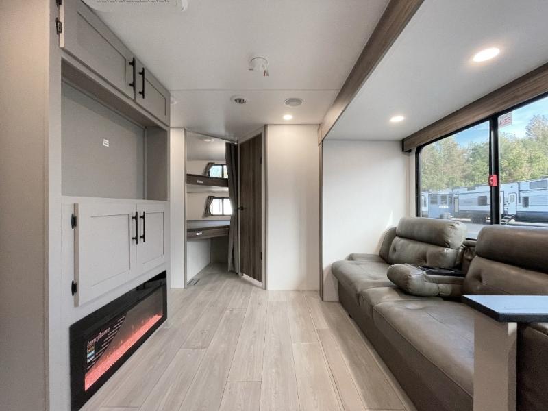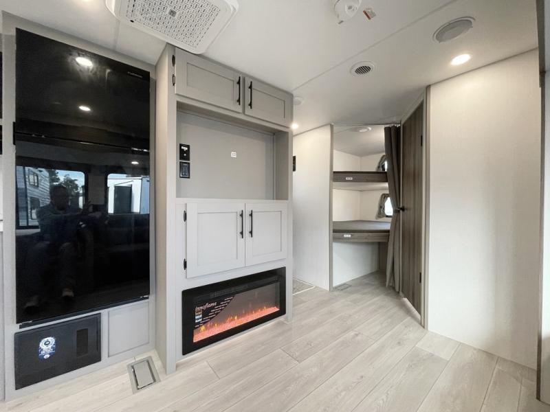 Headed to the RV park with your family and friends? Want enough space to allow overnight guests to stay the night on occasion? This trailer gives you double-size bunks, a 70" sofa and a booth dinette that offer extra sleeping space while you enjoy your own walk-around queen bed in the front private bedroom. You will also have dual wardrobes, and a TV mount to add your own TV. Everyone will stay refreshed and cleaned using the rear corner full bathroom, and fed by the cook that has an inside kitchen with full amenities including an L-shaped counter and a large sink. There is also a walk-in pantry with coat hooks next to the entry to utilize as a multi-purpose closet. And there is an outside kitchen with a griddle and a refrigerator, a 20' power awning with an LED light strip, and a pass-through storage for the larger camping items.