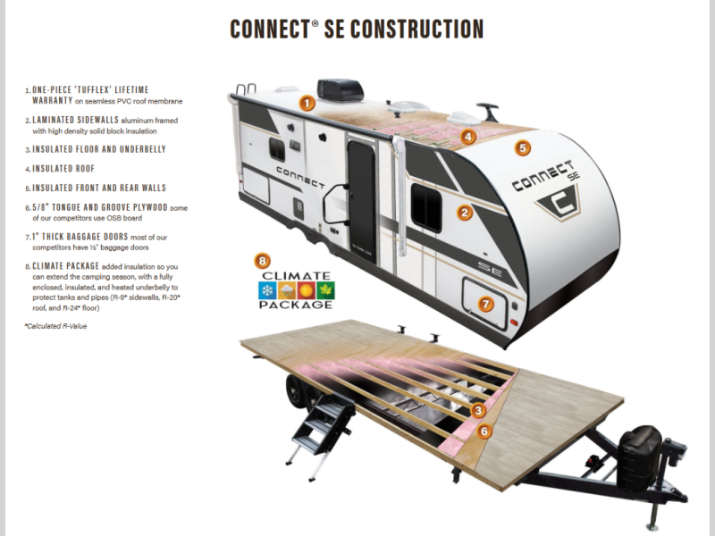 Each Connect SE travel trailer by KZ includes an NXG frame, which is a high quality, highly engineered frame that provides a lightweight yet strong foundation for your RV. The Climate package provides added insulation to extend your camping season year-round with a fully enclosed, insulated and heated underbelly to protect the tanks and pipes. Some top features include the 17-inch range with illuminated control knobs, the seamless countertops with a deep undermount stainless steel kitchen sink including a sink cover for added countertop space, and a black high-rise faucet. You will also enjoy the KZ Engage that is powered by OneControl to monitor and control the battery levels, the slide(s), the leveling system, the awning(s), plus the inside and outside lighting. Choose your favorite today!