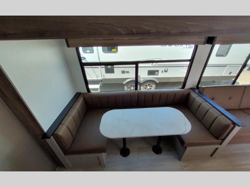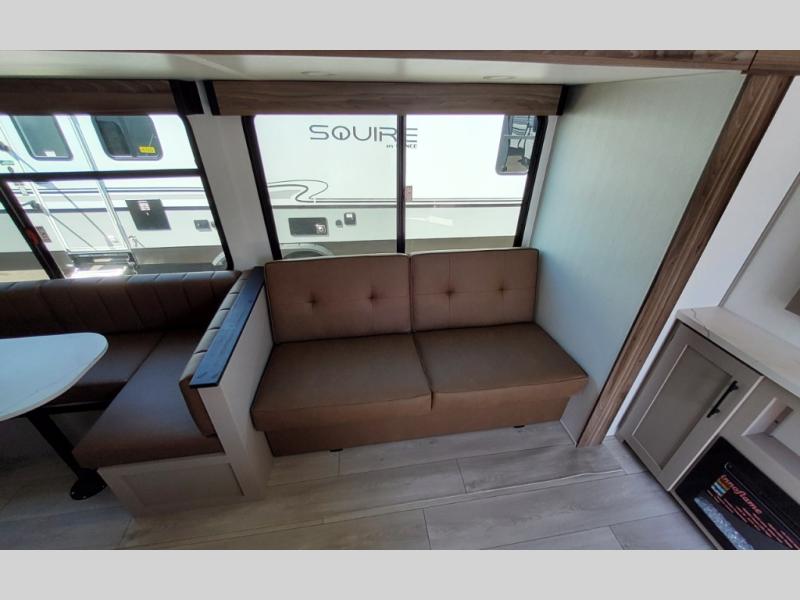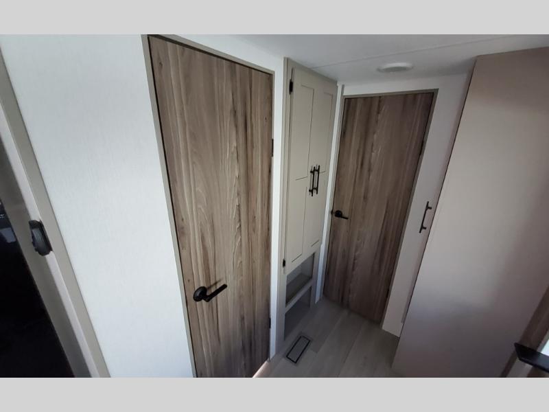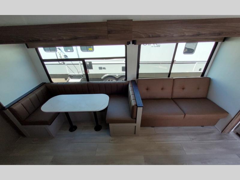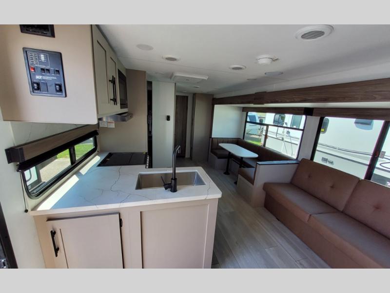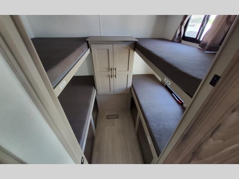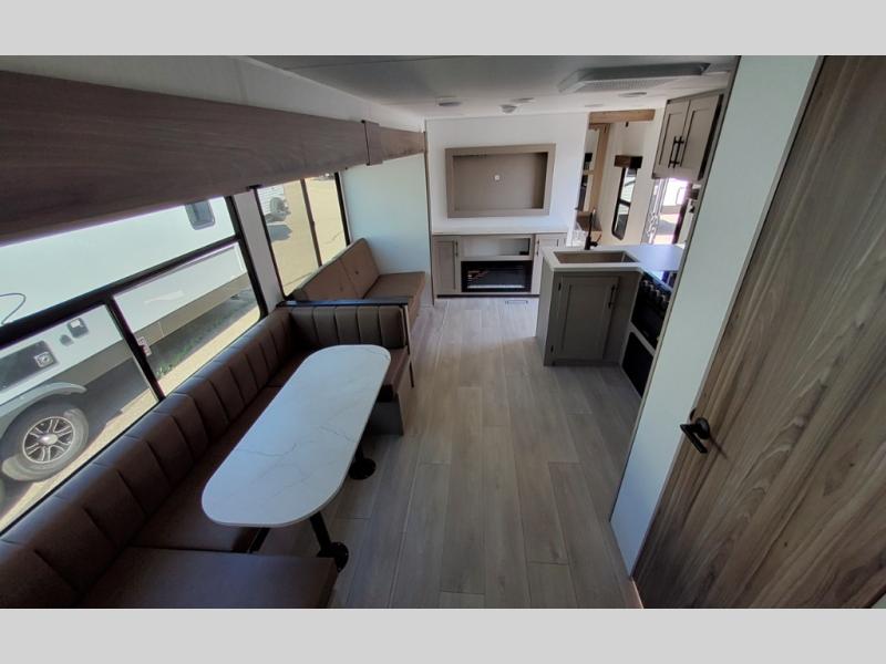 These travel trailer bunk beds are perfect for kids, while the closet provide ample storage space for clothing and essentials. The full bathroom features a linen closet, providing convenient storage for towels and toiletries. The pantry is perfect for storing snacks and ingredients, while the refrigerator keeps your food and drinks fresh, and the sink is conveniently located for meal prep. The U-shaped dinette is a great spot for meals or socializing, while the sofa offers a comfortable spot to relax. The entertainment center with a fireplace is perfect for cozying up on chilly nights. The front bedroom features a spacious queen bed and ample storage space in the wardrobes. Convenience is found in the exterior thanks to the two exterior awnings providing shade and protection from the elements, while the outside kitchen is perfect for outdoor cooking and entertaining
