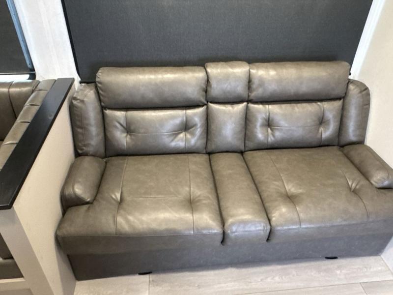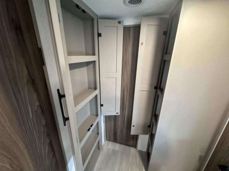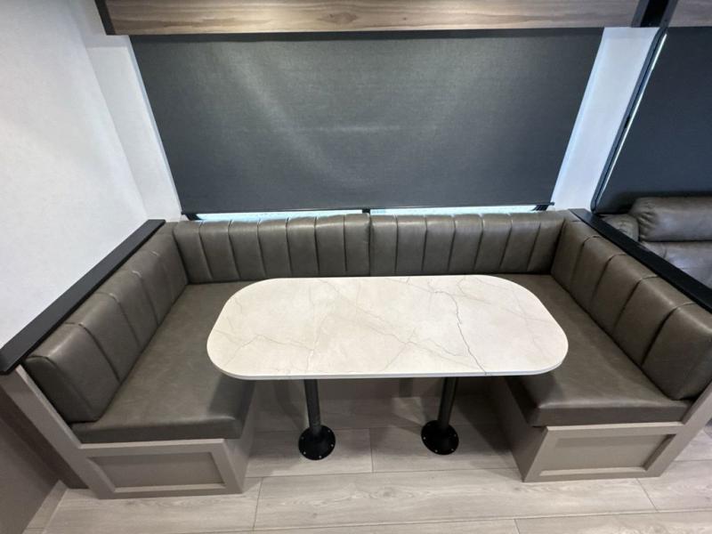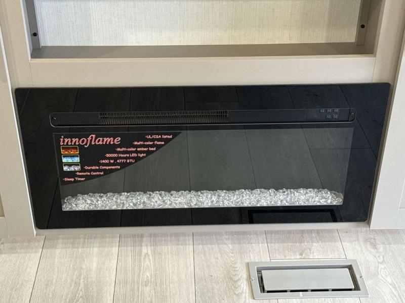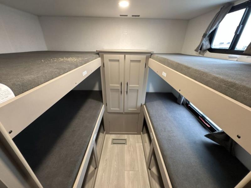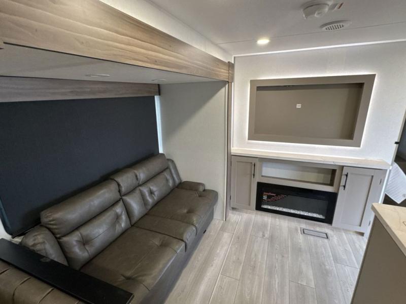 These travel trailer bunk beds are perfect for kids, while the closet provide ample storage space for clothing and essentials. The full bathroom features a linen closet, providing convenient storage for towels and toiletries. The pantry is perfect for storing snacks and ingredients, while the refrigerator keeps your food and drinks fresh, and the sink is conveniently located for meal prep. The U-shaped dinette is a great spot for meals or socializing, while the sofa offers a comfortable spot to relax. The entertainment center with a fireplace is perfect for cozying up on chilly nights. The front bedroom features a spacious queen bed and ample storage space in the wardrobes. Convenience is found in the exterior thanks to the two exterior awnings providing shade and protection from the elements, while the outside kitchen is perfect for outdoor cooking and entertaining