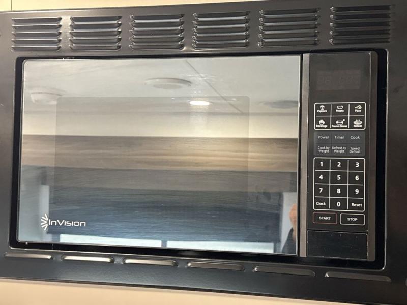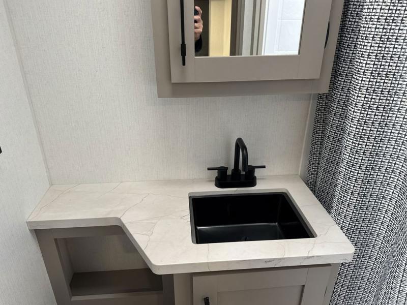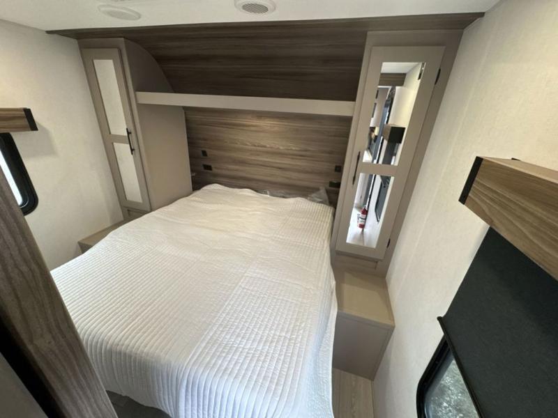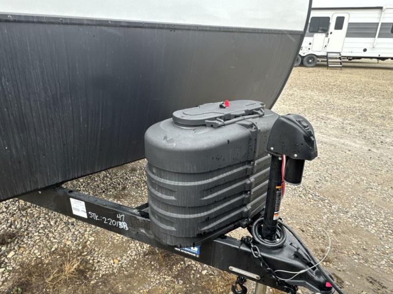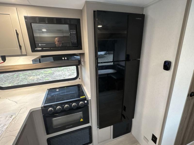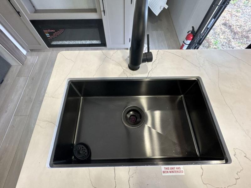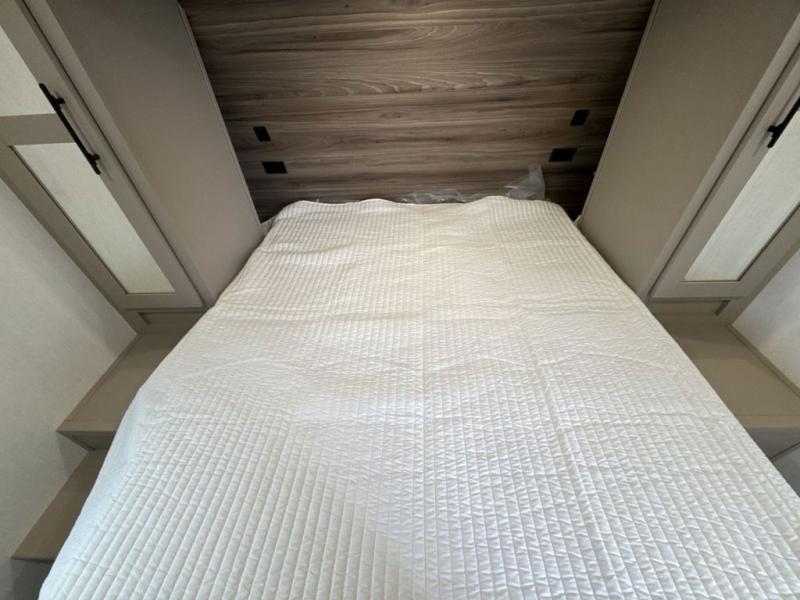These travel trailer bunk beds are perfect for kids, while the closet provide ample storage space for clothing and essentials. The full bathroom features a linen closet, providing convenient storage for towels and toiletries. The pantry is perfect for storing snacks and ingredients, while the refrigerator keeps your food and drinks fresh, and the sink is conveniently located for meal prep. The U-shaped dinette is a great spot for meals or socializing, while the sofa offers a comfortable spot to relax. The entertainment center with a fireplace is perfect for cozying up on chilly nights. The front bedroom features a spacious queen bed and ample storage space in the wardrobes. Convenience is found in the exterior thanks to the two exterior awnings providing shade and protection from the elements, while the outside kitchen is perfect for outdoor cooking and entertaining