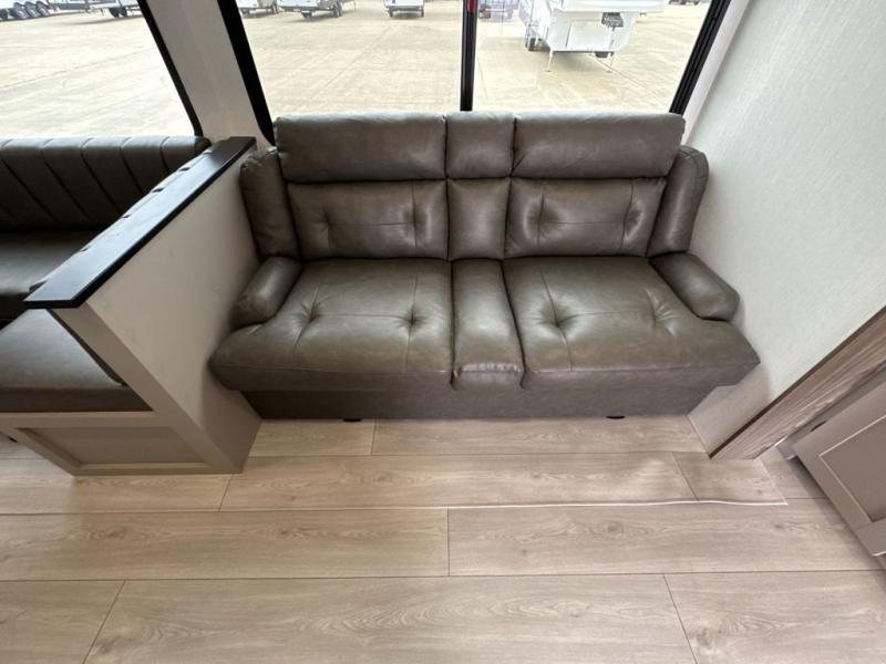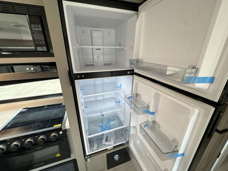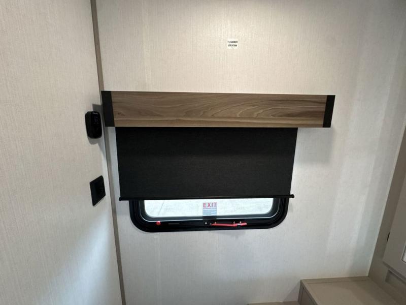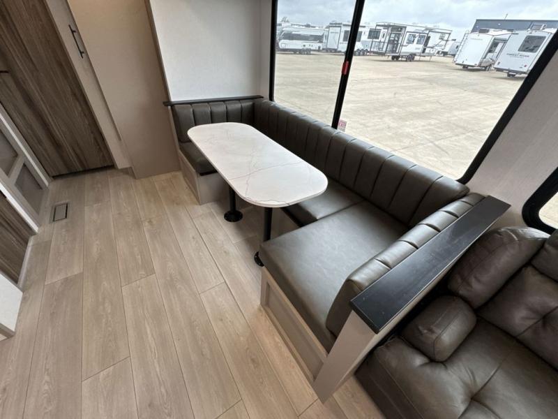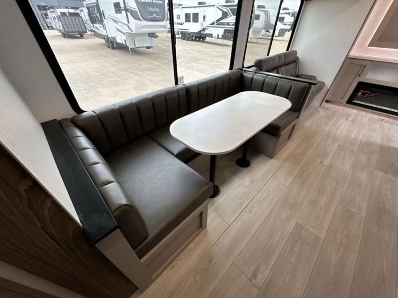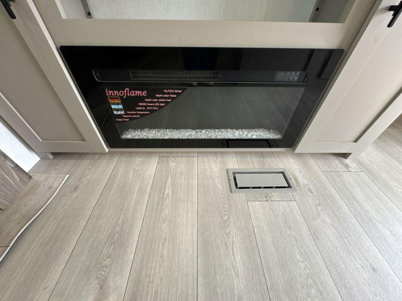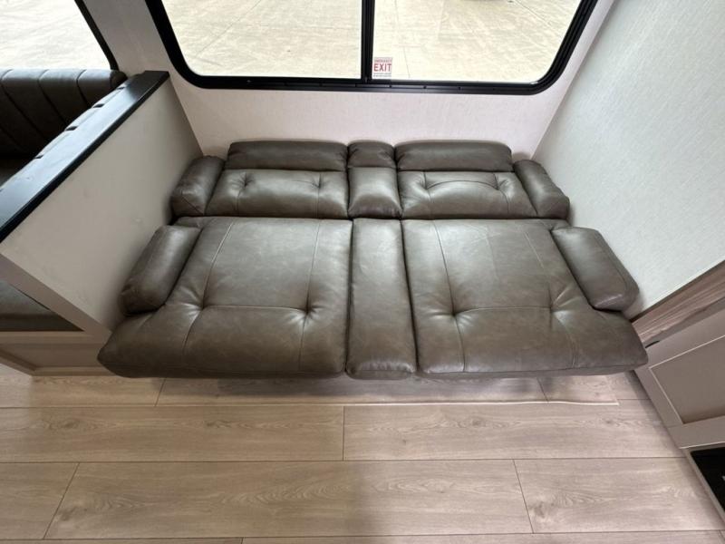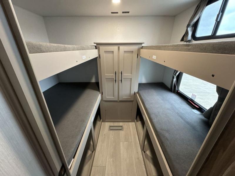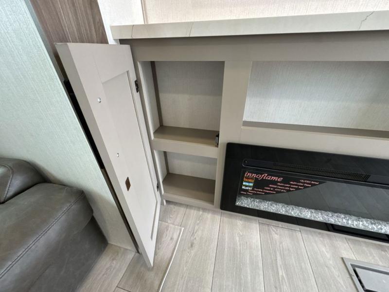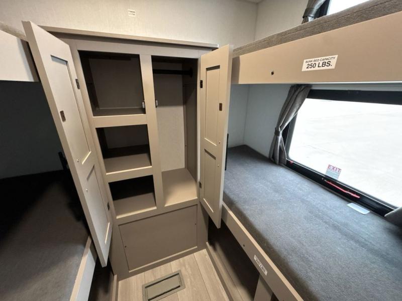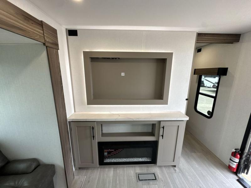 These travel trailer bunk beds are perfect for kids, while the closet provide ample storage space for clothing and essentials. The full bathroom features a linen closet, providing convenient storage for towels and toiletries. The pantry is perfect for storing snacks and ingredients, while the refrigerator keeps your food and drinks fresh, and the sink is conveniently located for meal prep. The U-shaped dinette is a great spot for meals or socializing, while the sofa offers a comfortable spot to relax. The entertainment center with a fireplace is perfect for cozying up on chilly nights. The front bedroom features a spacious queen bed and ample storage space in the wardrobes. Convenience is found in the exterior thanks to the two exterior awnings providing shade and protection from the elements, while the outside kitchen is perfect for outdoor cooking and entertaining
