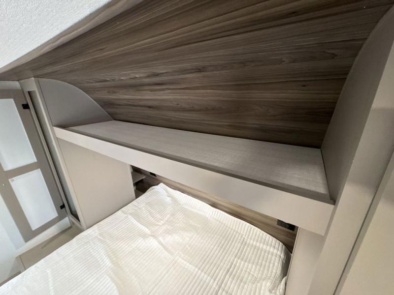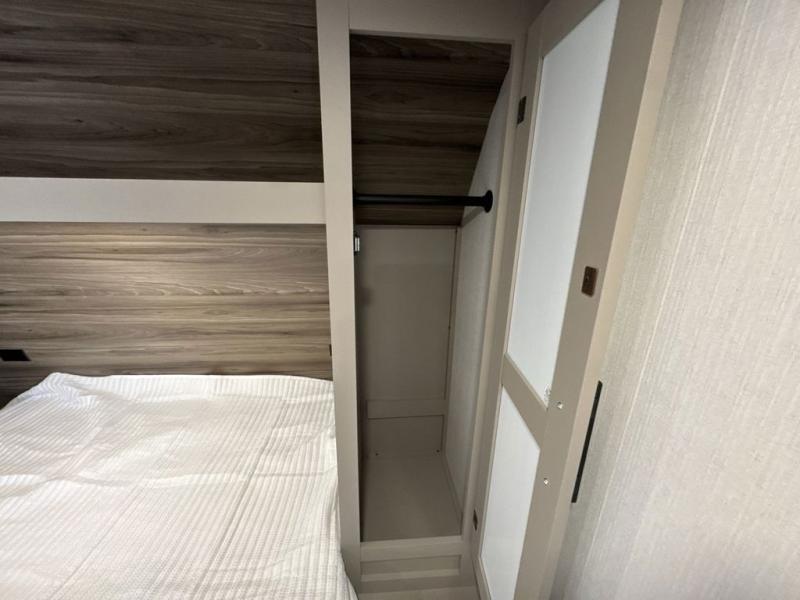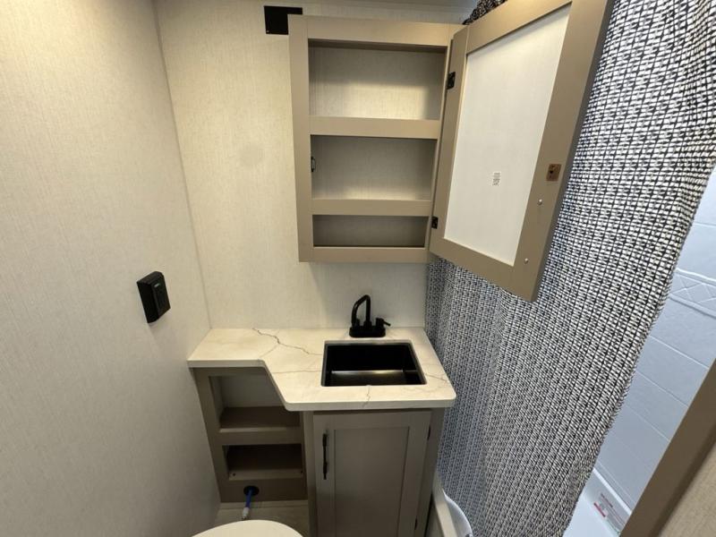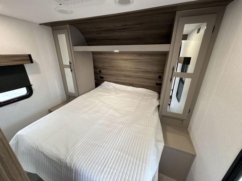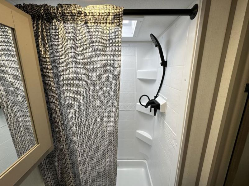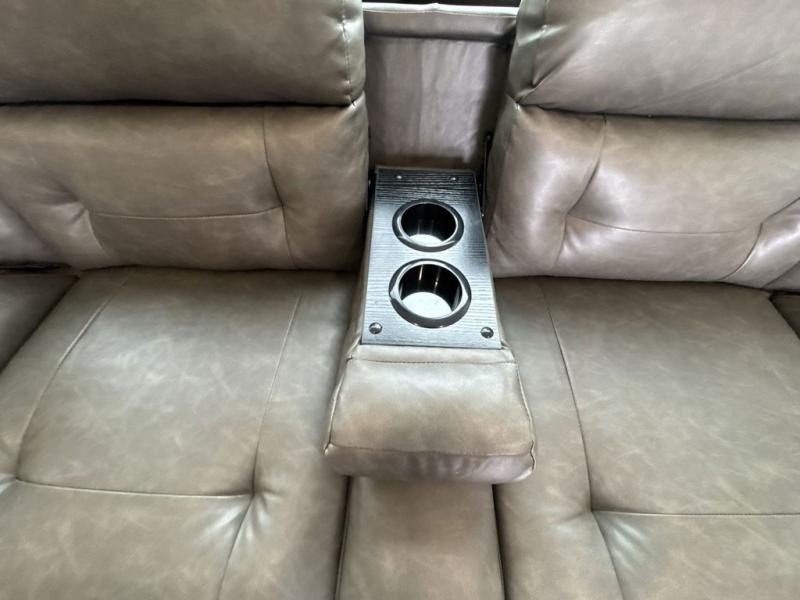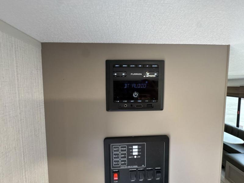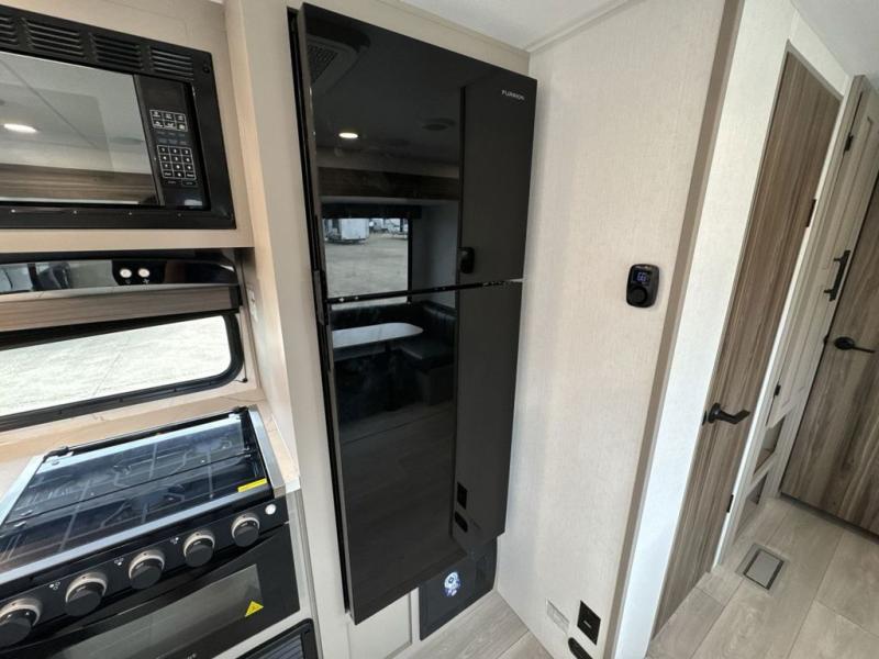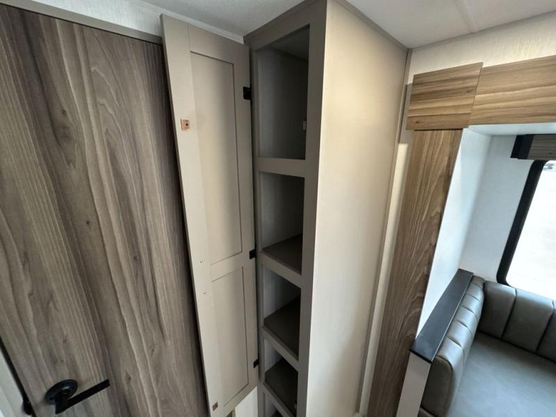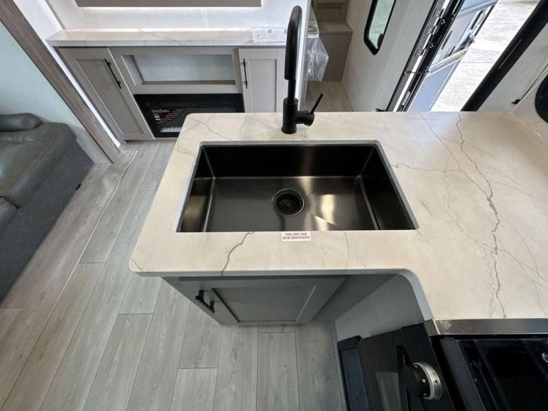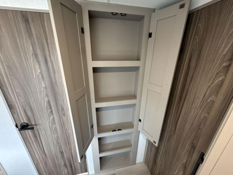 These travel trailer bunk beds are perfect for kids, while the closet provide ample storage space for clothing and essentials. The full bathroom features a linen closet, providing convenient storage for towels and toiletries. The pantry is perfect for storing snacks and ingredients, while the refrigerator keeps your food and drinks fresh, and the sink is conveniently located for meal prep. The U-shaped dinette is a great spot for meals or socializing, while the sofa offers a comfortable spot to relax. The entertainment center with a fireplace is perfect for cozying up on chilly nights. The front bedroom features a spacious queen bed and ample storage space in the wardrobes. Convenience is found in the exterior thanks to the two exterior awnings providing shade and protection from the elements, while the outside kitchen is perfect for outdoor cooking and entertaining