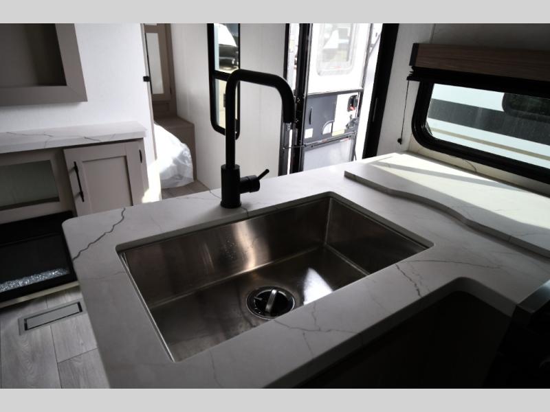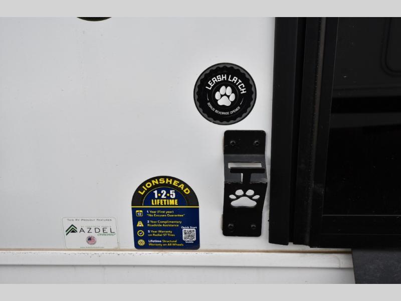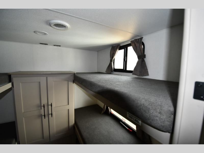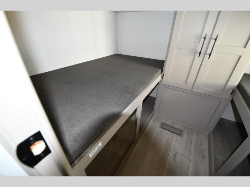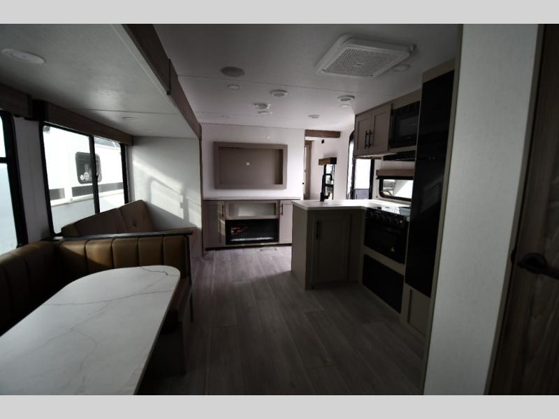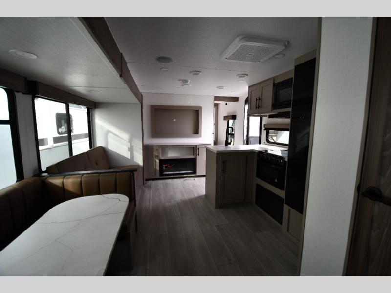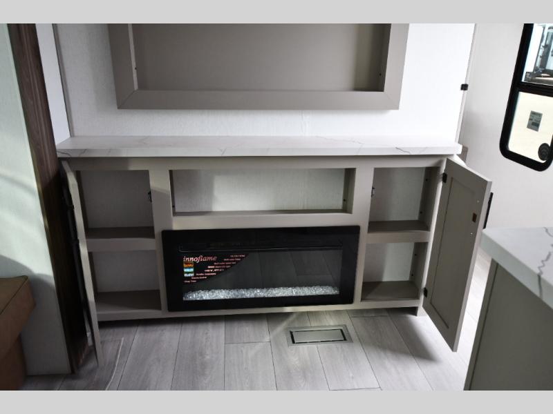 These travel trailer bunk beds are perfect for kids, while the closet provide ample storage space for clothing and essentials. The full bathroom features a linen closet, providing convenient storage for towels and toiletries. The pantry is perfect for storing snacks and ingredients, while the refrigerator keeps your food and drinks fresh, and the sink is conveniently located for meal prep. The U-shaped dinette is a great spot for meals or socializing, while the sofa offers a comfortable spot to relax. The entertainment center with a fireplace is perfect for cozying up on chilly nights. The front bedroom features a spacious queen bed and ample storage space in the wardrobes. Convenience is found in the exterior thanks to the two exterior awnings providing shade and protection from the elements, while the outside kitchen is perfect for outdoor cooking and entertaining