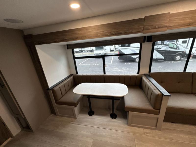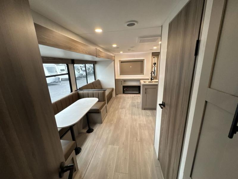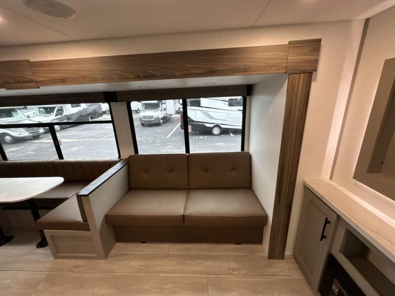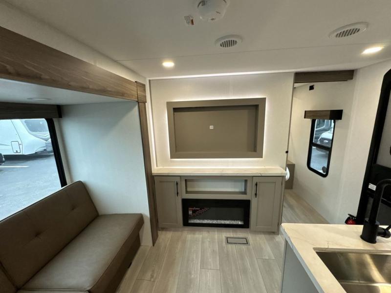 These travel trailer bunk beds are perfect for kids, while the closet provide ample storage space for clothing and essentials. The full bathroom features a linen closet, providing convenient storage for towels and toiletries. The pantry is perfect for storing snacks and ingredients, while the refrigerator keeps your food and drinks fresh, and the sink is conveniently located for meal prep. The U-shaped dinette is a great spot for meals or socializing, while the sofa offers a comfortable spot to relax. The entertainment center with a fireplace is perfect for cozying up on chilly nights. The front bedroom features a spacious queen bed and ample storage space in the wardrobes. Convenience is found in the exterior thanks to the two exterior awnings providing shade and protection from the elements, while the outside kitchen is perfect for outdoor cooking and entertaining