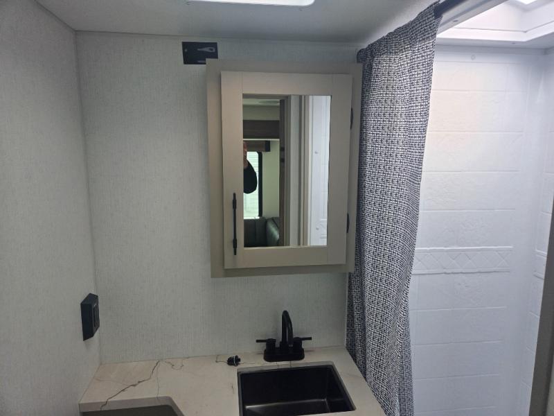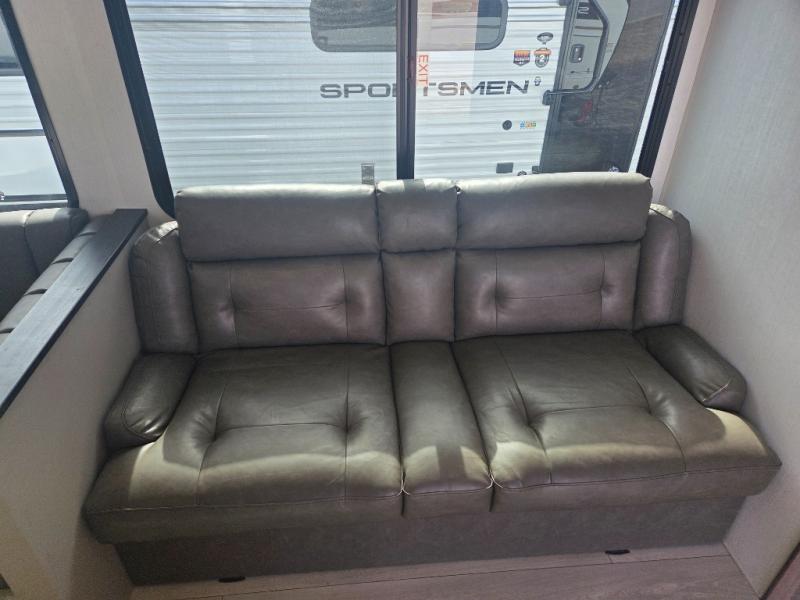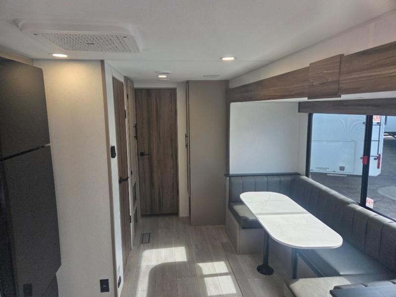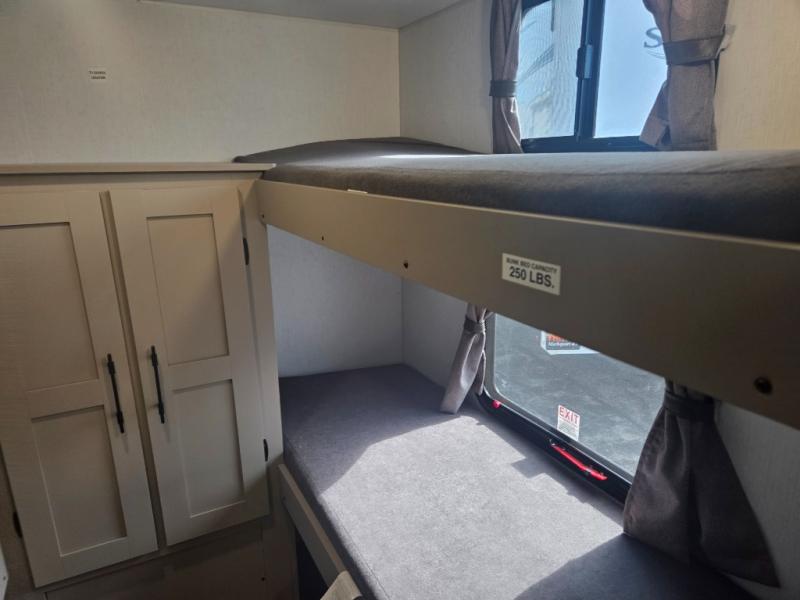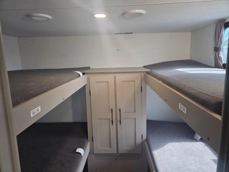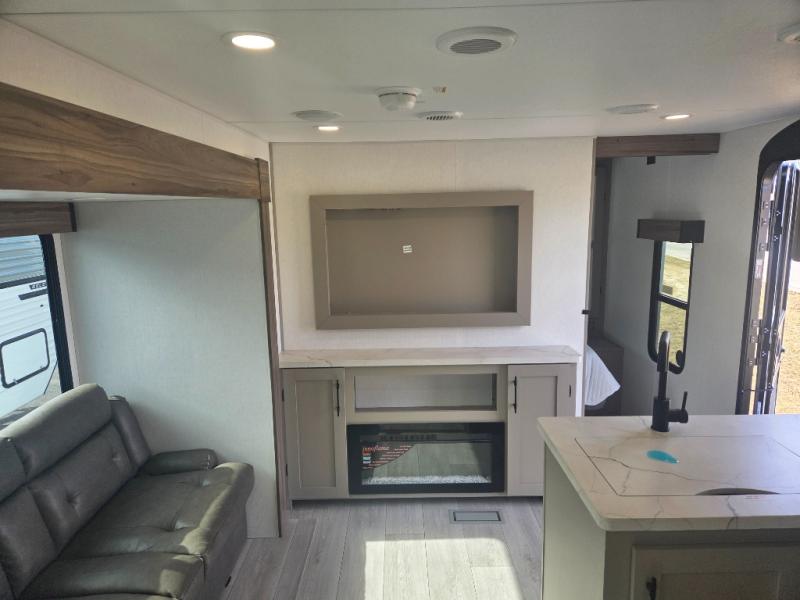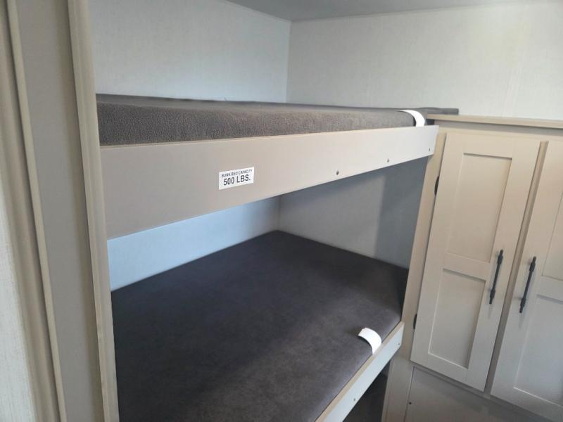 These travel trailer bunk beds are perfect for kids, while the closet provide ample storage space for clothing and essentials. The full bathroom features a linen closet, providing convenient storage for towels and toiletries. The pantry is perfect for storing snacks and ingredients, while the refrigerator keeps your food and drinks fresh, and the sink is conveniently located for meal prep. The U-shaped dinette is a great spot for meals or socializing, while the sofa offers a comfortable spot to relax. The entertainment center with a fireplace is perfect for cozying up on chilly nights. The front bedroom features a spacious queen bed and ample storage space in the wardrobes. Convenience is found in the exterior thanks to the two exterior awnings providing shade and protection from the elements, while the outside kitchen is perfect for outdoor cooking and entertaining