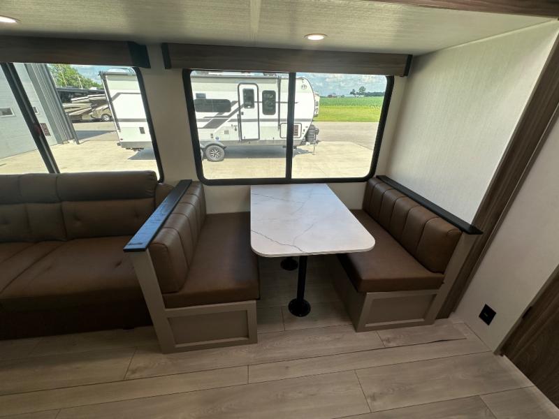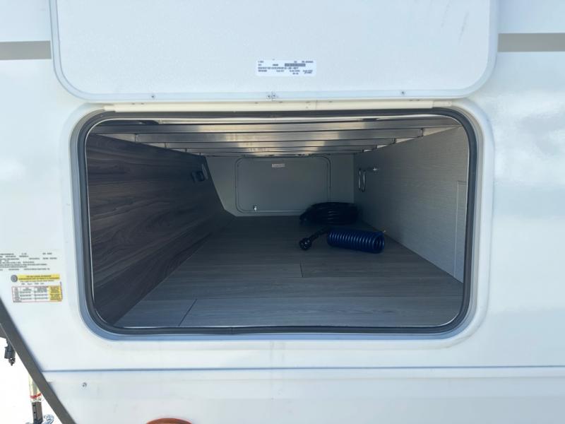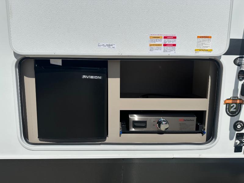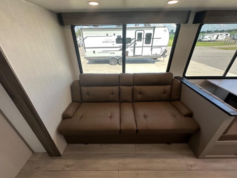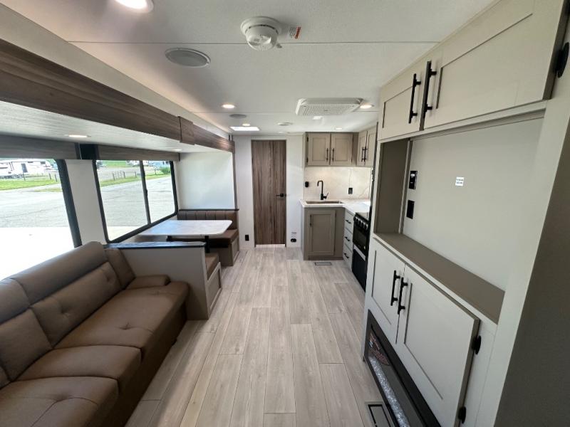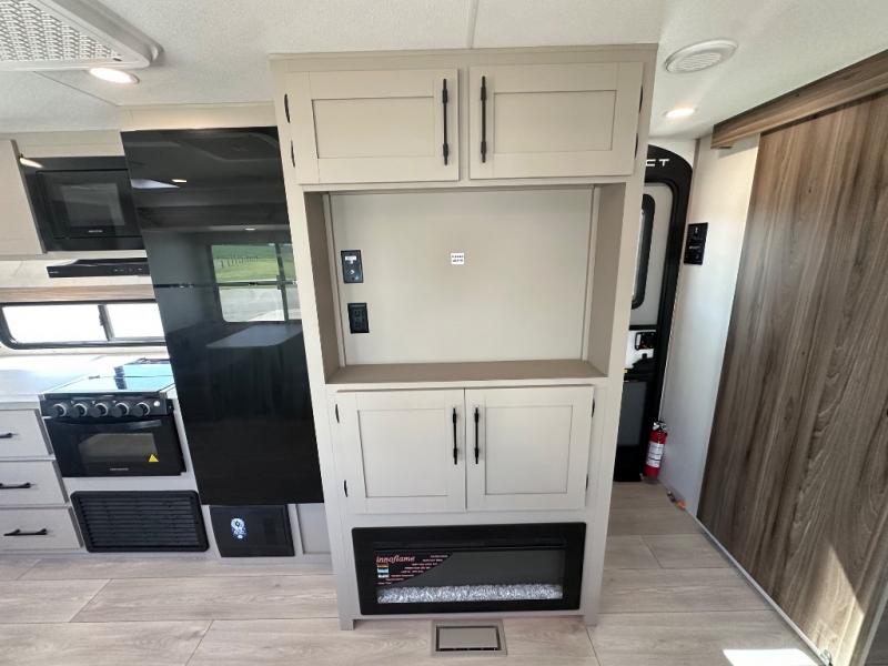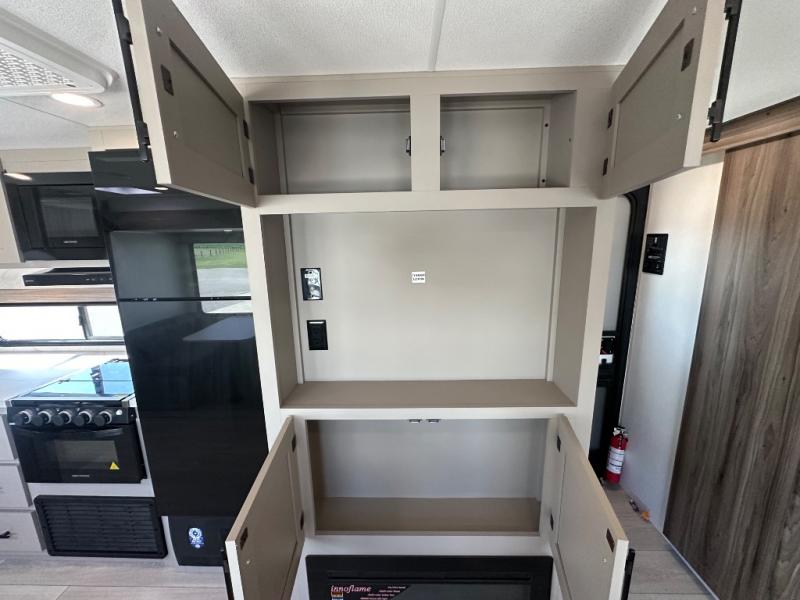 Your family will love this travel trailer. Sleep comfortably with your partner in the amazing queen bed situated in the front room, which has dual wardrobes perfect for storing your clothing. This unit is fitted with a full walk-through bathroom and a half bathroom in the rear part of the trailer, both ideal for refreshing yourself on a hot day. You can relax a little in the 70" sofa equipped with a 34" fireplace in front of it allowing you to enjoy a cozy atmosphere. You can also cook delicious meals in the incredible kitchen, fitted with a microwave, three cooktop burners, a walk-in pantry with coat hooks, a sink, a dinette, and a refrigerator, ideal for cooking any delicious dish. Finally, you will find an outdoor refrigerator and griddle excellent for cooking under the stars with your family, and a pass-through storage perfect for placing your stuff.