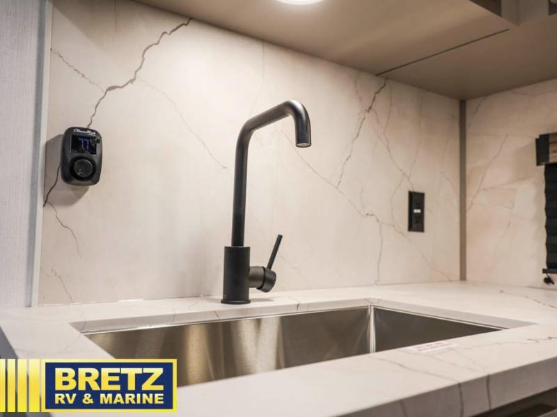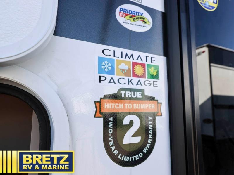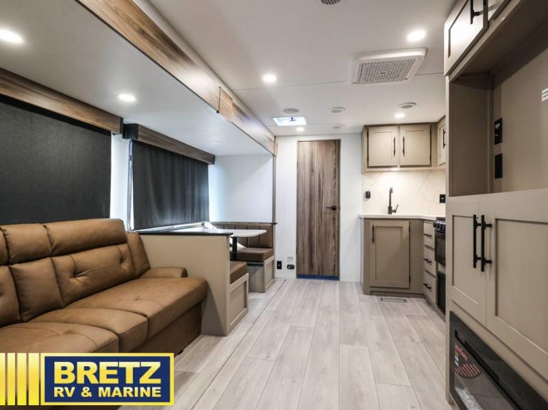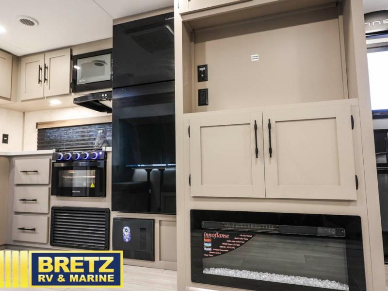 Your family will love this travel trailer. Sleep comfortably with your partner in the amazing queen bed situated in the front room, which has dual wardrobes perfect for storing your clothing. This unit is fitted with a full walk-through bathroom and a half bathroom in the rear part of the trailer, both ideal for refreshing yourself on a hot day. You can relax a little in the 70" sofa equipped with a 34" fireplace in front of it allowing you to enjoy a cozy atmosphere. You can also cook delicious meals in the incredible kitchen, fitted with a microwave, three cooktop burners, a walk-in pantry with coat hooks, a sink, a dinette, and a refrigerator, ideal for cooking any delicious dish. Finally, you will find an outdoor refrigerator and griddle excellent for cooking under the stars with your family, and a pass-through storage perfect for placing your stuff.