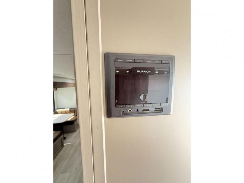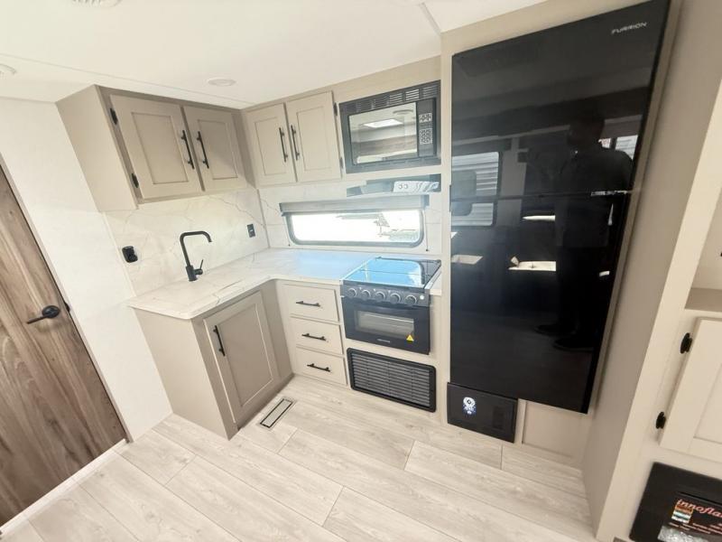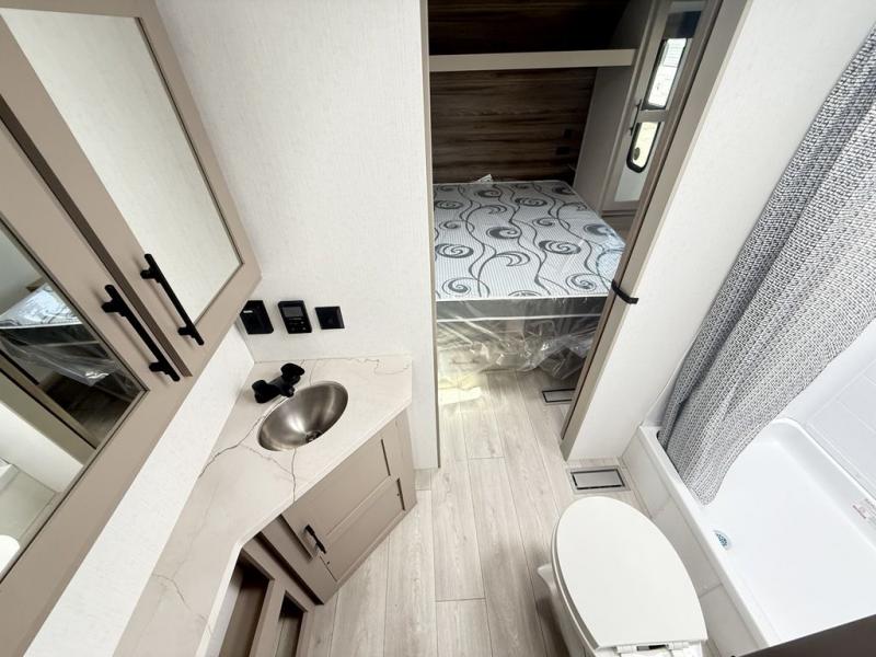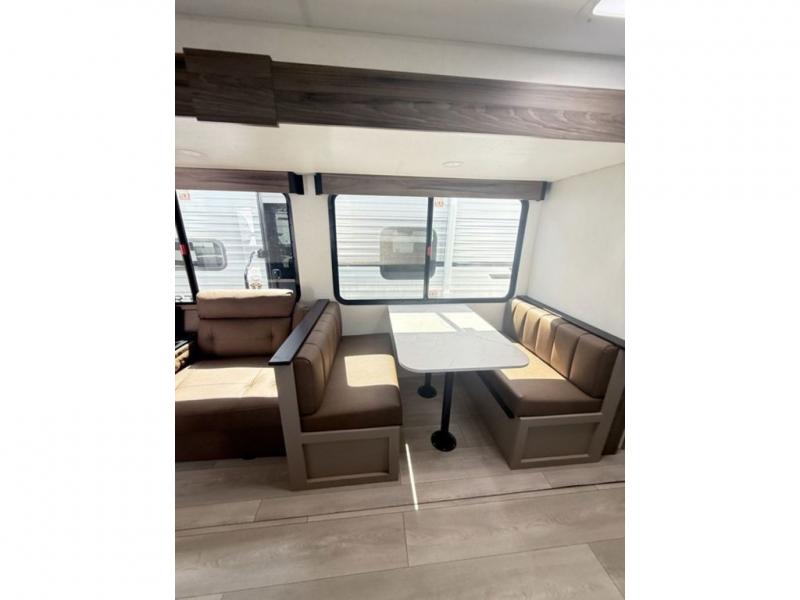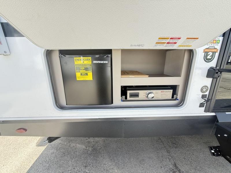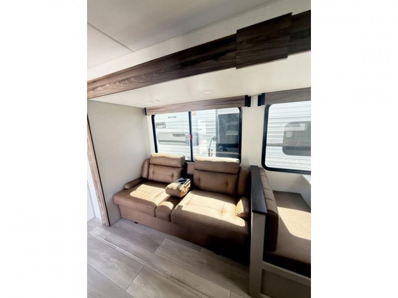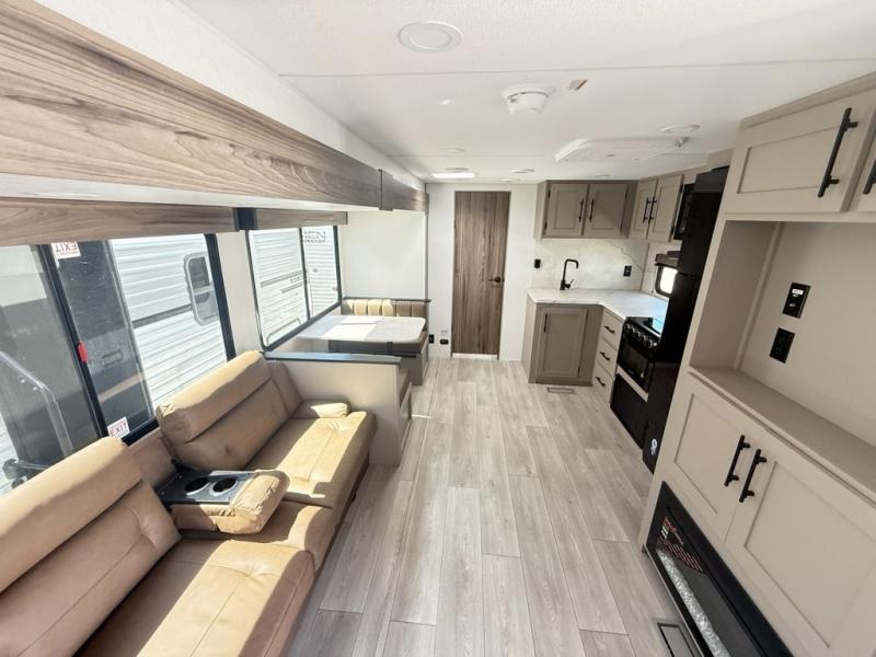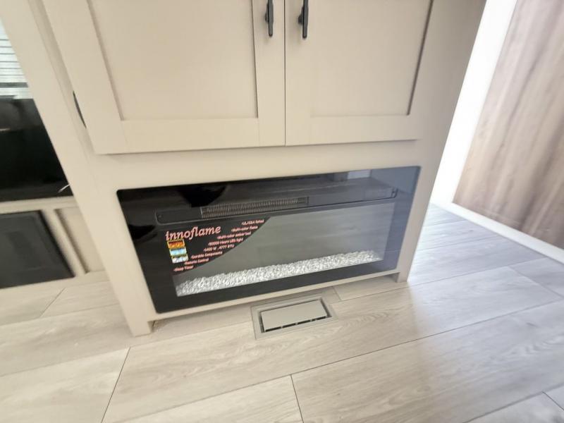 Your family will love this travel trailer. Sleep comfortably with your partner in the amazing queen bed situated in the front room, which has dual wardrobes perfect for storing your clothing. This unit is fitted with a full walk-through bathroom and a half bathroom in the rear part of the trailer, both ideal for refreshing yourself on a hot day. You can relax a little in the 70" sofa equipped with a 34" fireplace in front of it allowing you to enjoy a cozy atmosphere. You can also cook delicious meals in the incredible kitchen, fitted with a microwave, three cooktop burners, a walk-in pantry with coat hooks, a sink, a dinette, and a refrigerator, ideal for cooking any delicious dish. Finally, you will find an outdoor refrigerator and griddle excellent for cooking under the stars with your family, and a pass-through storage perfect for placing your stuff.