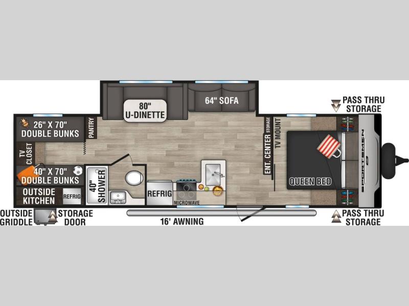 Your family will love this travel trailer. Sleep comfortably with your partner in the amazing queen bed situated in the front room, which has dual wardrobes perfect for storing your clothing. This unit is fitted with a full walk-through bathroom and a half bathroom in the rear part of the trailer, both ideal for refreshing yourself on a hot day. You can relax a little in the 70" sofa equipped with a 34" fireplace in front of it allowing you to enjoy a cozy atmosphere. You can also cook delicious meals in the incredible kitchen, fitted with a microwave, three cooktop burners, a walk-in pantry with coat hooks, a sink, a dinette, and a refrigerator, ideal for cooking any delicious dish. Finally, you will find an outdoor refrigerator and griddle excellent for cooking under the stars with your family, and a pass-through storage perfect for placing your stuff.