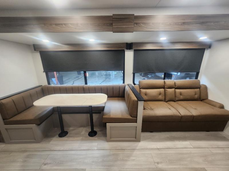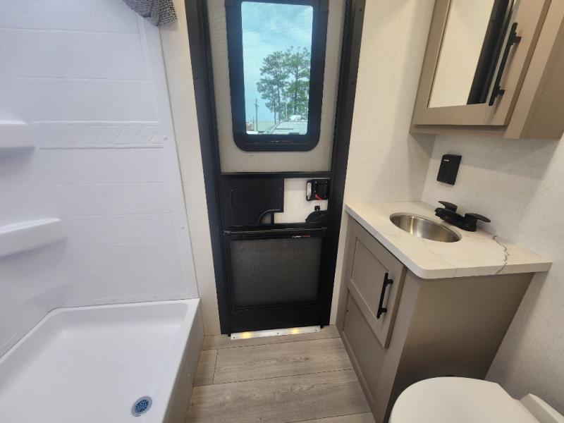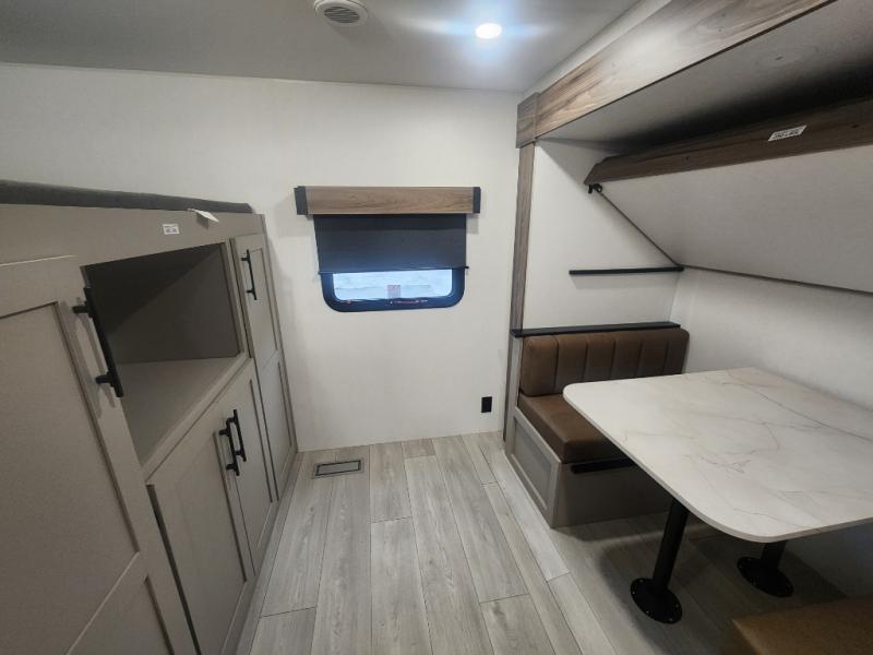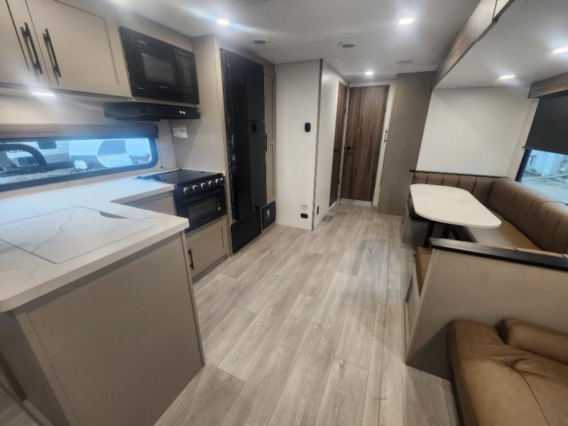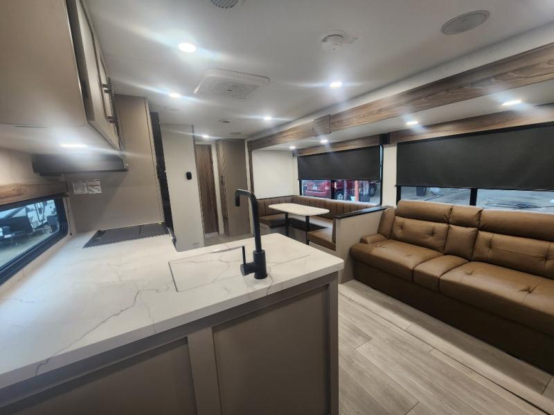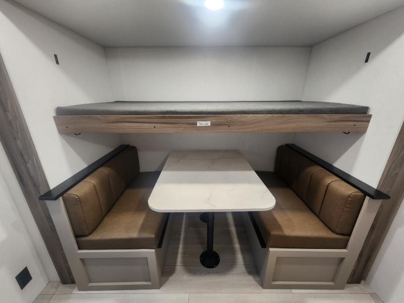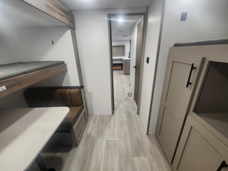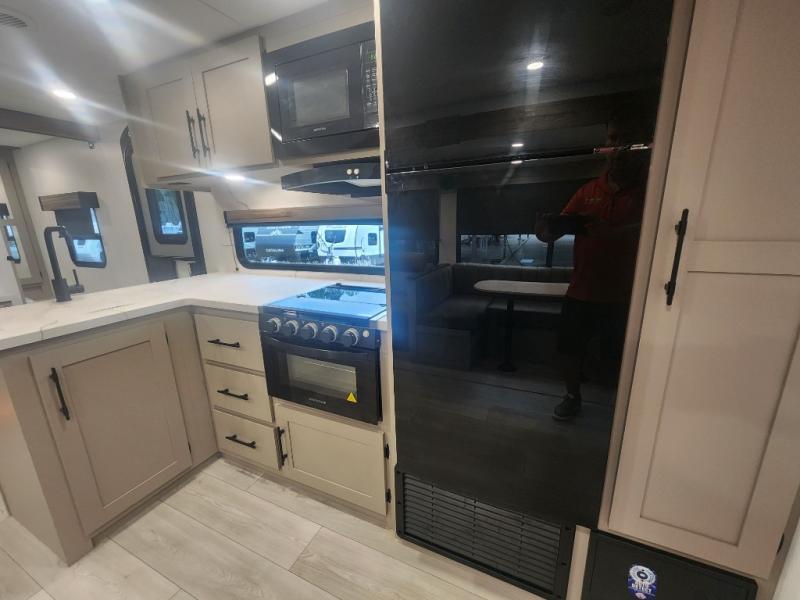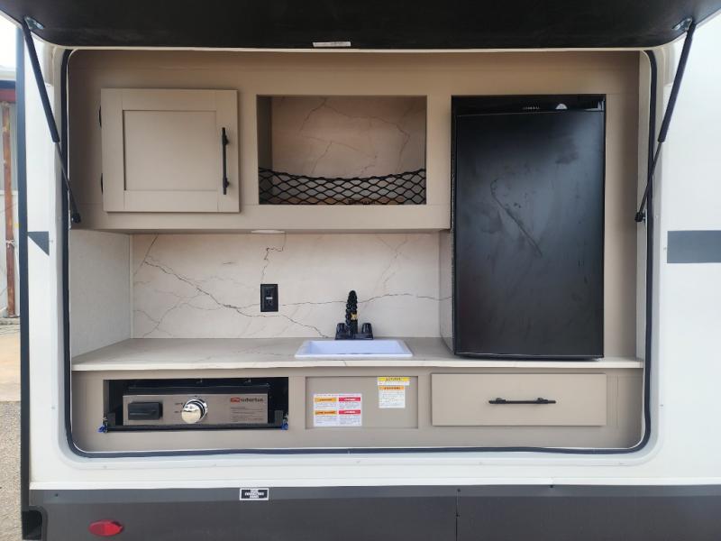 Your kids or your friends will love having their own privacy in the rear bunkhouse which offers two bunks and a dinette to play games or dine at, plus there is a closet for their storage. The full bathroom is conveniently located and includes the second exterior entry for quick and easy access to the fun happening outside. You will have your own private bedroom on the opposite side of the trailer, and it includes a walk-around queen bed, dual wardrobes and a sliding entry door. The main living and kitchen area is spacious with a large slide out, and you can relax on the 64" sofa or the 80" U-shaped dinette while the cook makes meals with full amenities including a 10 cu. ft. 12V refrigerator and a pantry for food storage.
