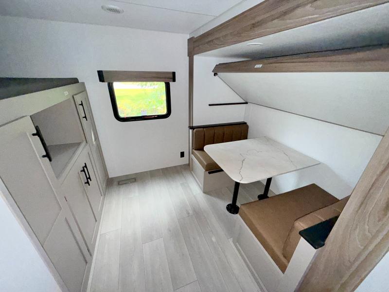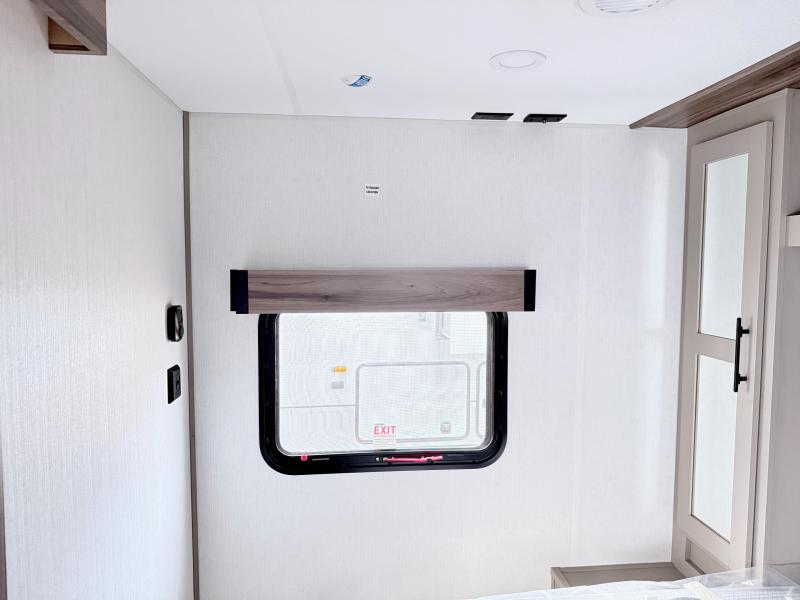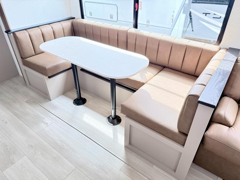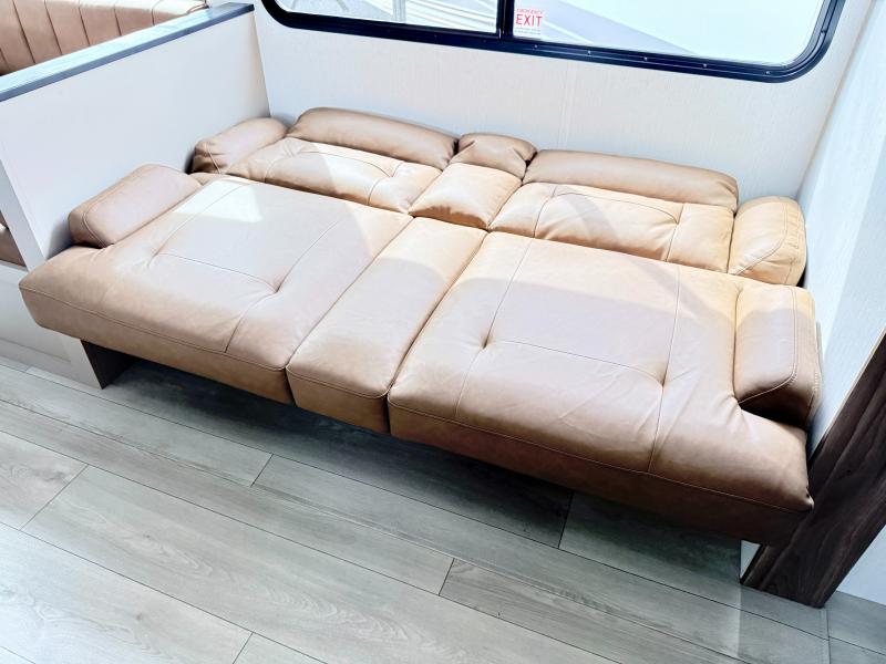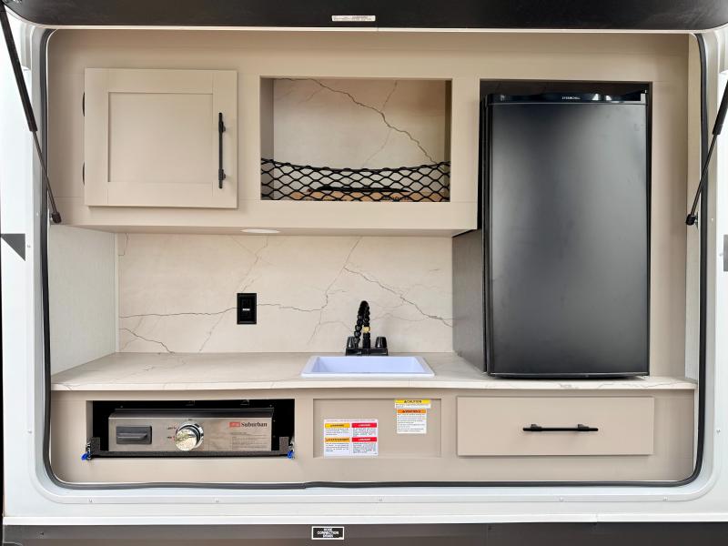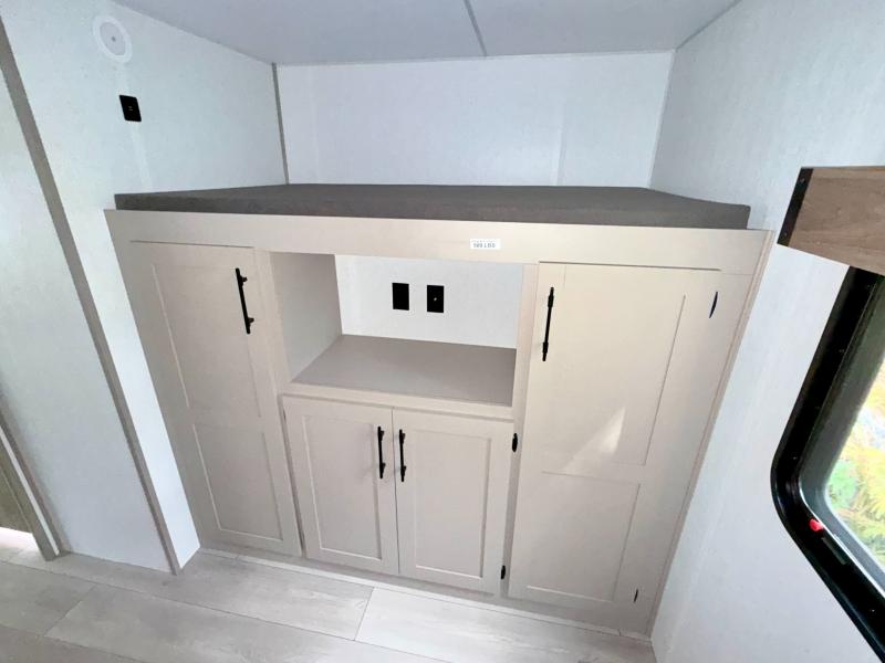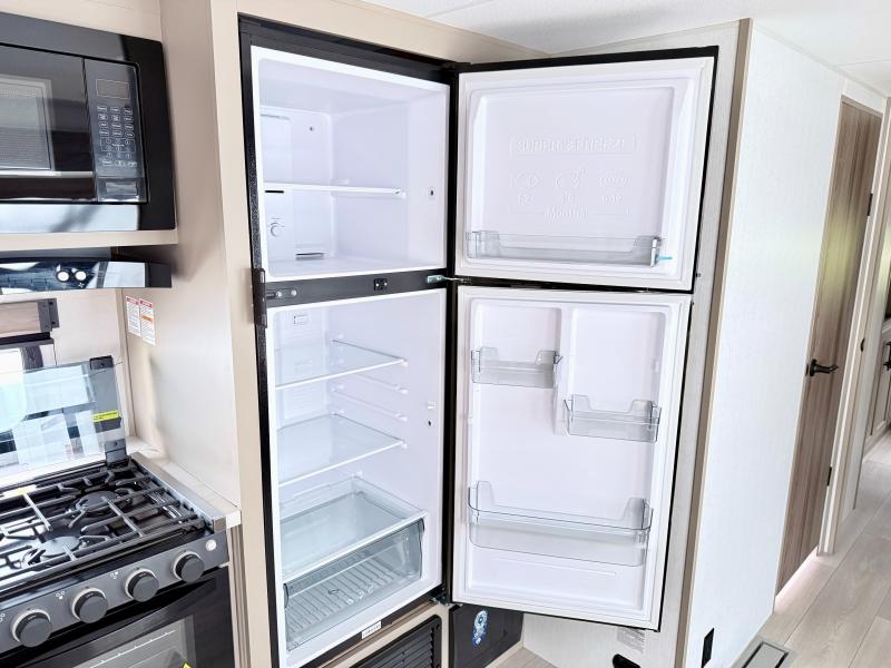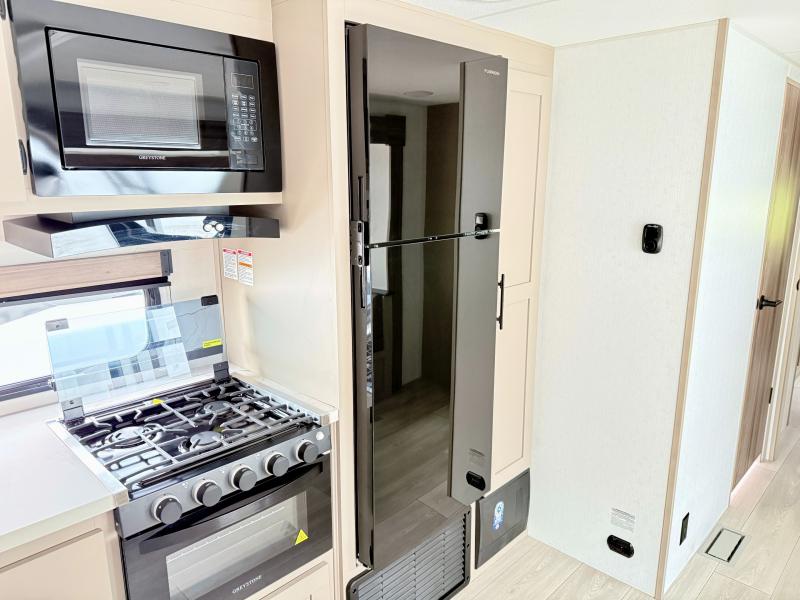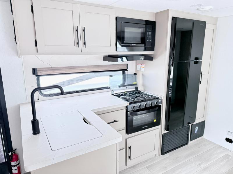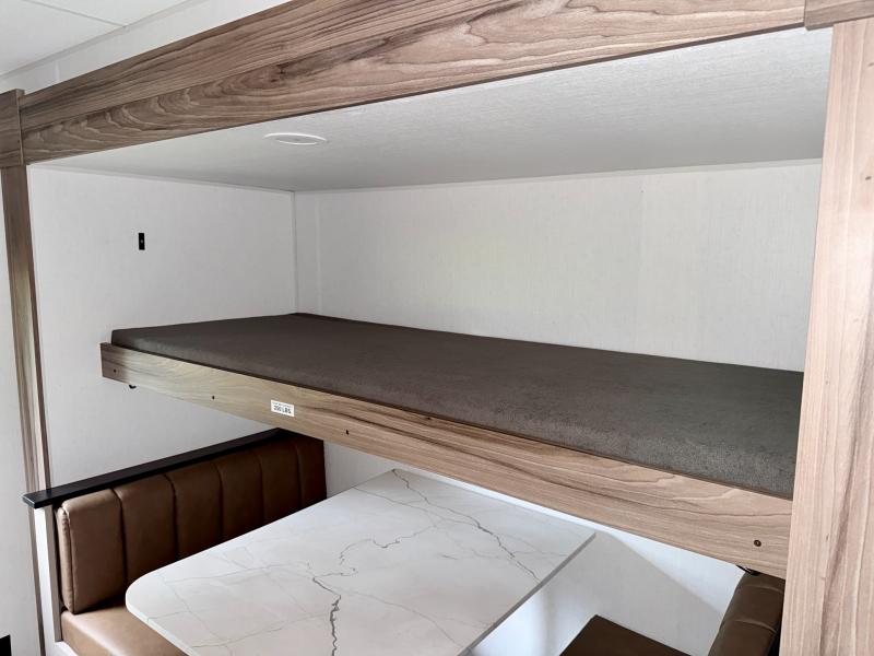Your kids or your friends will love having their own privacy in the rear bunkhouse which offers two bunks and a dinette to play games or dine at, plus there is a closet for their storage. The full bathroom is conveniently located and includes the second exterior entry for quick and easy access to the fun happening outside. You will have your own private bedroom on the opposite side of the trailer, and it includes a walk-around queen bed, dual wardrobes and a sliding entry door. The main living and kitchen area is spacious with a large slide out, and you can relax on the 64" sofa or the 80" U-shaped dinette while the cook makes meals with full amenities including a 10 cu. ft. 12V refrigerator and a pantry for food storage.