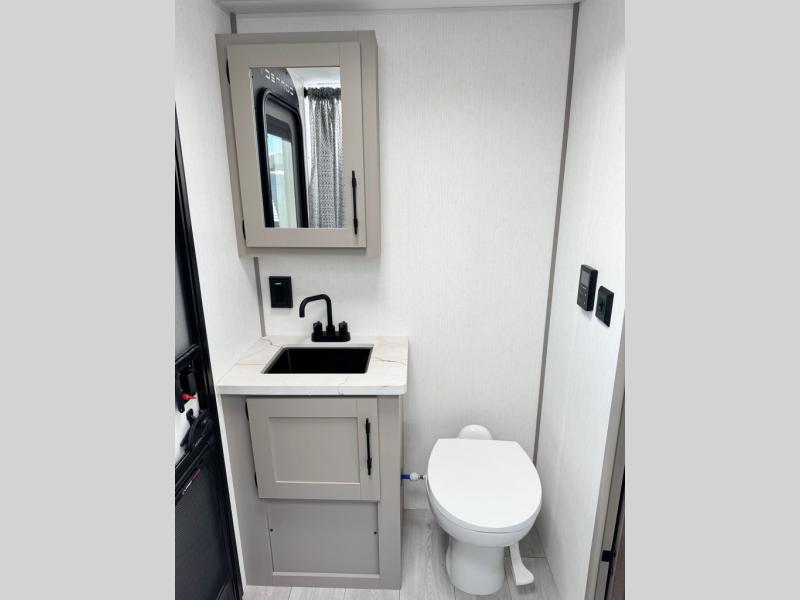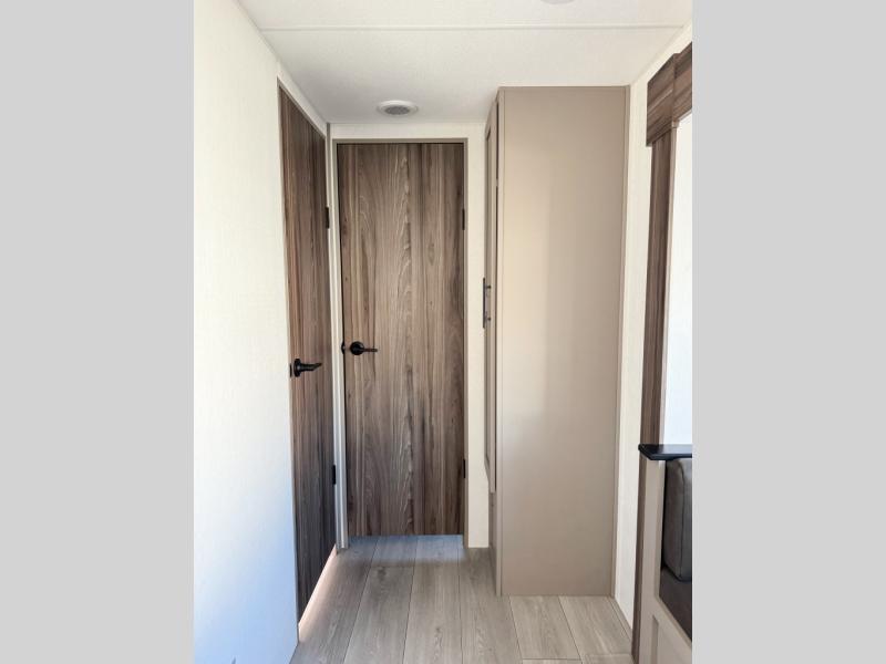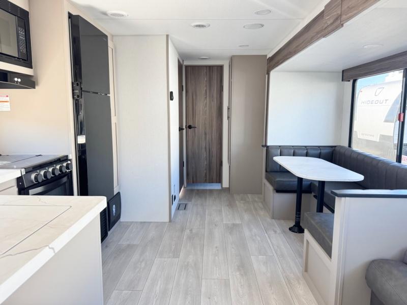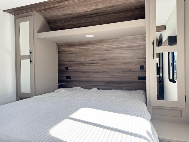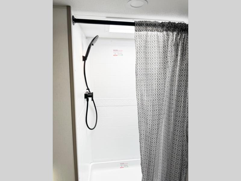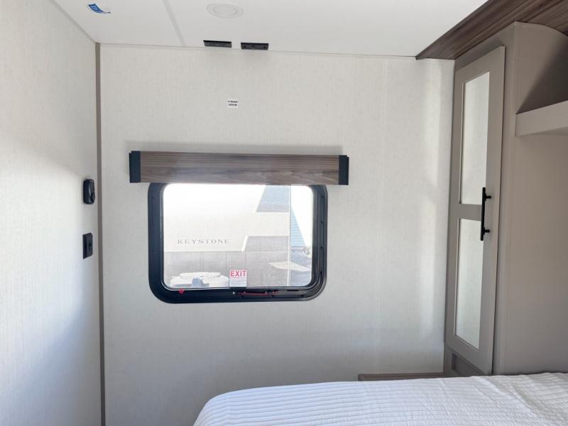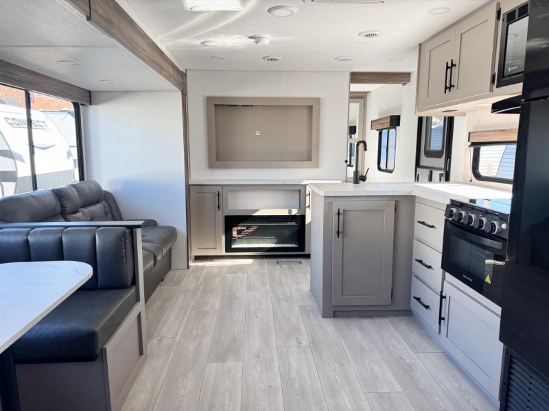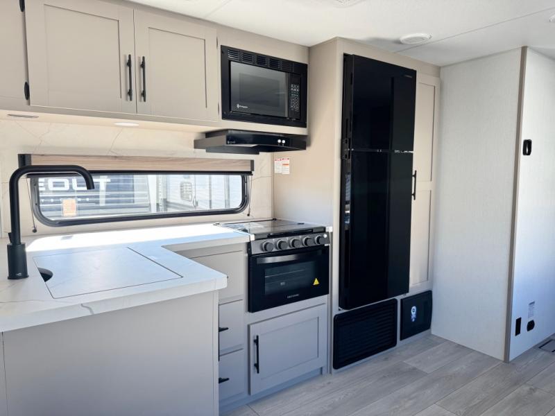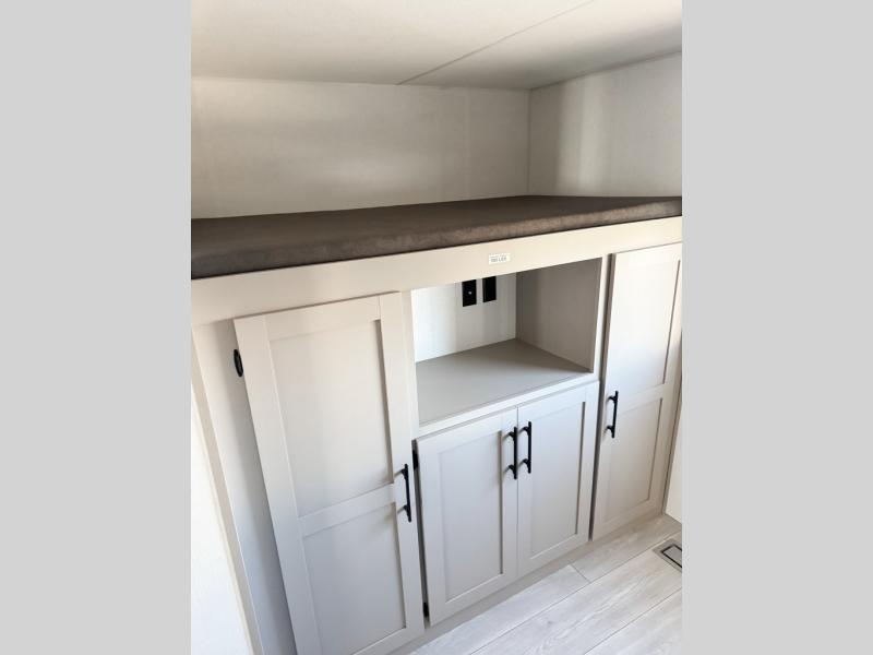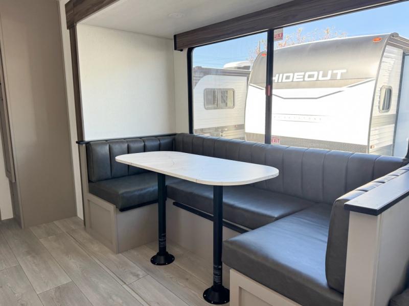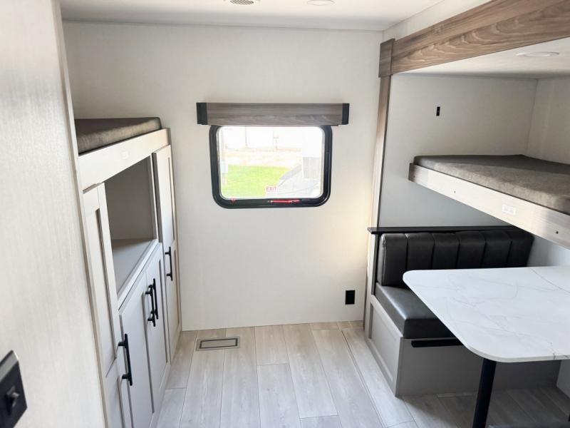 Your kids or your friends will love having their own privacy in the rear bunkhouse which offers two bunks and a dinette to play games or dine at, plus there is a closet for their storage. The full bathroom is conveniently located and includes the second exterior entry for quick and easy access to the fun happening outside. You will have your own private bedroom on the opposite side of the trailer, and it includes a walk-around queen bed, dual wardrobes and a sliding entry door. The main living and kitchen area is spacious with a large slide out, and you can relax on the 64" sofa or the 80" U-shaped dinette while the cook makes meals with full amenities including a 10 cu. ft. 12V refrigerator and a pantry for food storage.