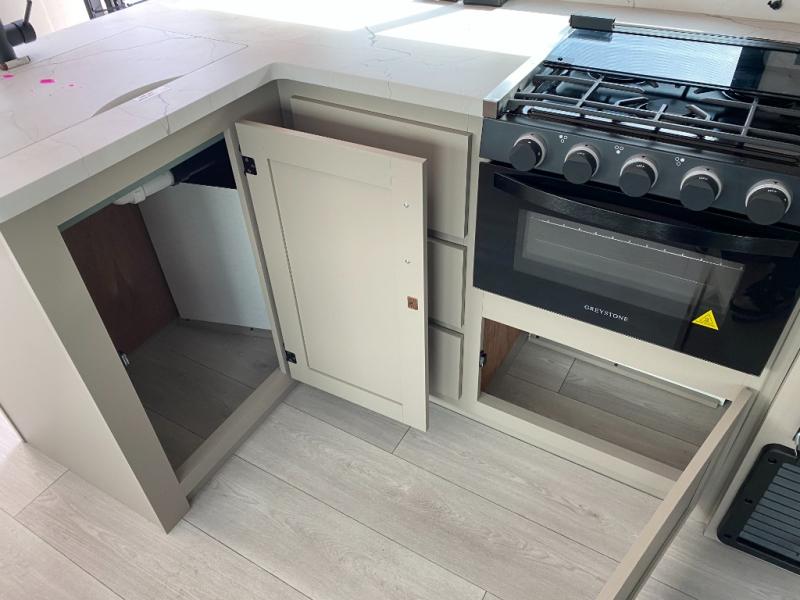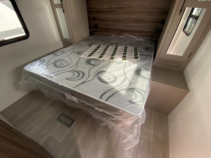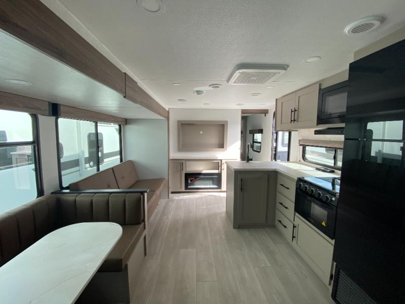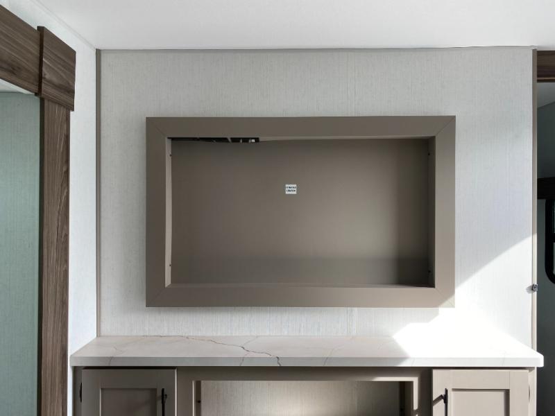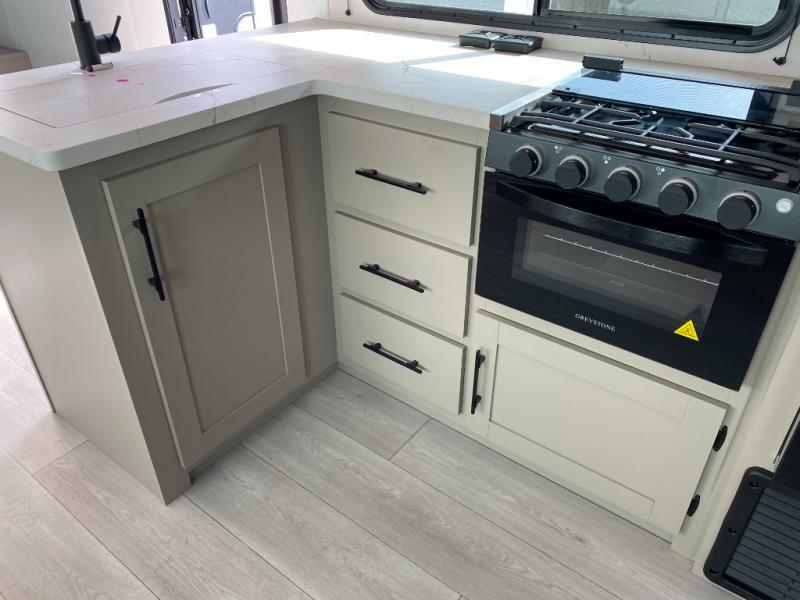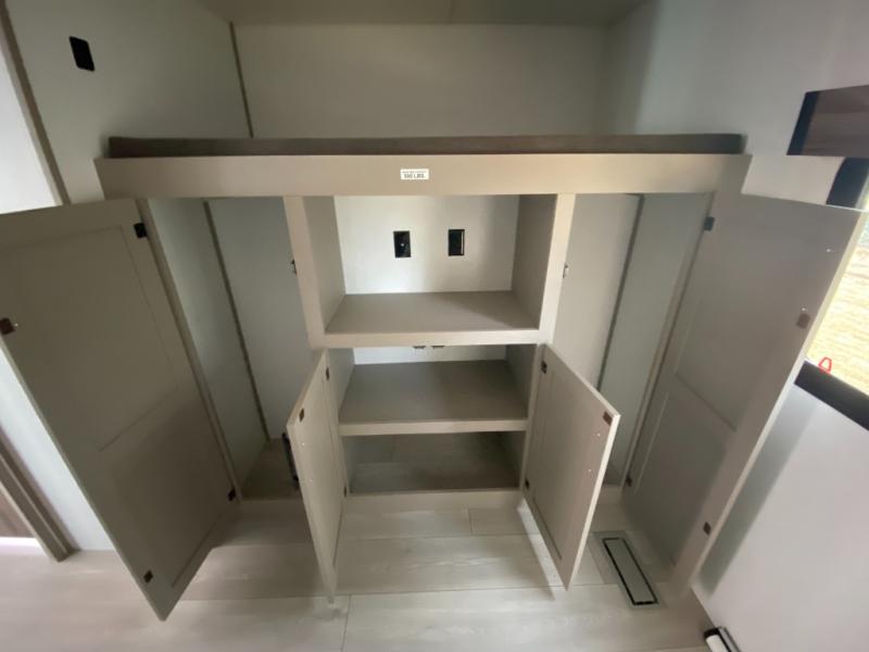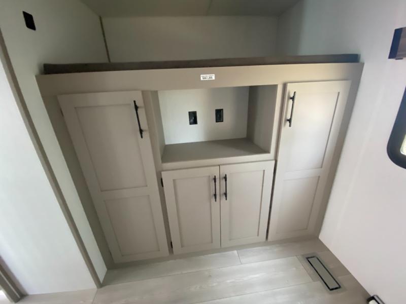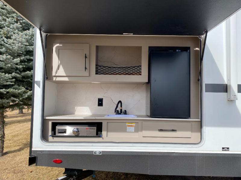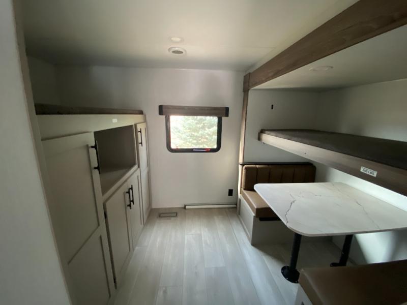 Your kids or your friends will love having their own privacy in the rear bunkhouse which offers two bunks and a dinette to play games or dine at, plus there is a closet for their storage. The full bathroom is conveniently located and includes the second exterior entry for quick and easy access to the fun happening outside. You will have your own private bedroom on the opposite side of the trailer, and it includes a walk-around queen bed, dual wardrobes and a sliding entry door. The main living and kitchen area is spacious with a large slide out, and you can relax on the 64" sofa or the 80" U-shaped dinette while the cook makes meals with full amenities including a 10 cu. ft. 12V refrigerator and a pantry for food storage.