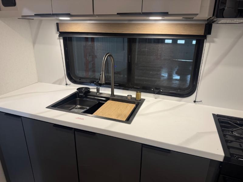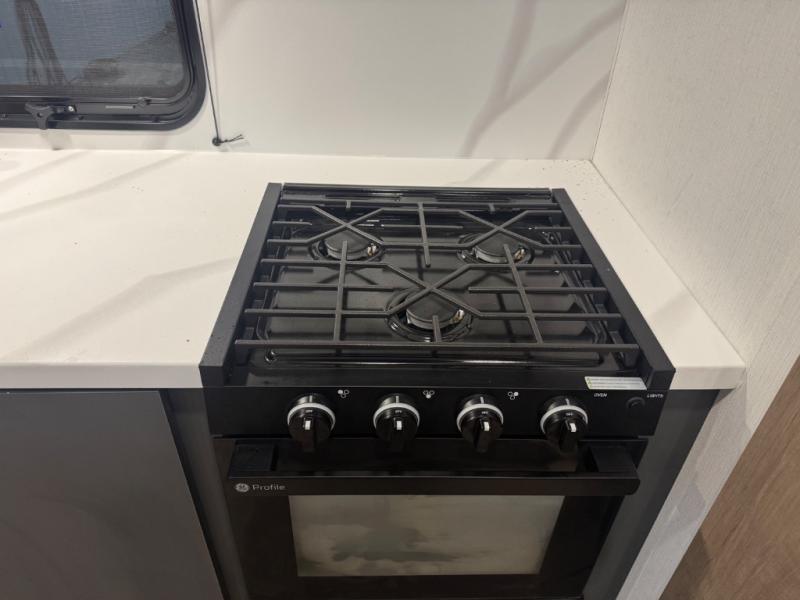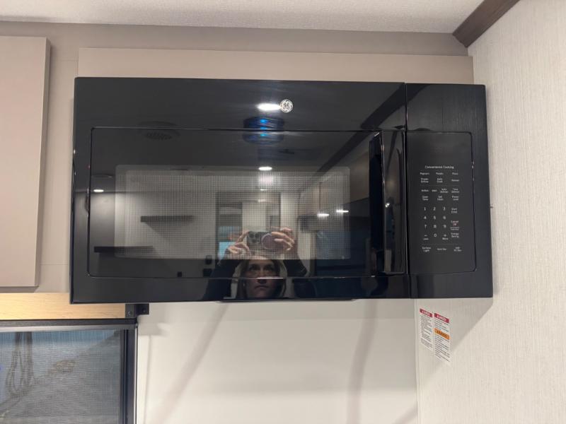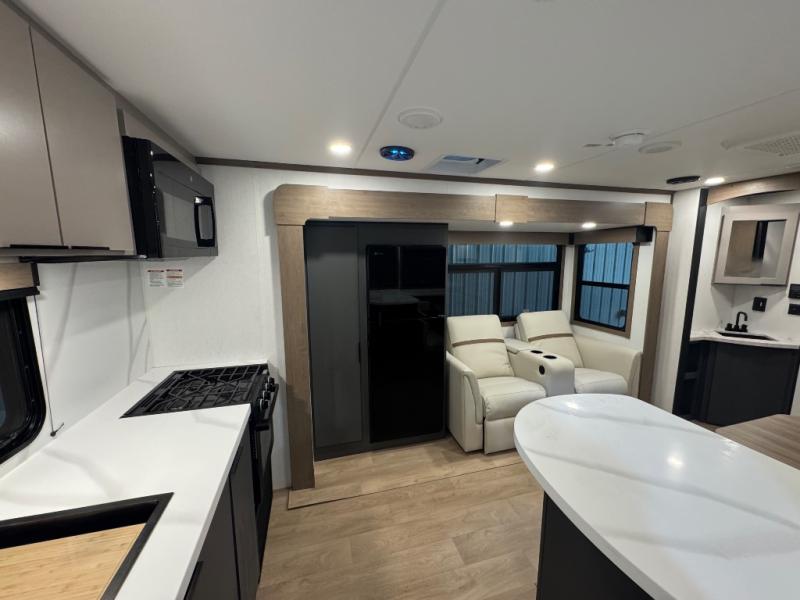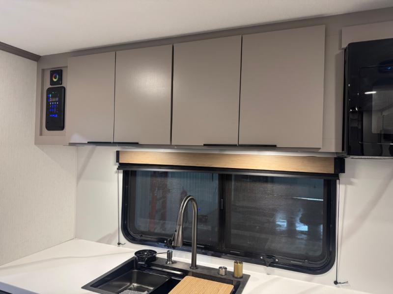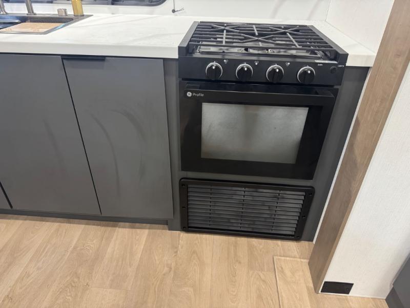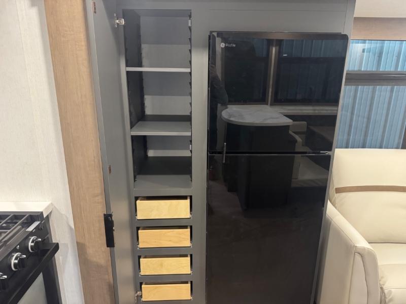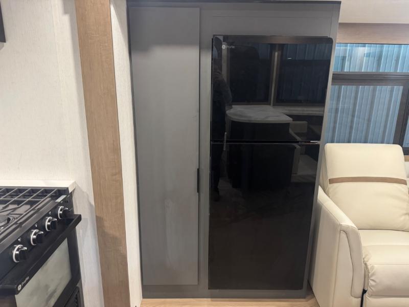 At the front, one of the entry doors leads directly into the private bedroom, where a roomy 70" x 80" king bed ensures a restful night’s sleep, you also have wardrobes on each side for clothing and essentials. Moving towards the back, the full pass-through bathroom offers residential-style comfort with a modern black stainless-steel sink and a generous 30" x 36" shower, allowing you to freshen up without relying on campground facilities. The rear living area features a large slide-out that creates an open, inviting space and houses the pantry along with a 10-cu. ft. 12V GE refrigerator for ample food storage. Relax in the plush 68" theater seating while enjoying your favorite shows on the 50" TV with power lift or gather at the booth dinette for meals and game nights. Near the second entry door, a convenient bar top with a wine cooler adds extra dining and entertaining space. Completing the layout, the rear kitchen spans the full width of the trailer, providing abundant counter space along with a stainless-steel sink, a 21" GE oven with three-burner range, and a microwave for easy meal preparation on the road.