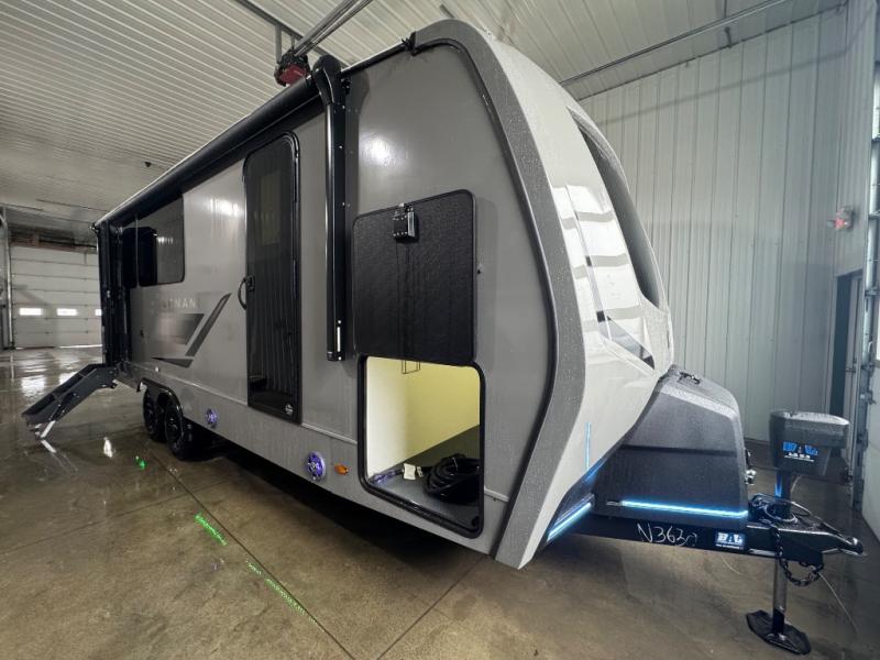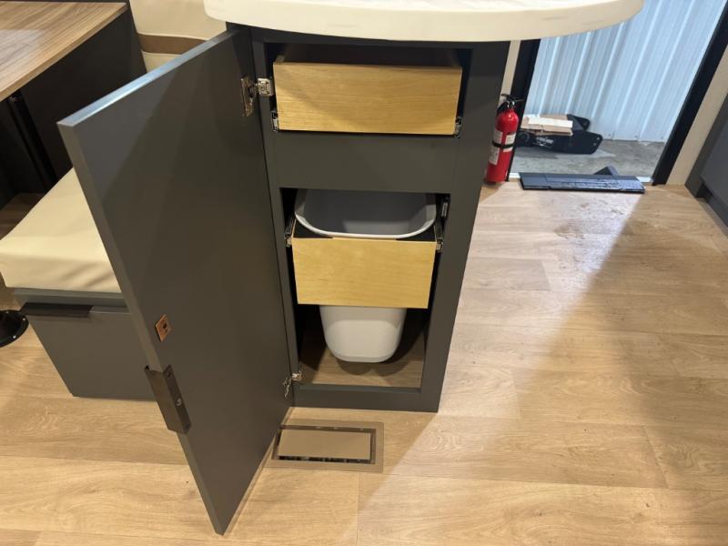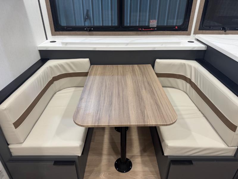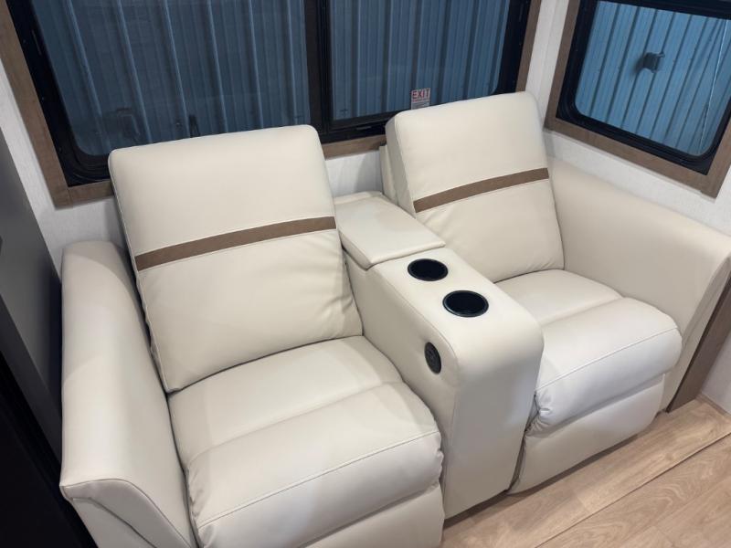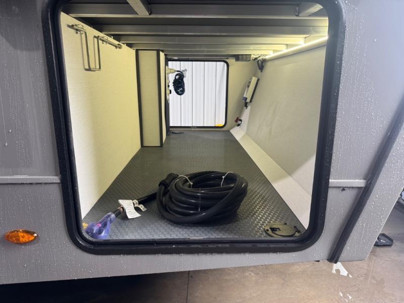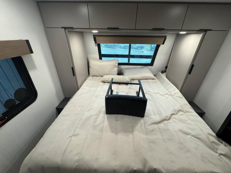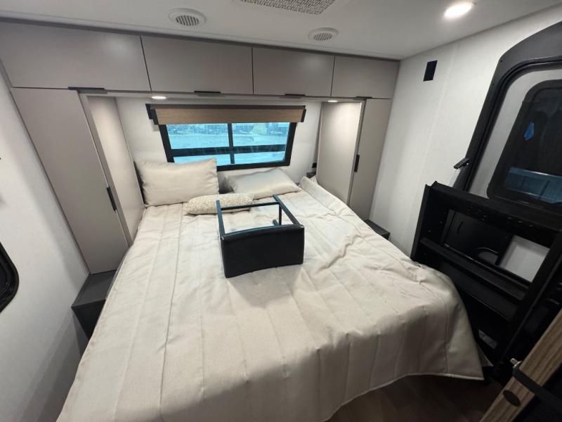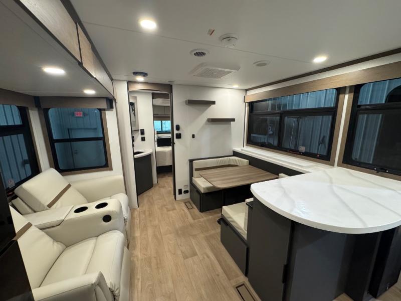 At the front, one of the entry doors leads directly into the private bedroom, where a roomy 70" x 80" king bed ensures a restful night’s sleep, you also have wardrobes on each side for clothing and essentials. Moving towards the back, the full pass-through bathroom offers residential-style comfort with a modern black stainless-steel sink and a generous 30" x 36" shower, allowing you to freshen up without relying on campground facilities. The rear living area features a large slide-out that creates an open, inviting space and houses the pantry along with a 10-cu. ft. 12V GE refrigerator for ample food storage. Relax in the plush 68" theater seating while enjoying your favorite shows on the 50" TV with power lift or gather at the booth dinette for meals and game nights. Near the second entry door, a convenient bar top with a wine cooler adds extra dining and entertaining space. Completing the layout, the rear kitchen spans the full width of the trailer, providing abundant counter space along with a stainless-steel sink, a 21" GE oven with three-burner range, and a microwave for easy meal preparation on the road.