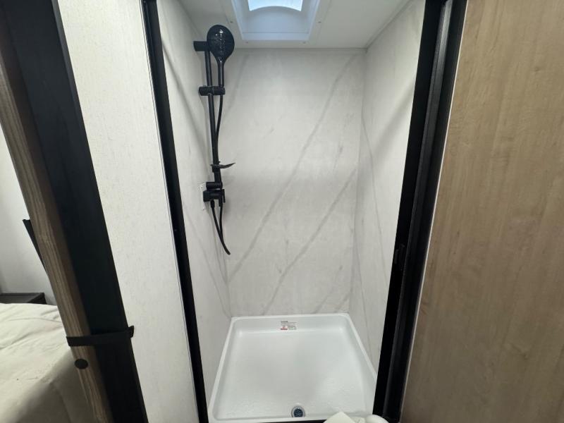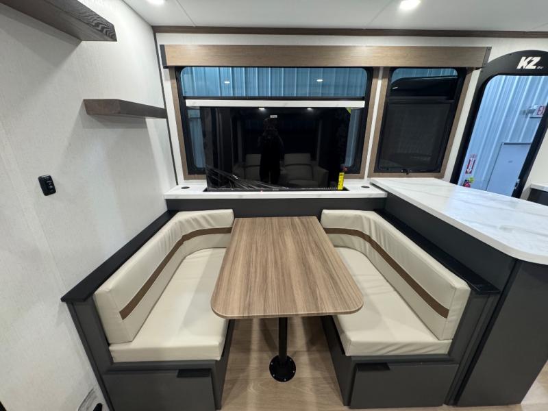 The KZ RV Domani travel trailers are built to deliver comfort and convenience on every trip, this trailer stands out with its durable aluminum framing and laminated sidewalls that provide long-lasting strength and stability. The Climate Insulation Package, featuring a heated, enclosed, and insulated underbelly, allows you to travel confidently in a variety of weather conditions. Inside, the spacious 10 cu. ft. 12V GE refrigerator offers ample room for groceries and extended stays, while the solid surface countertops paired with a deep undermount black stainless steel kitchen sink add a touch of residential-style luxury to your cooking space.