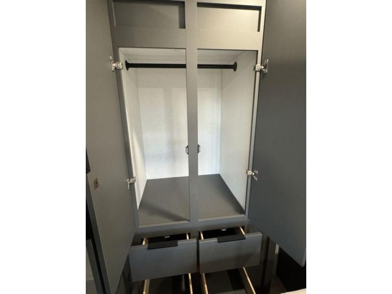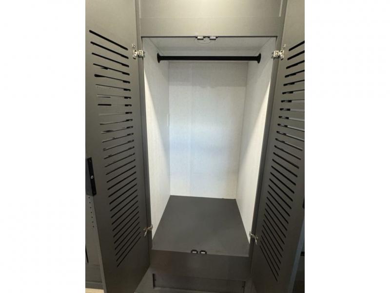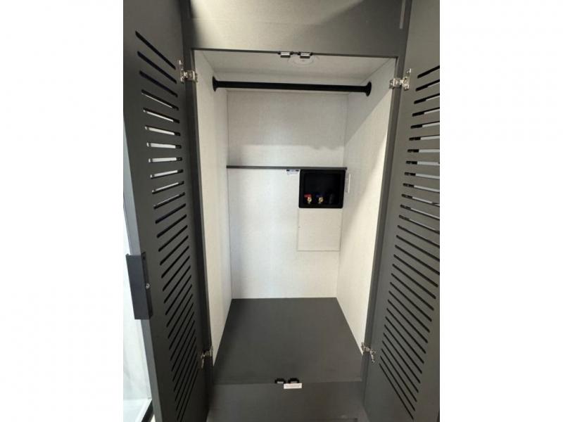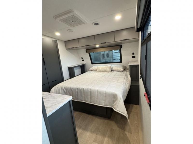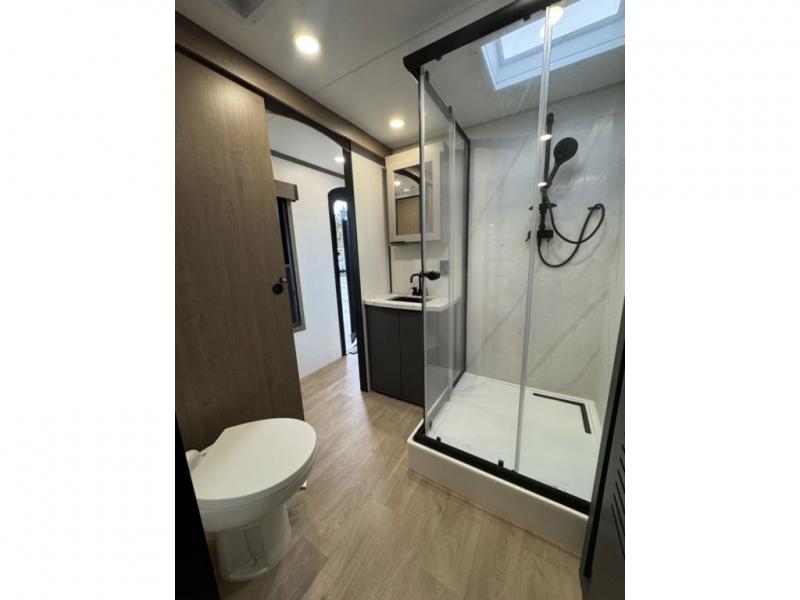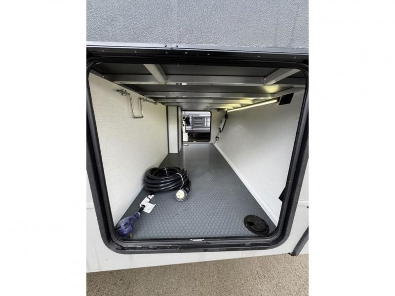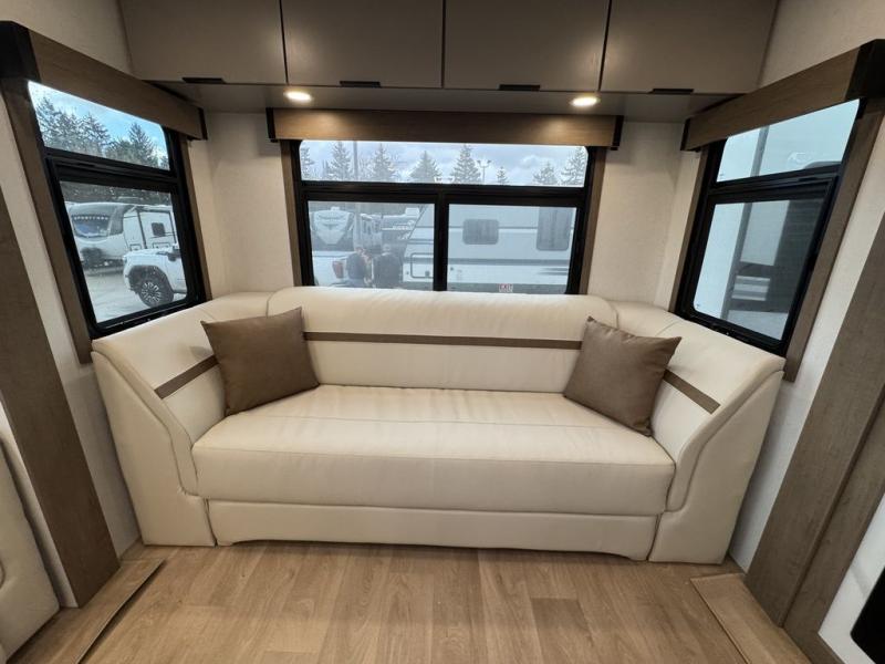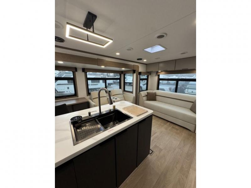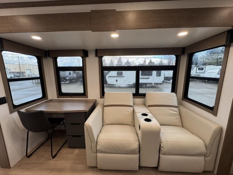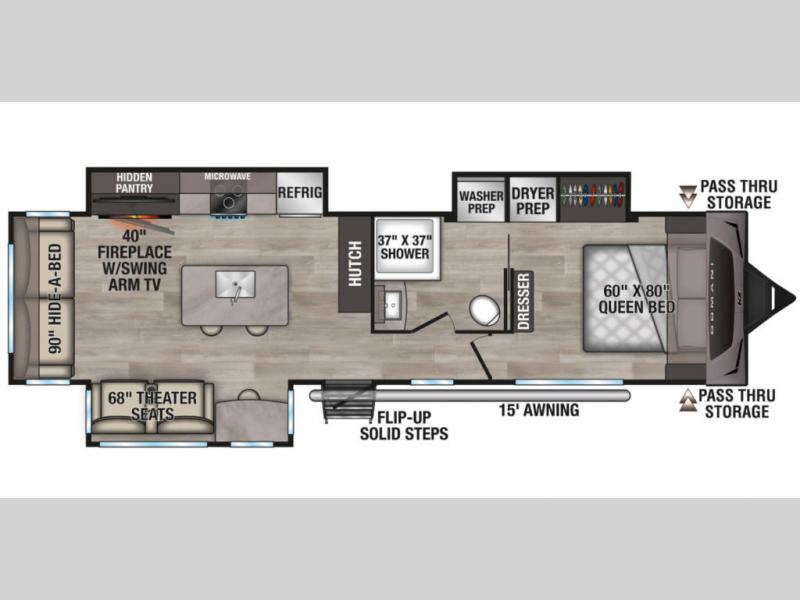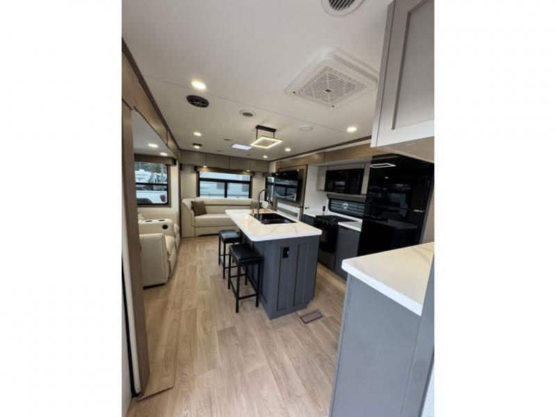 At the front, the private bedroom features a comfortable 60" x 80" queen bed, along with a wardrobe in a slide-out for expanded storage and a dresser across from the bed to keep clothing and essentials neatly organized. Moving down the hallway, you’ll find a full bathroom with a convenient double-entry design and a spacious 37" x 37" shower, allowing you to enjoy the comforts of home without relying on campground facilities. Toward the rear, the kitchen and living area open up with dual opposing slide-outs that create an inviting, open layout. One slide houses the full kitchen, complete with a cozy fireplace, swing-arm TV, a hidden pantry for dry goods, a 21" GE oven with a three-burner range, GE microwave with range hood, and a 10-cu. ft. 12V GE refrigerator. The central kitchen island with sink offers ample prep space and includes seating for casual dining. In the opposite slide, you’ll find a functional desk and 68" theater seating, while the rear features a large 90" hide-a-bed sofa that provides generous seating by day and a comfortable sleeping area for guests at night.