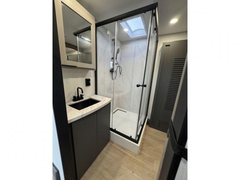 The KZ RV Domani travel trailers are built to deliver comfort and convenience on every trip, this trailer stands out with its durable aluminum framing and laminated sidewalls that provide long-lasting strength and stability. The Climate Insulation Package, featuring a heated, enclosed, and insulated underbelly, allows you to travel confidently in a variety of weather conditions. Inside, the spacious 10 cu. ft. 12V GE refrigerator offers ample room for groceries and extended stays, while the solid surface countertops paired with a deep undermount black stainless steel kitchen sink add a touch of residential-style luxury to your cooking space.