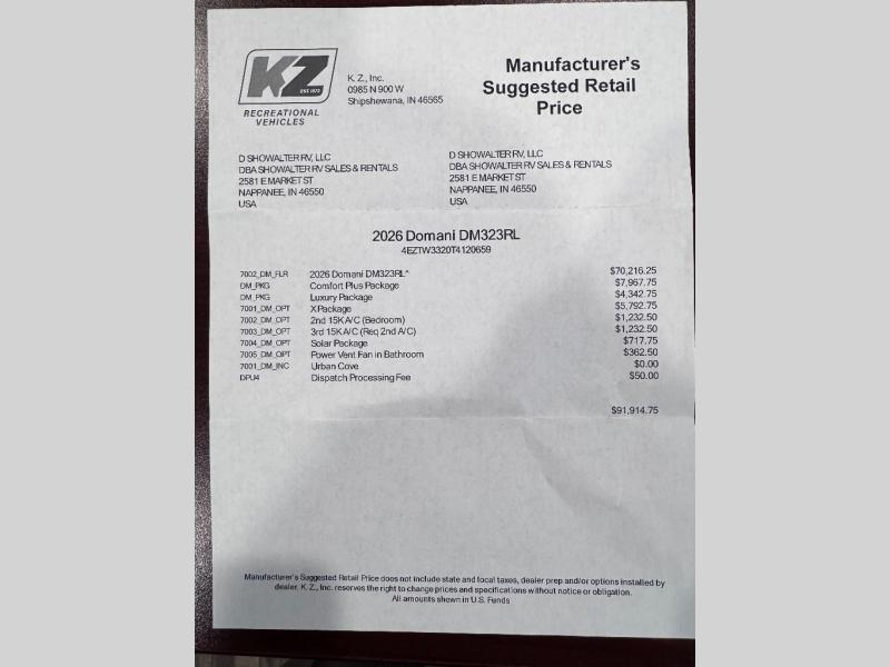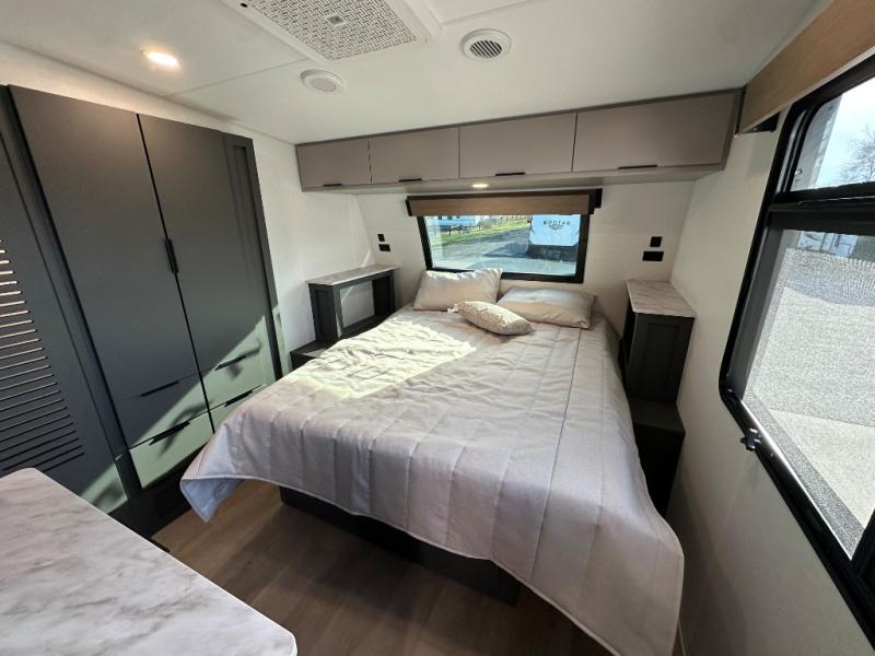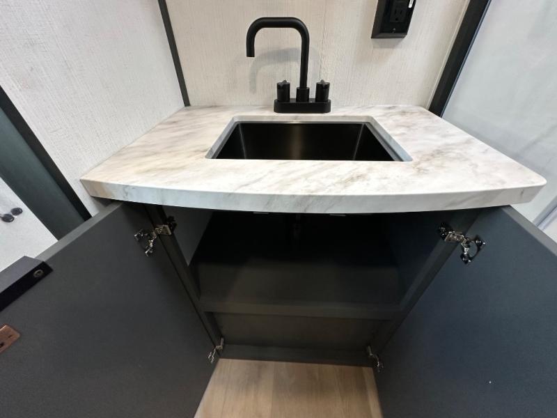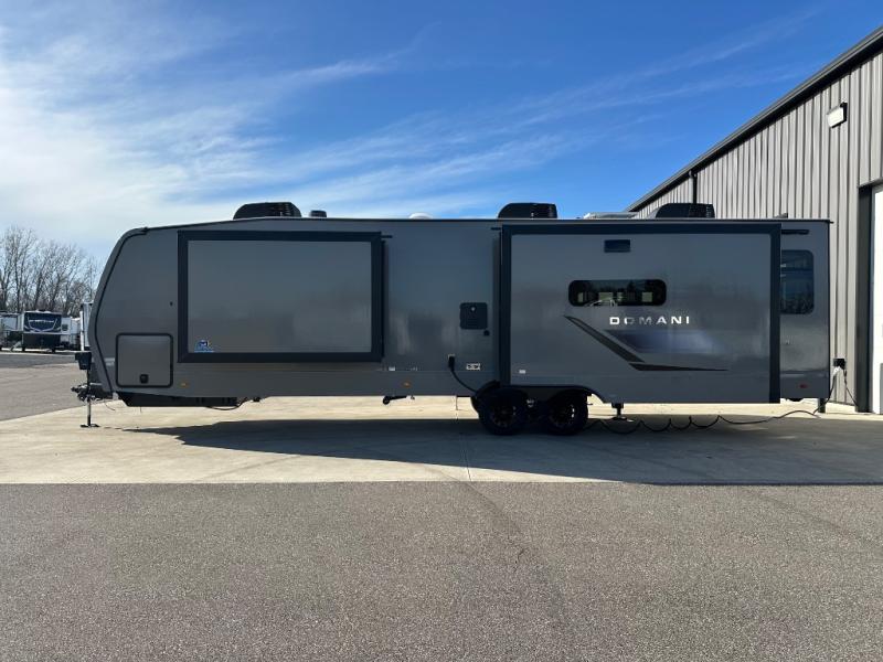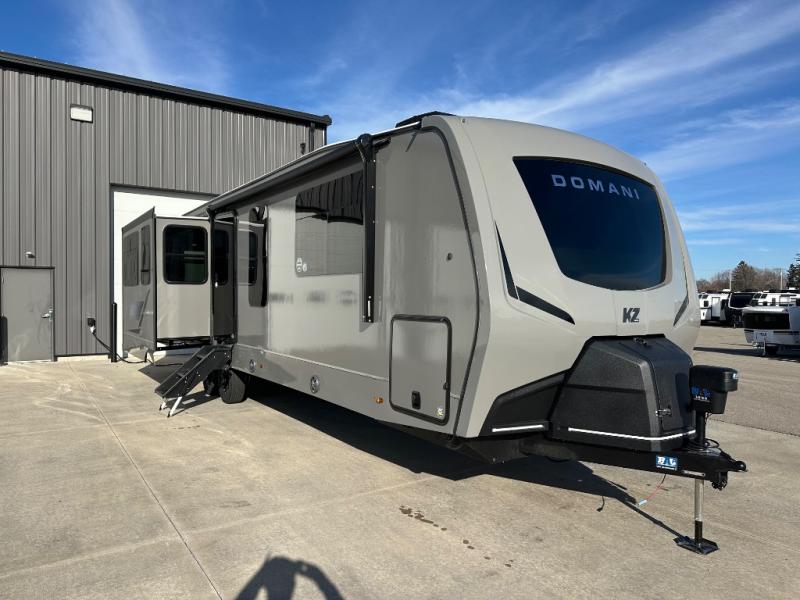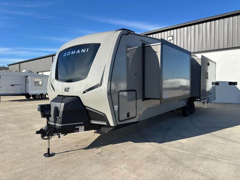 The KZ RV Domani travel trailers are built to deliver comfort and convenience on every trip, this trailer stands out with its durable aluminum framing and laminated sidewalls that provide long-lasting strength and stability. The Climate Insulation Package, featuring a heated, enclosed, and insulated underbelly, allows you to travel confidently in a variety of weather conditions. Inside, the spacious 10 cu. ft. 12V GE refrigerator offers ample room for groceries and extended stays, while the solid surface countertops paired with a deep undermount black stainless steel kitchen sink add a touch of residential-style luxury to your cooking space.