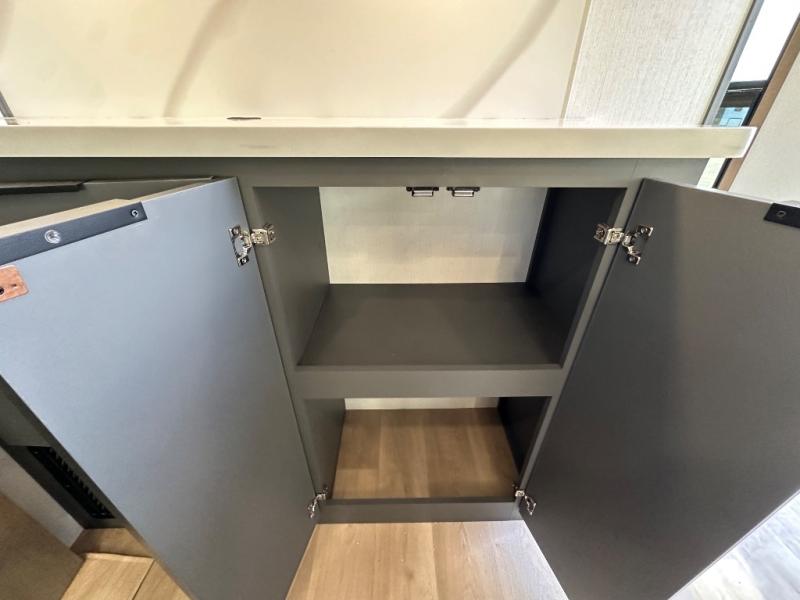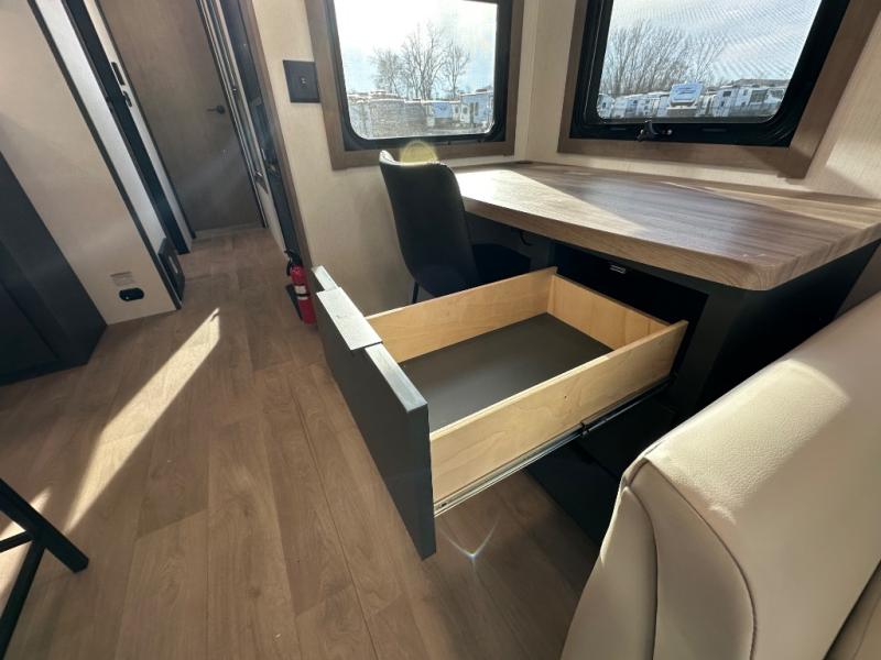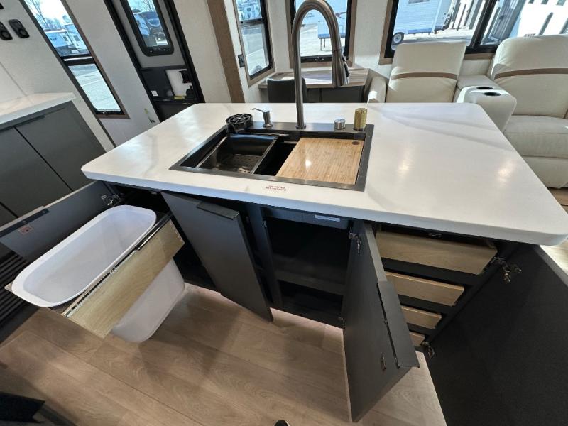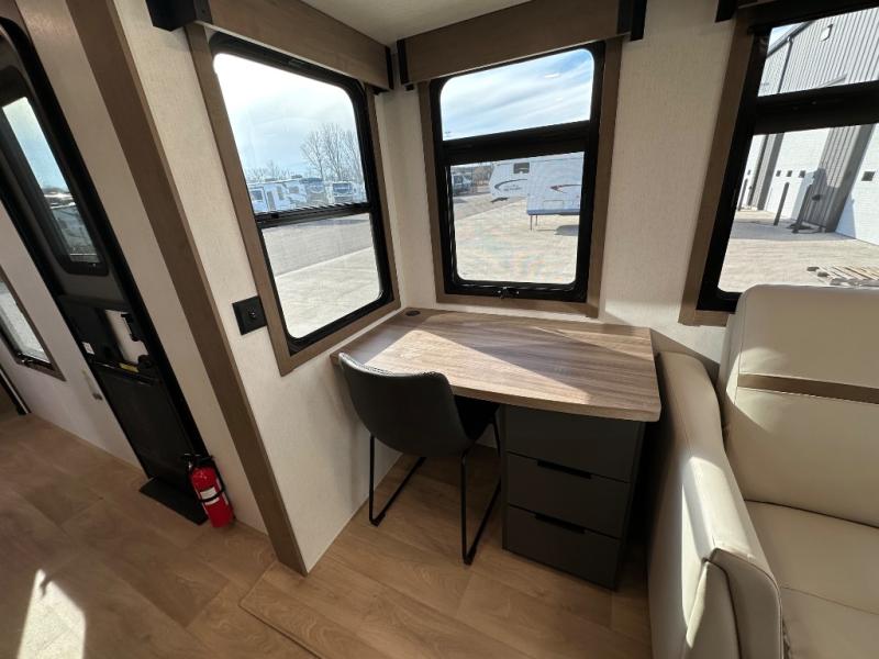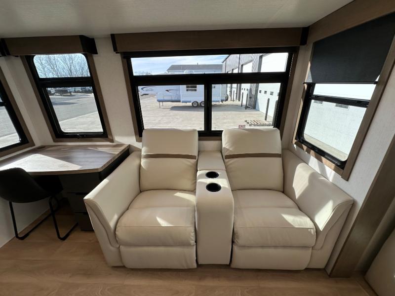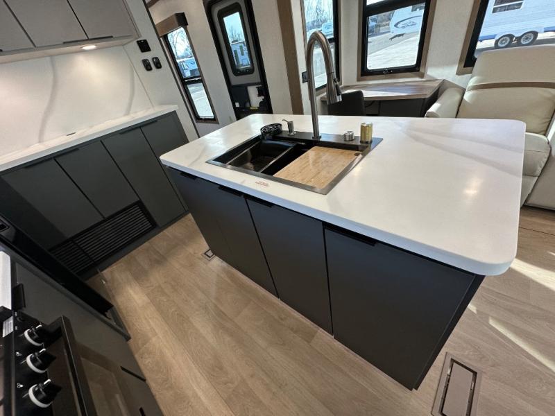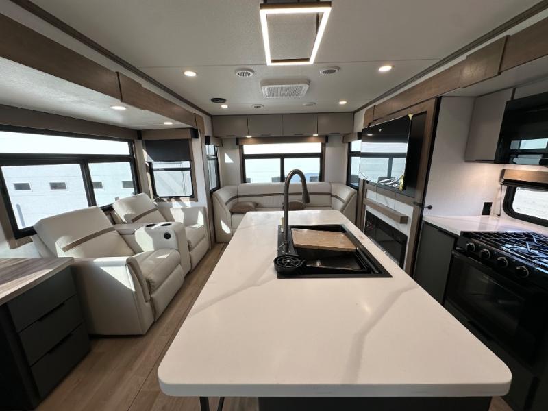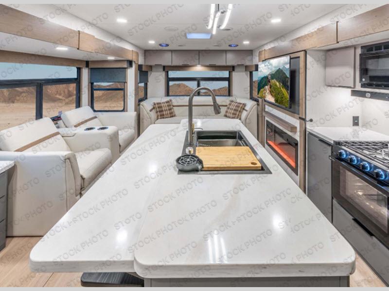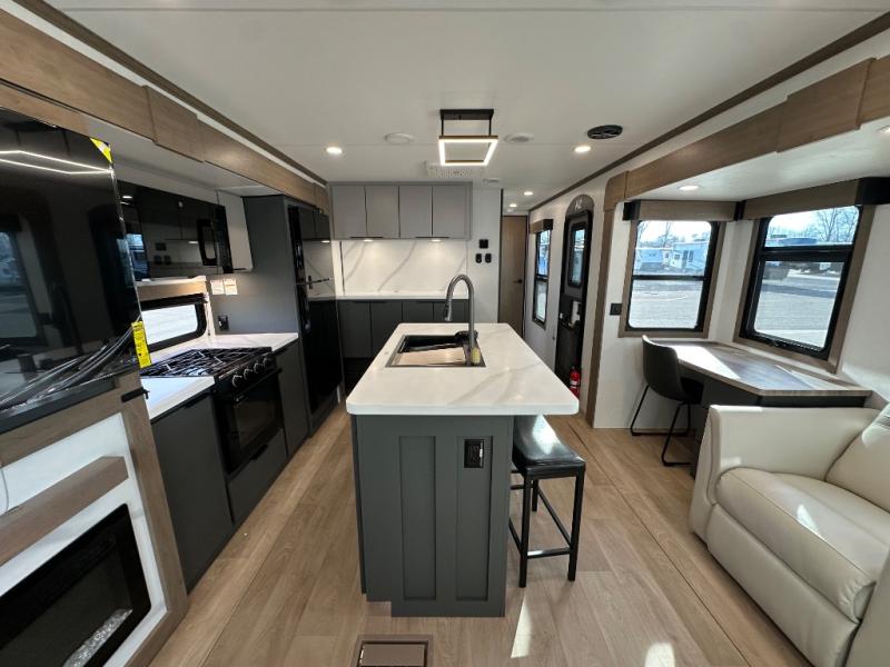 At the front, the private bedroom features a comfortable 60" x 80" queen bed, along with a wardrobe in a slide-out for expanded storage and a dresser across from the bed to keep clothing and essentials neatly organized. Moving down the hallway, you’ll find a full bathroom with a convenient double-entry design and a spacious 37" x 37" shower, allowing you to enjoy the comforts of home without relying on campground facilities. Toward the rear, the kitchen and living area open up with dual opposing slide-outs that create an inviting, open layout. One slide houses the full kitchen, complete with a cozy fireplace, swing-arm TV, a hidden pantry for dry goods, a 21" GE oven with a three-burner range, GE microwave with range hood, and a 10-cu. ft. 12V GE refrigerator. The central kitchen island with sink offers ample prep space and includes seating for casual dining. In the opposite slide, you’ll find a functional desk and 68" theater seating, while the rear features a large 90" hide-a-bed sofa that provides generous seating by day and a comfortable sleeping area for guests at night.