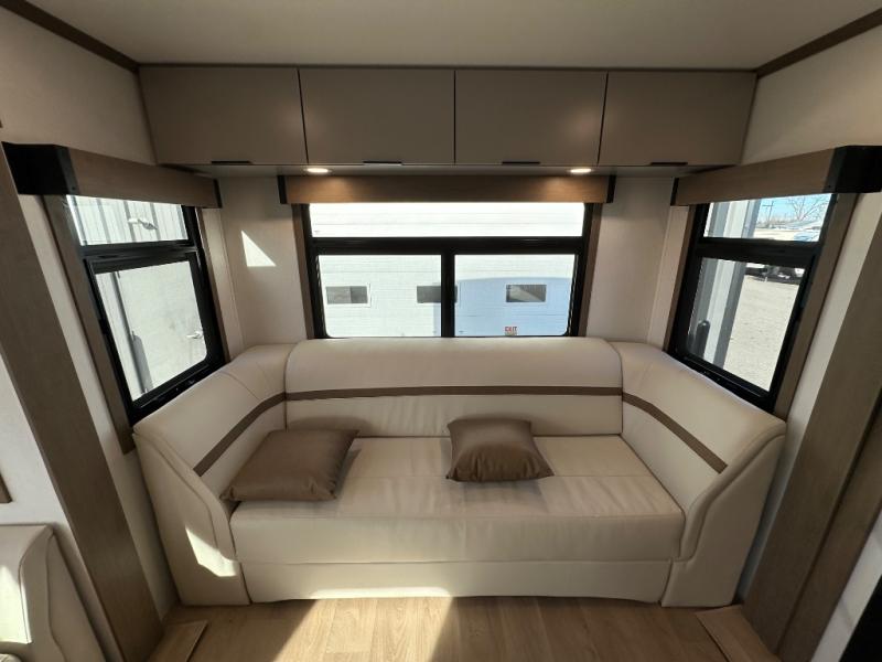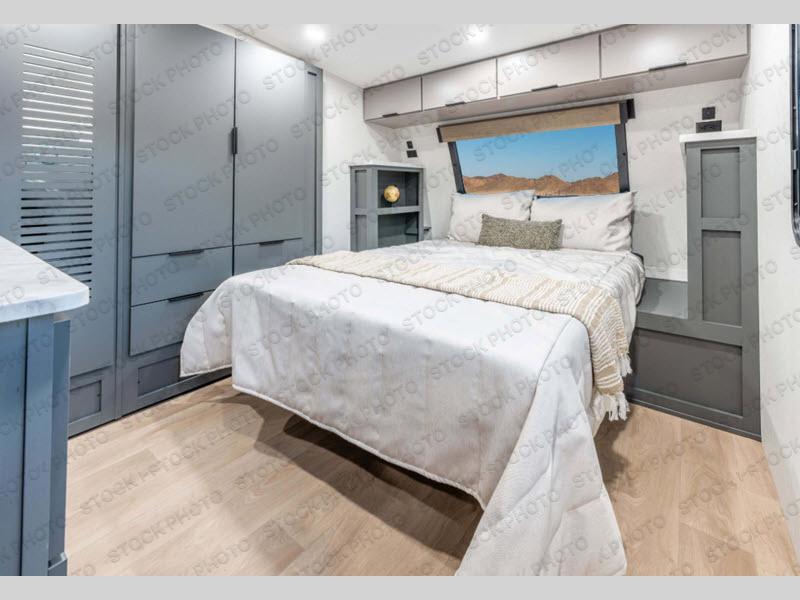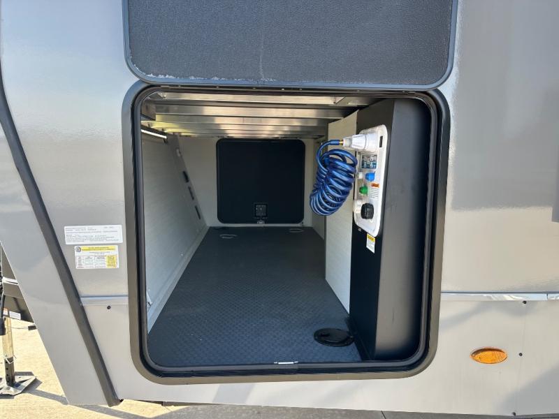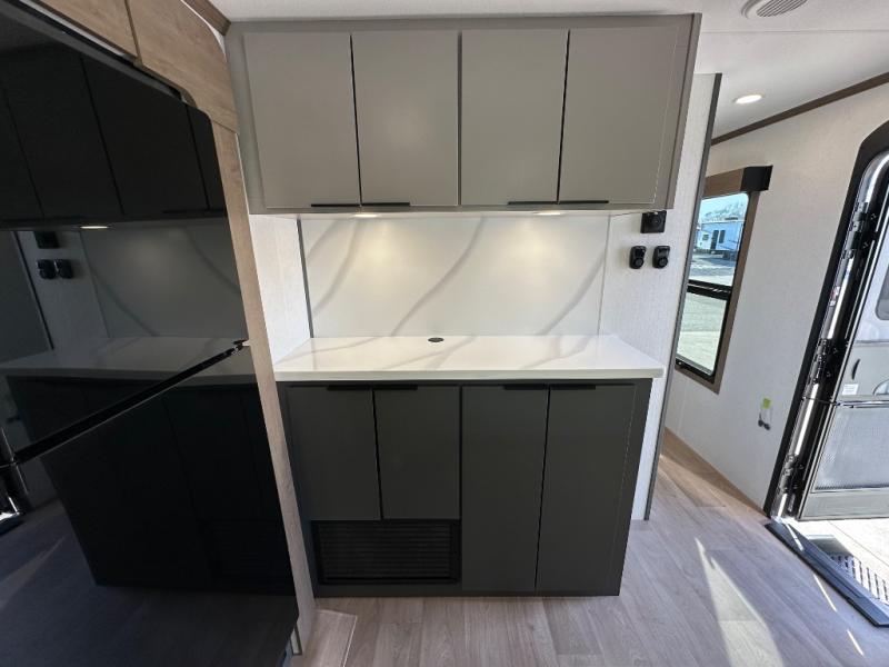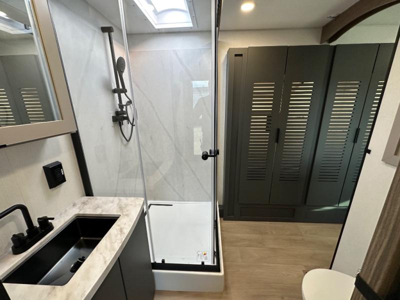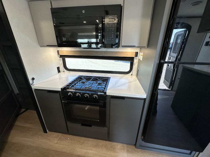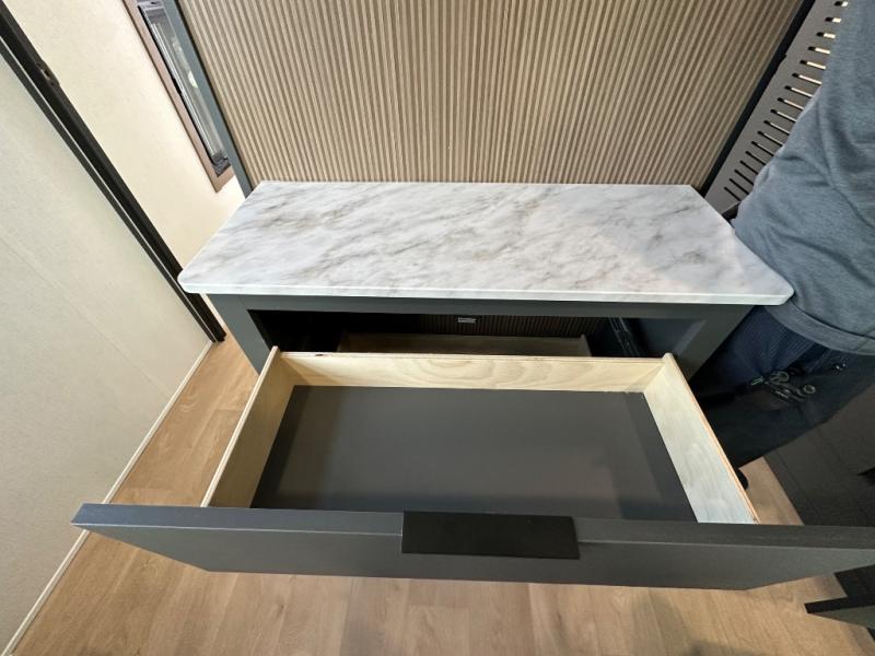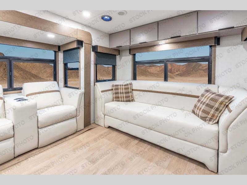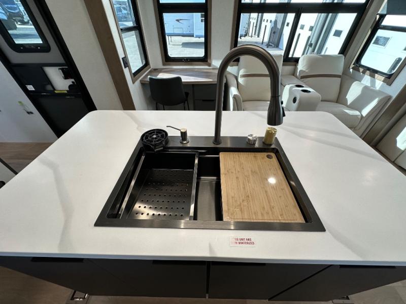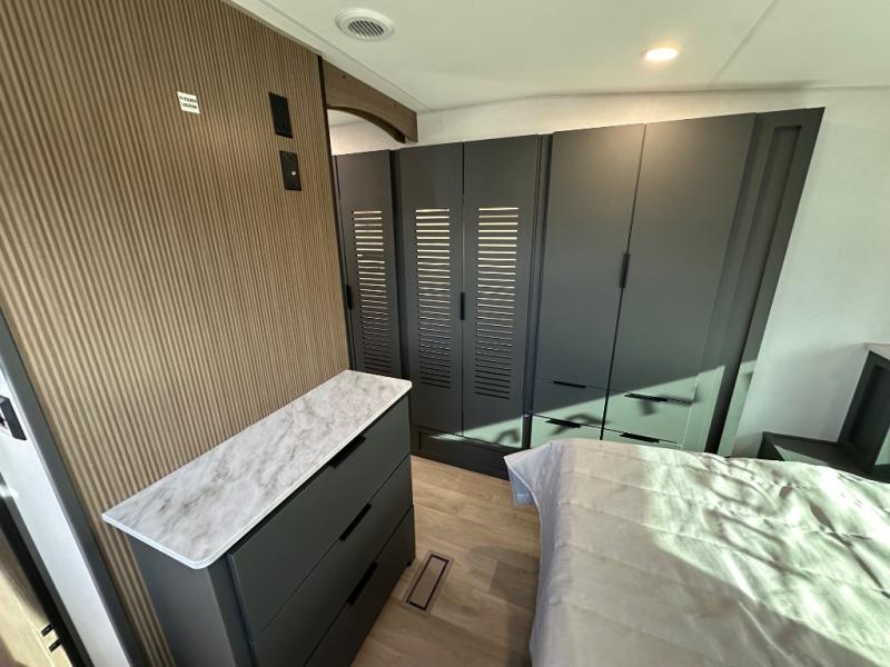 At the front, the private bedroom features a comfortable 60" x 80" queen bed, along with a wardrobe in a slide-out for expanded storage and a dresser across from the bed to keep clothing and essentials neatly organized. Moving down the hallway, you’ll find a full bathroom with a convenient double-entry design and a spacious 37" x 37" shower, allowing you to enjoy the comforts of home without relying on campground facilities. Toward the rear, the kitchen and living area open up with dual opposing slide-outs that create an inviting, open layout. One slide houses the full kitchen, complete with a cozy fireplace, swing-arm TV, a hidden pantry for dry goods, a 21" GE oven with a three-burner range, GE microwave with range hood, and a 10-cu. ft. 12V GE refrigerator. The central kitchen island with sink offers ample prep space and includes seating for casual dining. In the opposite slide, you’ll find a functional desk and 68" theater seating, while the rear features a large 90" hide-a-bed sofa that provides generous seating by day and a comfortable sleeping area for guests at night.
