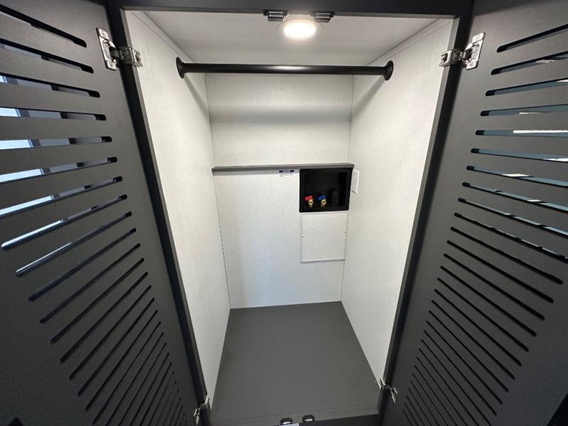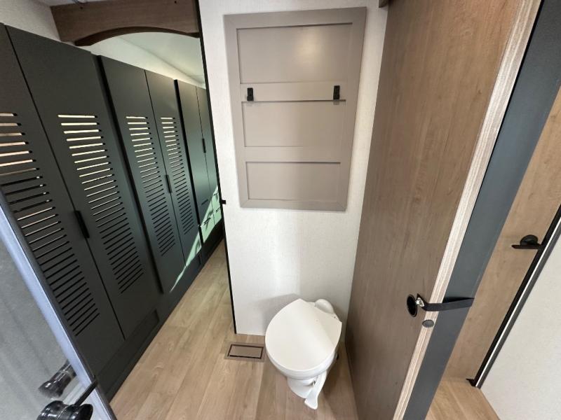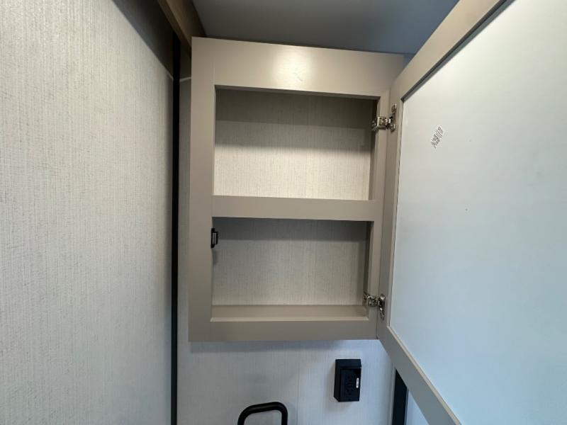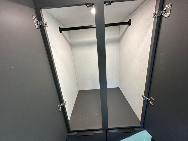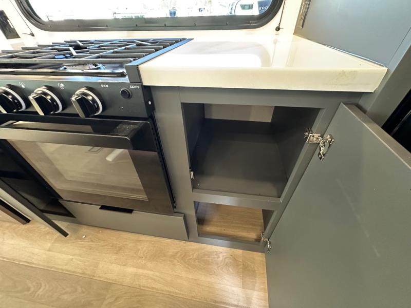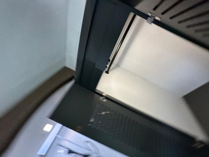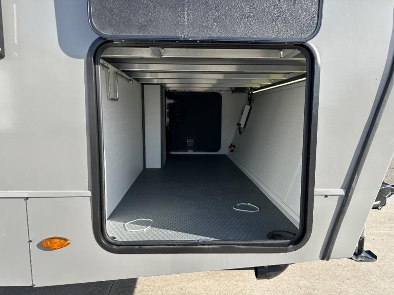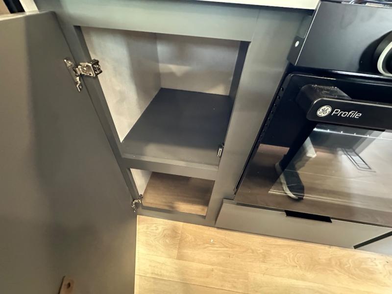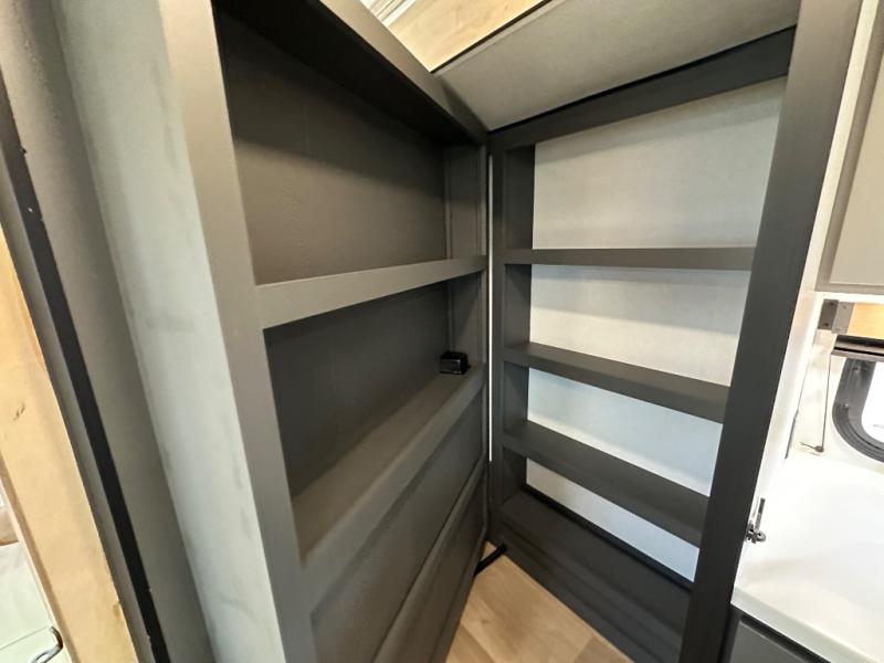 At the front, the private bedroom features a comfortable 60" x 80" queen bed, along with a wardrobe in a slide-out for expanded storage and a dresser across from the bed to keep clothing and essentials neatly organized. Moving down the hallway, you’ll find a full bathroom with a convenient double-entry design and a spacious 37" x 37" shower, allowing you to enjoy the comforts of home without relying on campground facilities. Toward the rear, the kitchen and living area open up with dual opposing slide-outs that create an inviting, open layout. One slide houses the full kitchen, complete with a cozy fireplace, swing-arm TV, a hidden pantry for dry goods, a 21" GE oven with a three-burner range, GE microwave with range hood, and a 10-cu. ft. 12V GE refrigerator. The central kitchen island with sink offers ample prep space and includes seating for casual dining. In the opposite slide, you’ll find a functional desk and 68" theater seating, while the rear features a large 90" hide-a-bed sofa that provides generous seating by day and a comfortable sleeping area for guests at night.