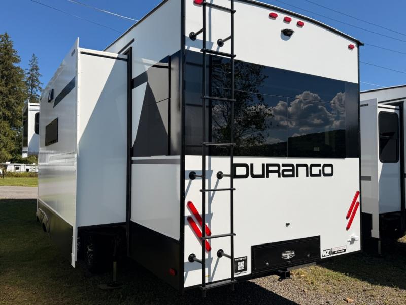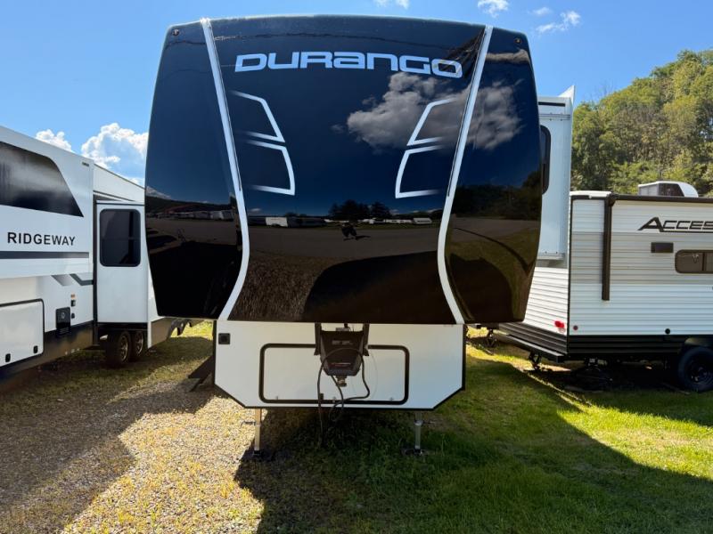 Enjoy full time living, an affordable price, and a wide body construction for more living space with every one of these KZ Durango light high-profile fifth wheels! These luxury units can be used all year round with the all-weather insulation package, the 3" x 14" foam-core in-floor straight-line heating system with a 35,000 BTU furnace, and the 15,000 BTU ducted roof A/C which optimizes the airflow by an average of 40% for better performance, cooling time, and reduction of noise. A few other construction features you will appreciate include a one piece, seamless walk-on Tufflex roofing material, Pex® in-floor heated waterlines, and a Lamilux® gelcoat fiberglass exterior. Inside, blancher maple & morel fog cabinetry , a king size bed, and smart TVs will have you feeling like you never left home!