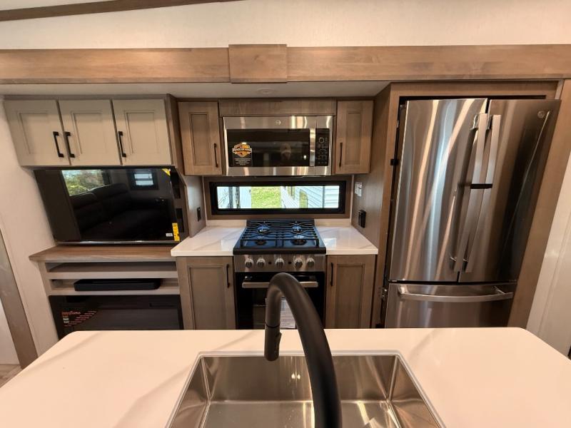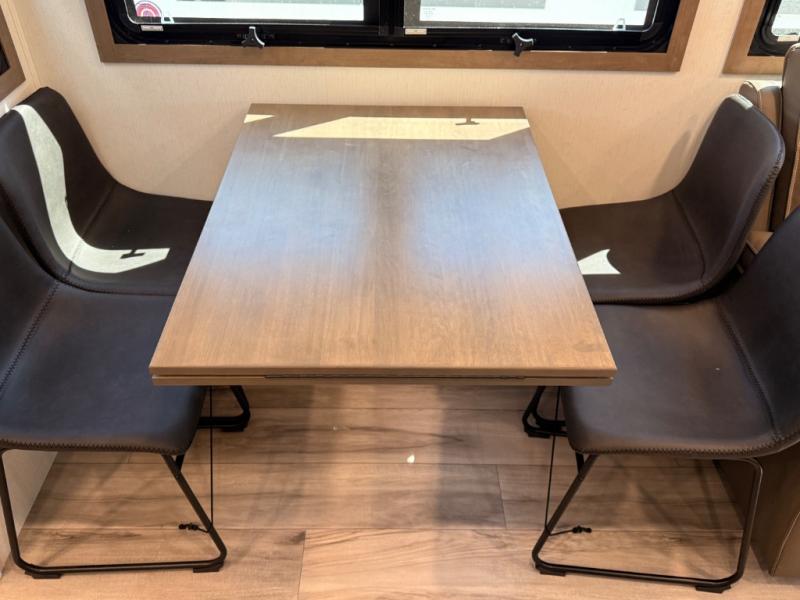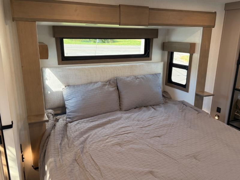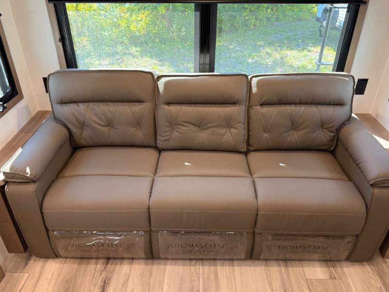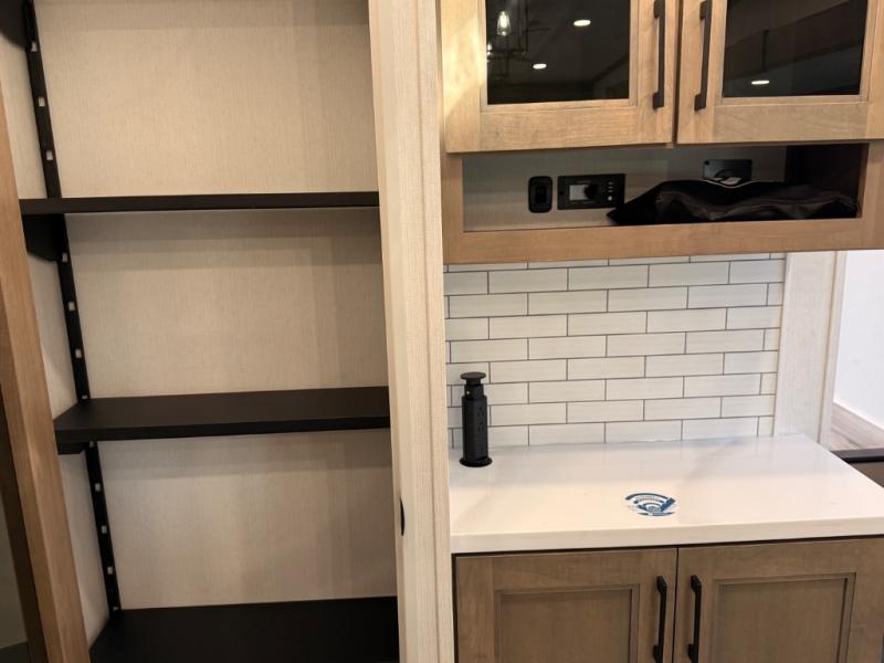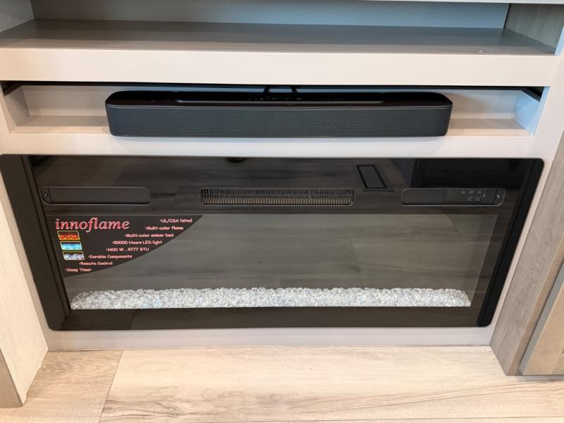 Start camping in luxury with this fifth wheel! The front private bedroom has a king bed slide which can be switched for an optional queen instead, a dresser, and a front wardrobe with washer and dryer prep. Start each morning feeling clean and fresh after showering in the 48" x 30" residential shower with a seat in the full bathroom. The kitchen has an island ideal for enjoying your morning coffee while reading the newspaper and socializing with the chef whipping up some scrambled eggs on the four burner range. The hutch can store your dishes, the pantry can store your canned goods, and the 18 cu. ft. refrigerator will keep your perishables fresh. If mother nature is raining on your parade then read a book on the rear hide-a-bed sofa or relax in the theater seating which has USB charging. And the entertainment center with a fireplace and 43" smart LED TV will keep you entertained!