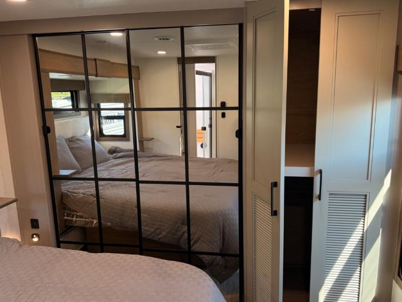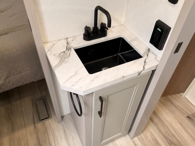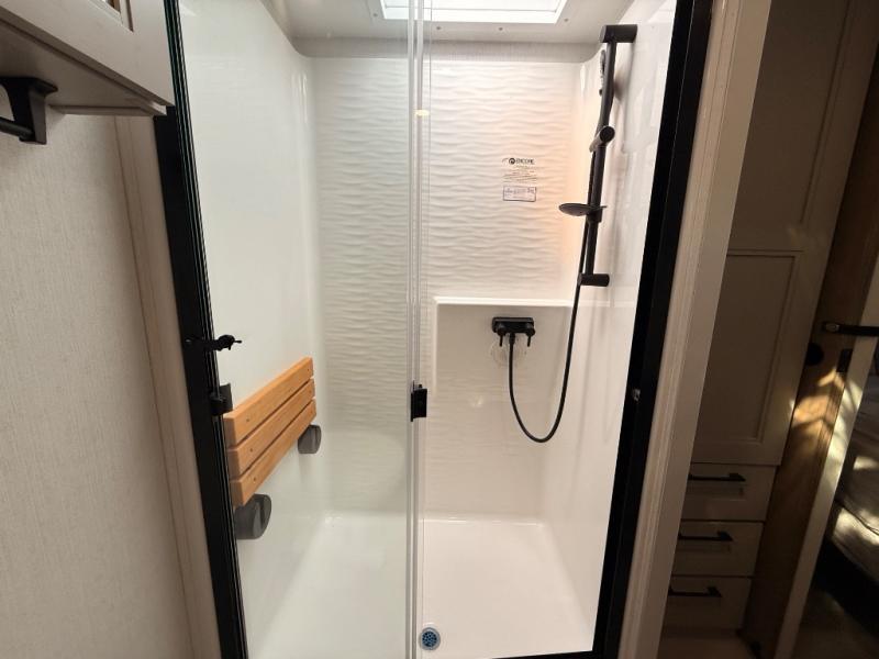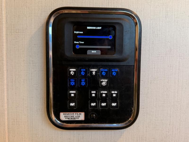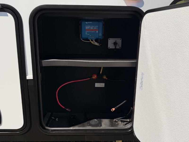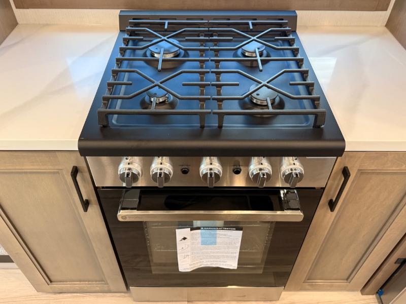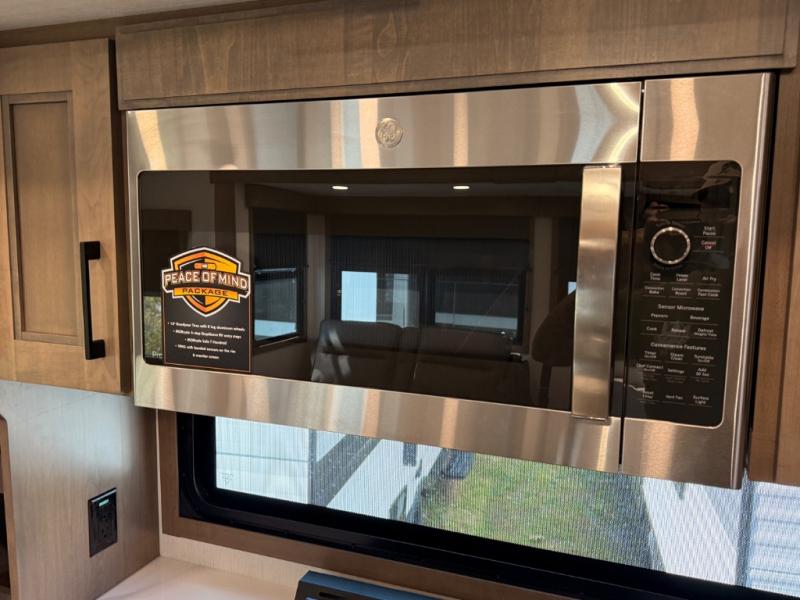 Start camping in luxury with this fifth wheel! The front private bedroom has a king bed slide which can be switched for an optional queen instead, a dresser, and a front wardrobe with washer and dryer prep. Start each morning feeling clean and fresh after showering in the 48" x 30" residential shower with a seat in the full bathroom. The kitchen has an island ideal for enjoying your morning coffee while reading the newspaper and socializing with the chef whipping up some scrambled eggs on the four burner range. The hutch can store your dishes, the pantry can store your canned goods, and the 18 cu. ft. refrigerator will keep your perishables fresh. If mother nature is raining on your parade then read a book on the rear hide-a-bed sofa or relax in the theater seating which has USB charging. And the entertainment center with a fireplace and 43" smart LED TV will keep you entertained!
