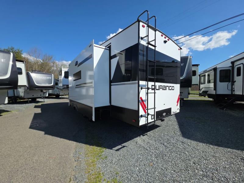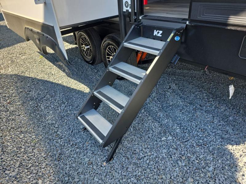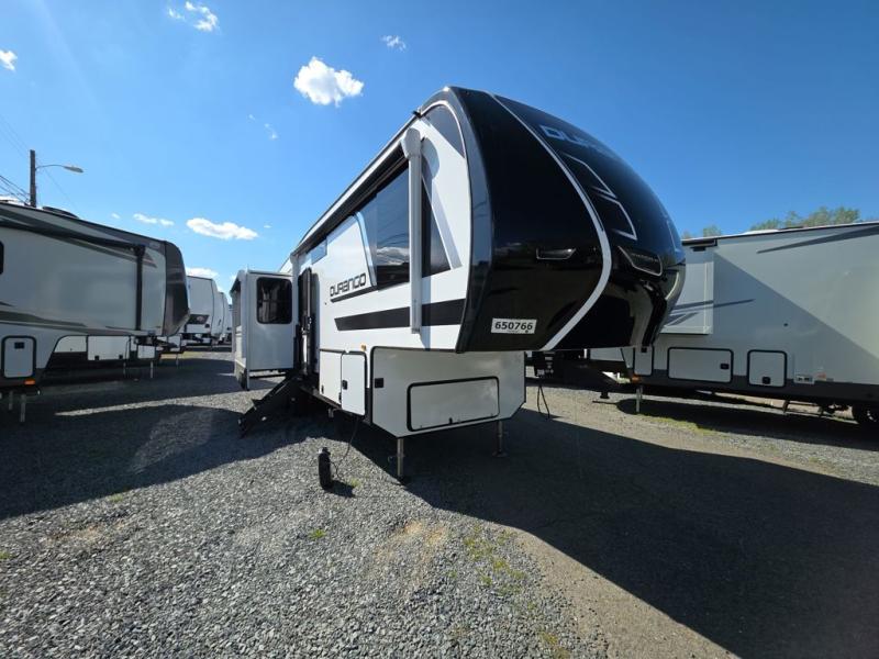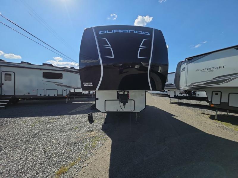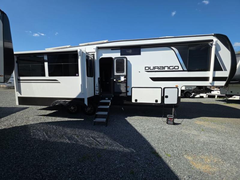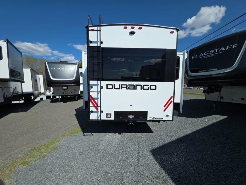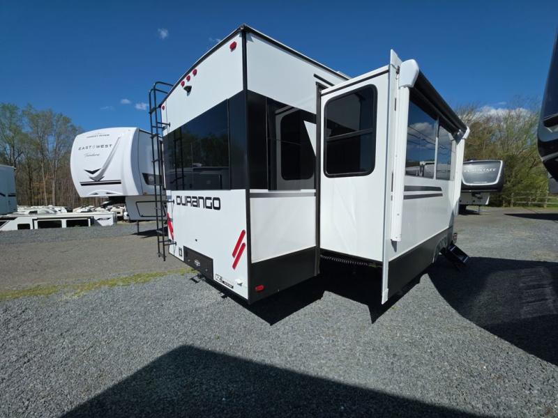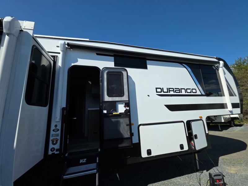 Enjoy full time living, an affordable price, and a wide body construction for more living space with every one of these KZ Durango light high-profile fifth wheels! These luxury units can be used all year round with the all-weather insulation package, the 3" x 14" foam-core in-floor straight-line heating system with a 35,000 BTU furnace, and the 15,000 BTU ducted roof A/C which optimizes the airflow by an average of 40% for better performance, cooling time, and reduction of noise. A few other construction features you will appreciate include a one piece, seamless walk-on Tufflex roofing material, Pex® in-floor heated waterlines, and a Lamilux® gelcoat fiberglass exterior. Inside, blancher maple & morel fog cabinetry , a king size bed, and smart TVs will have you feeling like you never left home!