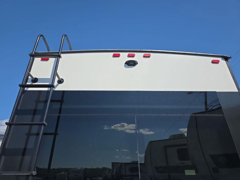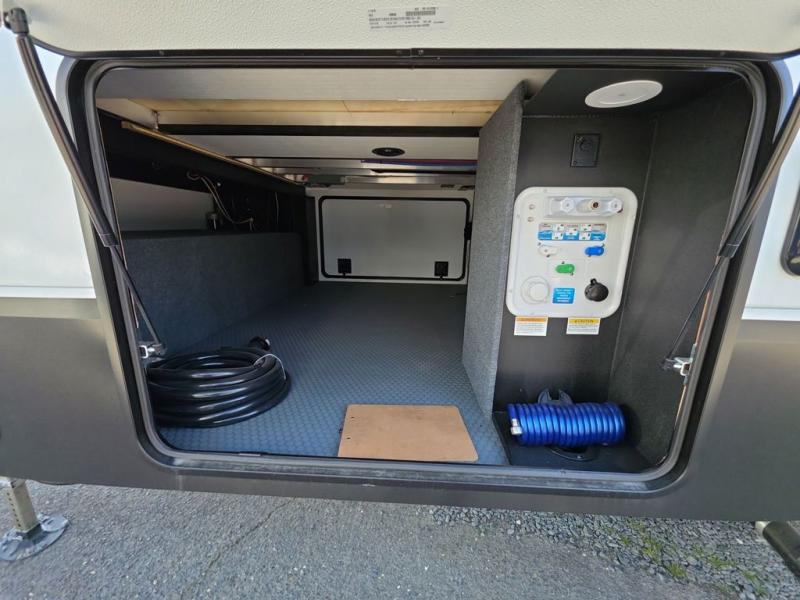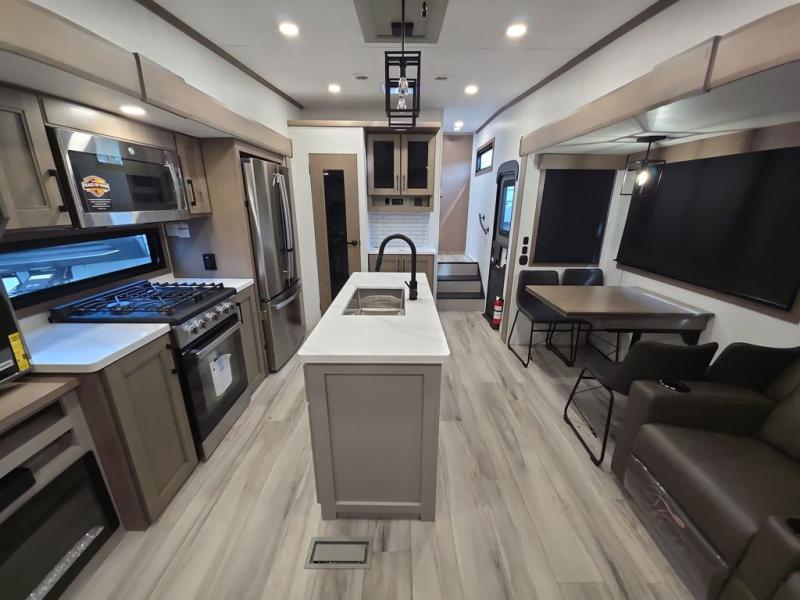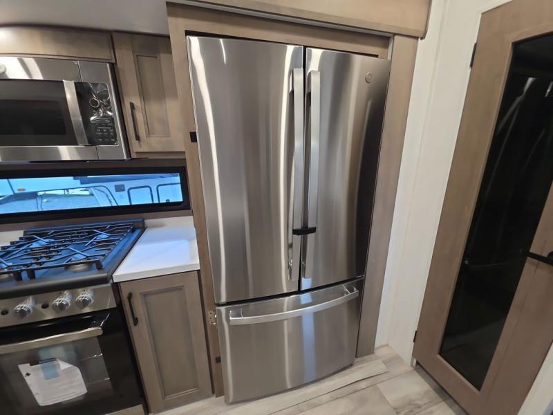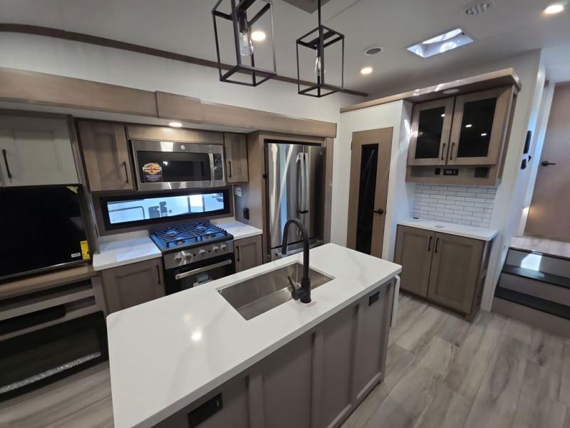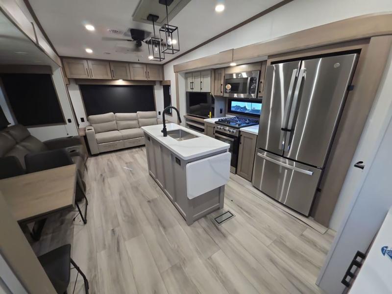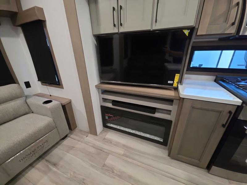 Start camping in luxury with this fifth wheel! The front private bedroom has a king bed slide which can be switched for an optional queen instead, a dresser, and a front wardrobe with washer and dryer prep. Start each morning feeling clean and fresh after showering in the 48" x 30" residential shower with a seat in the full bathroom. The kitchen has an island ideal for enjoying your morning coffee while reading the newspaper and socializing with the chef whipping up some scrambled eggs on the four burner range. The hutch can store your dishes, the pantry can store your canned goods, and the 18 cu. ft. refrigerator will keep your perishables fresh. If mother nature is raining on your parade then read a book on the rear hide-a-bed sofa or relax in the theater seating which has USB charging. And the entertainment center with a fireplace and 43" smart LED TV will keep you entertained!