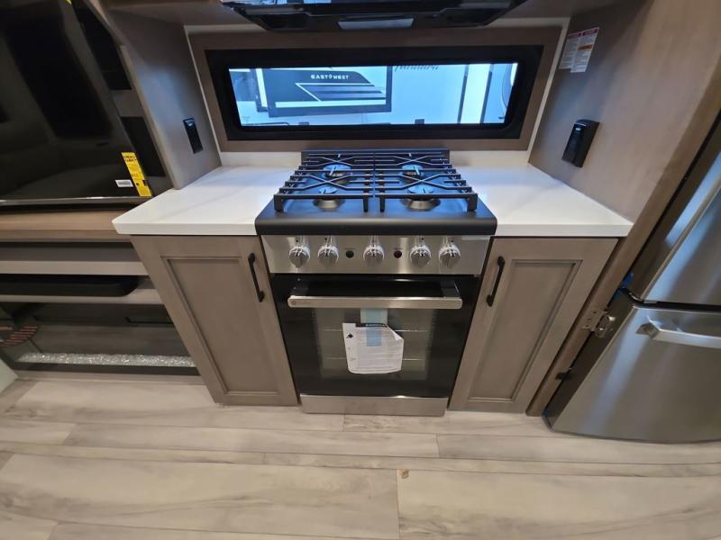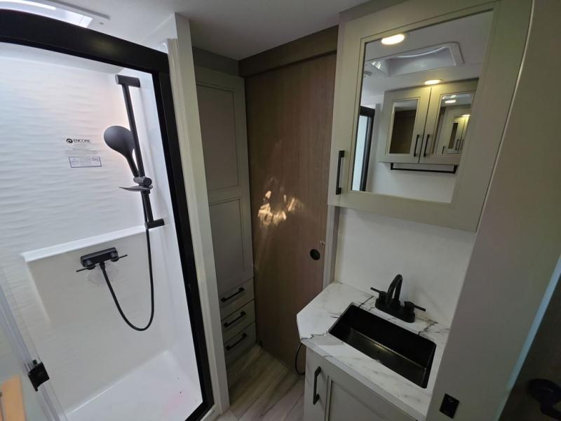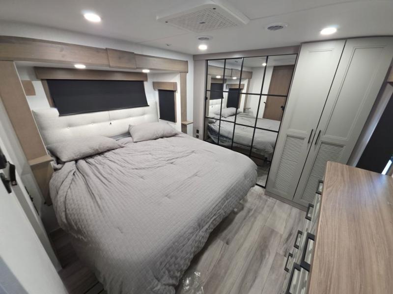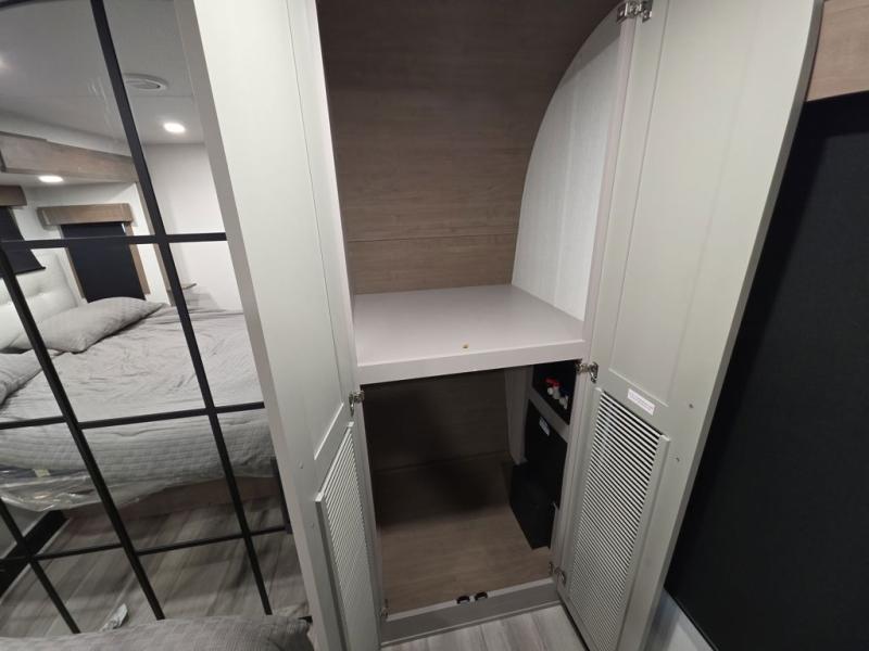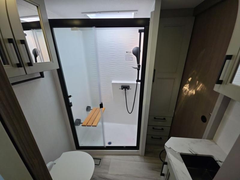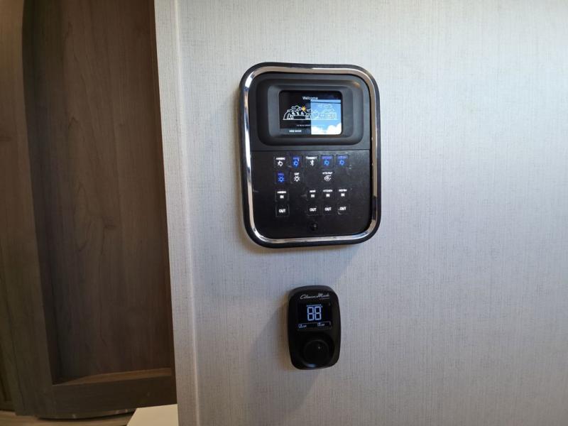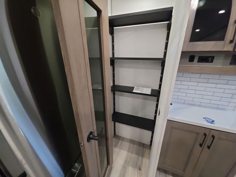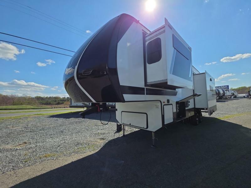 Start camping in luxury with this fifth wheel! The front private bedroom has a king bed slide which can be switched for an optional queen instead, a dresser, and a front wardrobe with washer and dryer prep. Start each morning feeling clean and fresh after showering in the 48" x 30" residential shower with a seat in the full bathroom. The kitchen has an island ideal for enjoying your morning coffee while reading the newspaper and socializing with the chef whipping up some scrambled eggs on the four burner range. The hutch can store your dishes, the pantry can store your canned goods, and the 18 cu. ft. refrigerator will keep your perishables fresh. If mother nature is raining on your parade then read a book on the rear hide-a-bed sofa or relax in the theater seating which has USB charging. And the entertainment center with a fireplace and 43" smart LED TV will keep you entertained!