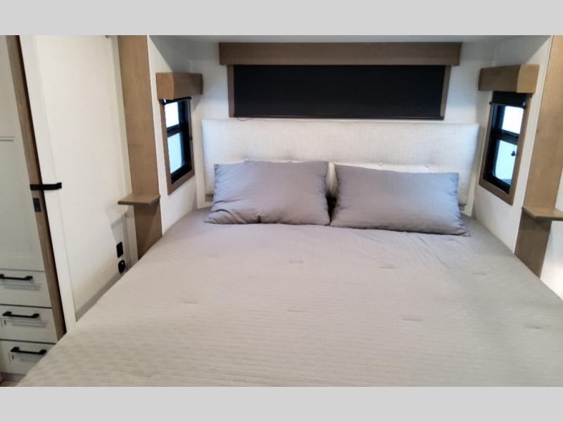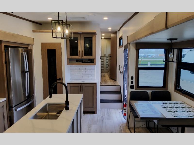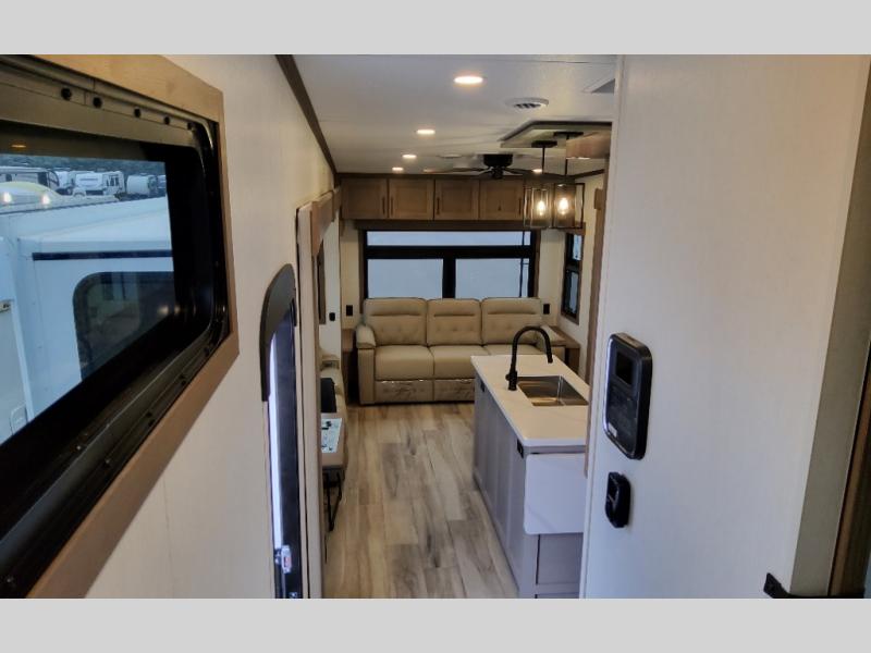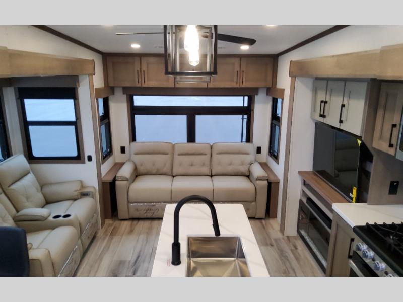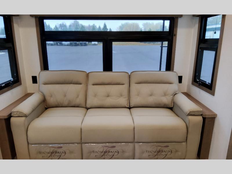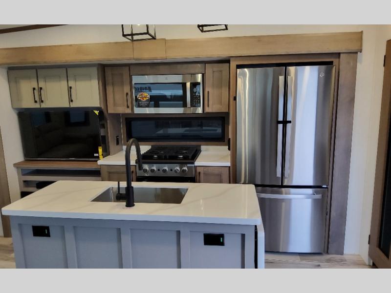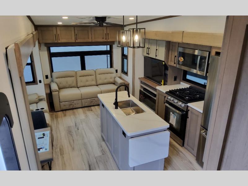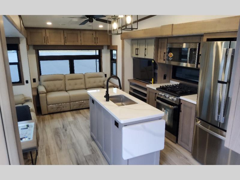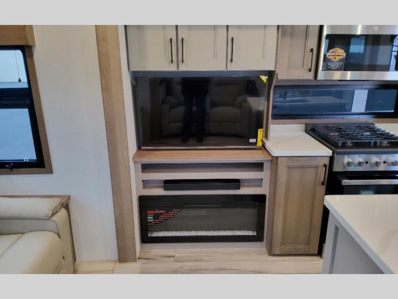 Start camping in luxury with this fifth wheel! The front private bedroom has a king bed slide which can be switched for an optional queen instead, a dresser, and a front wardrobe with washer and dryer prep. Start each morning feeling clean and fresh after showering in the 48" x 30" residential shower with a seat in the full bathroom. The kitchen has an island ideal for enjoying your morning coffee while reading the newspaper and socializing with the chef whipping up some scrambled eggs on the four burner range. The hutch can store your dishes, the pantry can store your canned goods, and the 18 cu. ft. refrigerator will keep your perishables fresh. If mother nature is raining on your parade then read a book on the rear hide-a-bed sofa or relax in the theater seating which has USB charging. And the entertainment center with a fireplace and 43" smart LED TV will keep you entertained!