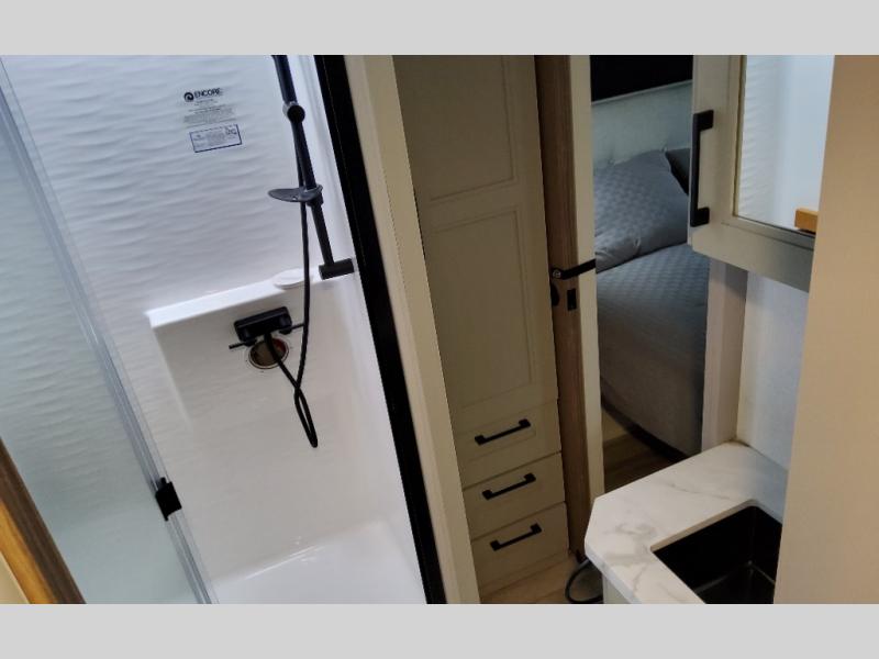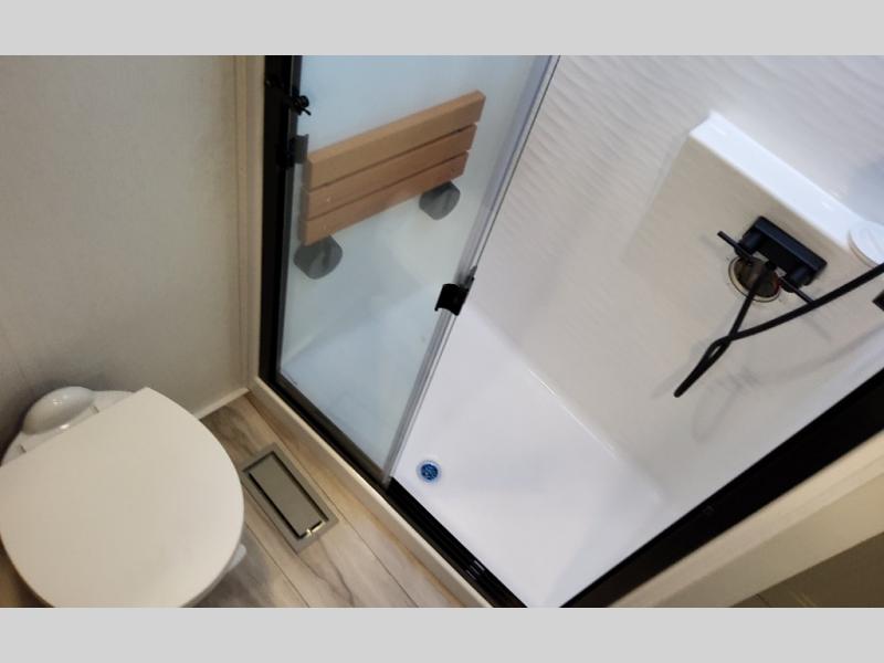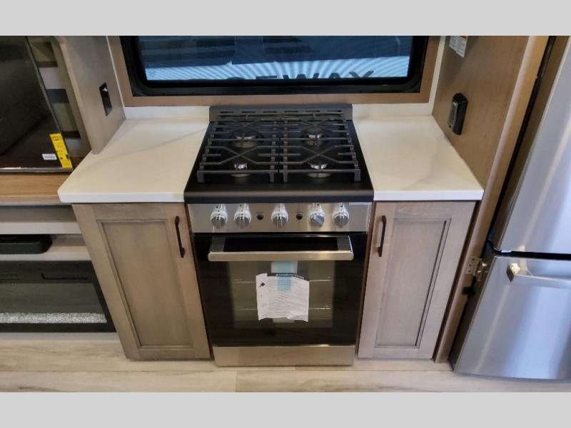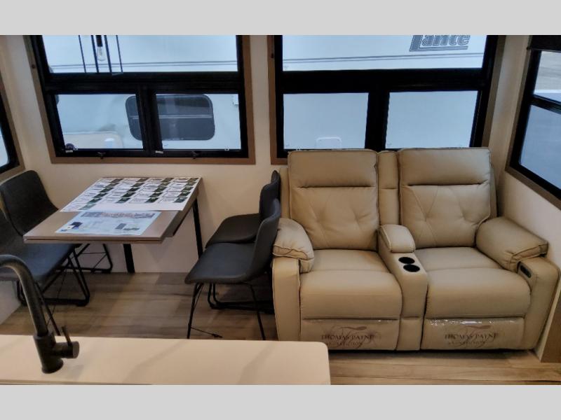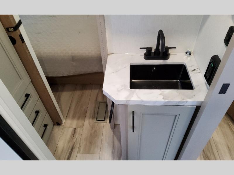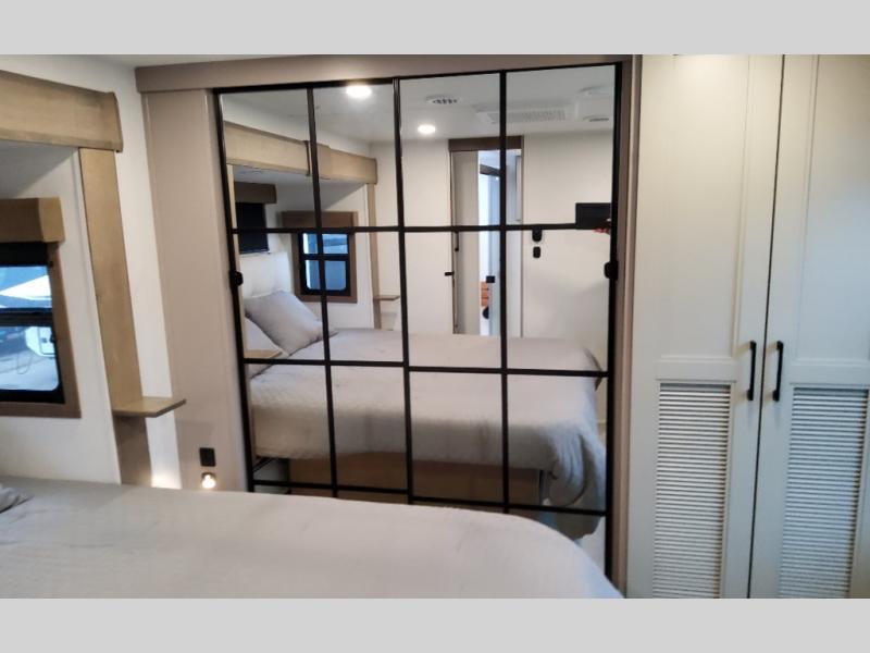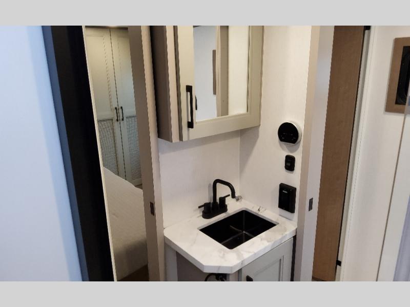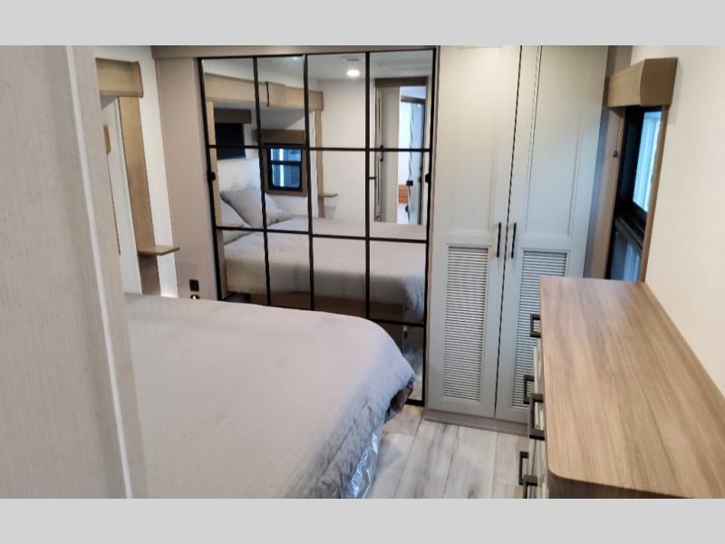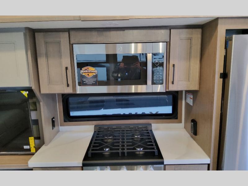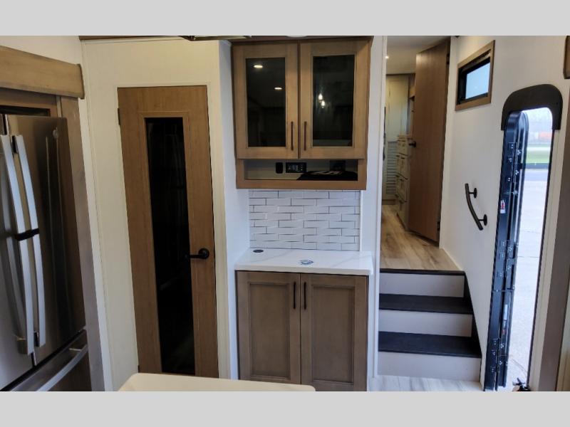 Start camping in luxury with this fifth wheel! The front private bedroom has a king bed slide which can be switched for an optional queen instead, a dresser, and a front wardrobe with washer and dryer prep. Start each morning feeling clean and fresh after showering in the 48" x 30" residential shower with a seat in the full bathroom. The kitchen has an island ideal for enjoying your morning coffee while reading the newspaper and socializing with the chef whipping up some scrambled eggs on the four burner range. The hutch can store your dishes, the pantry can store your canned goods, and the 18 cu. ft. refrigerator will keep your perishables fresh. If mother nature is raining on your parade then read a book on the rear hide-a-bed sofa or relax in the theater seating which has USB charging. And the entertainment center with a fireplace and 43" smart LED TV will keep you entertained!