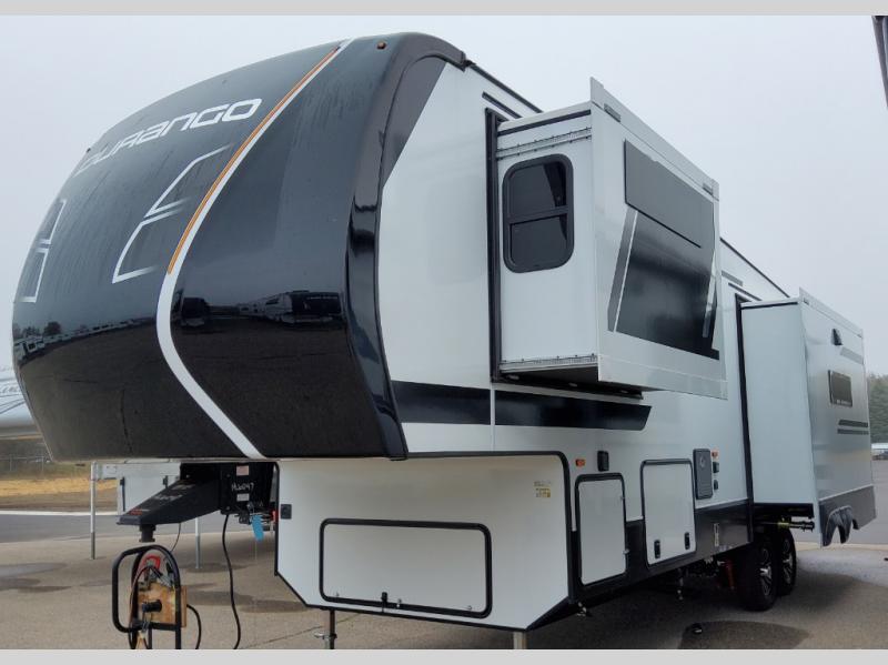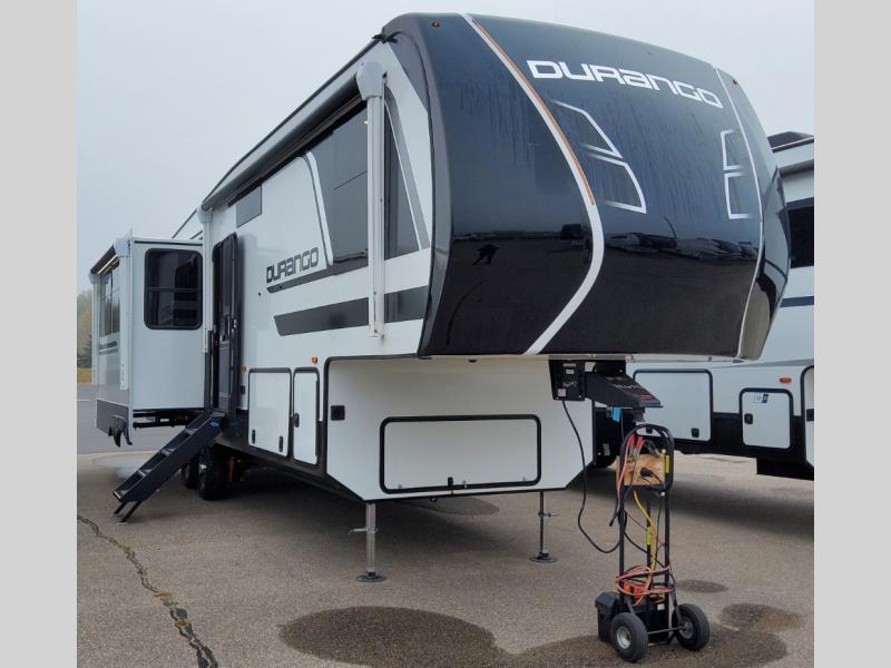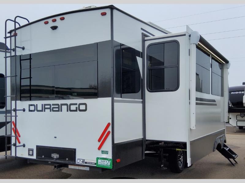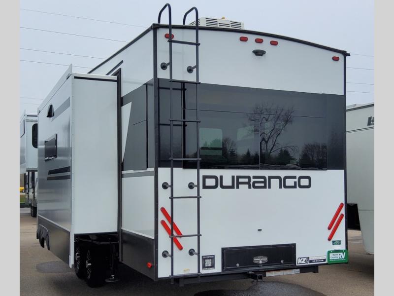 Enjoy full time living, an affordable price, and a wide body construction for more living space with every one of these KZ Durango light high-profile fifth wheels! These luxury units can be used all year round with the all-weather insulation package, the 3" x 14" foam-core in-floor straight-line heating system with a 35,000 BTU furnace, and the 15,000 BTU ducted roof A/C which optimizes the airflow by an average of 40% for better performance, cooling time, and reduction of noise. A few other construction features you will appreciate include a one piece, seamless walk-on Tufflex roofing material, Pex® in-floor heated waterlines, and a Lamilux® gelcoat fiberglass exterior. Inside, blancher maple & morel fog cabinetry , a king size bed, and smart TVs will have you feeling like you never left home!