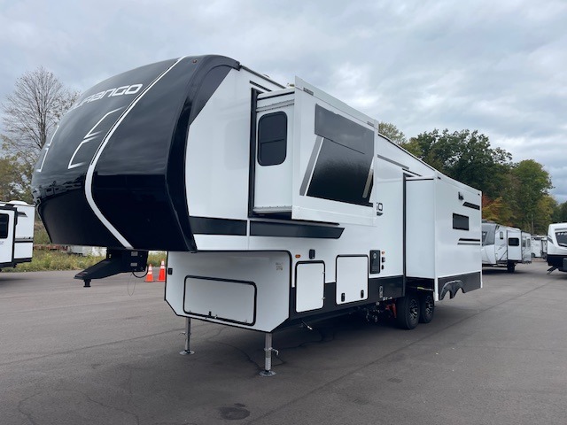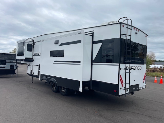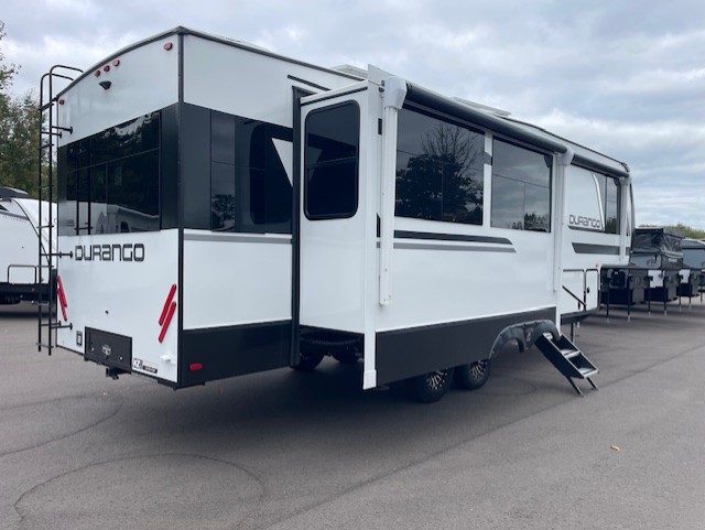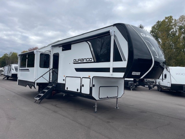 Enjoy full time living, an affordable price, and a wide body construction for more living space with every one of these KZ Durango light high-profile fifth wheels! These luxury units can be used all year round with the all-weather insulation package, the 3" x 14" foam-core in-floor straight-line heating system with a 35,000 BTU furnace, and the 15,000 BTU ducted roof A/C which optimizes the airflow by an average of 40% for better performance, cooling time, and reduction of noise. A few other construction features you will appreciate include a one piece, seamless walk-on Tufflex roofing material, Pex® in-floor heated waterlines, and a Lamilux® gelcoat fiberglass exterior. Inside, blancher maple & morel fog cabinetry , a king size bed, and smart TVs will have you feeling like you never left home!