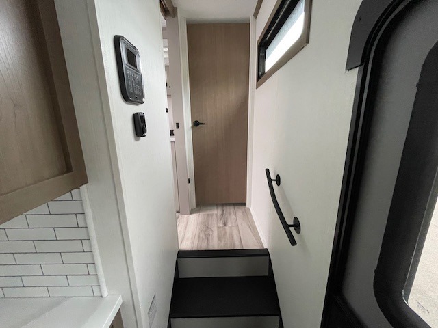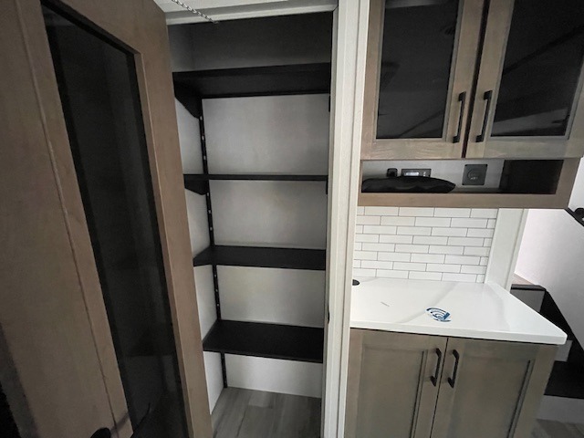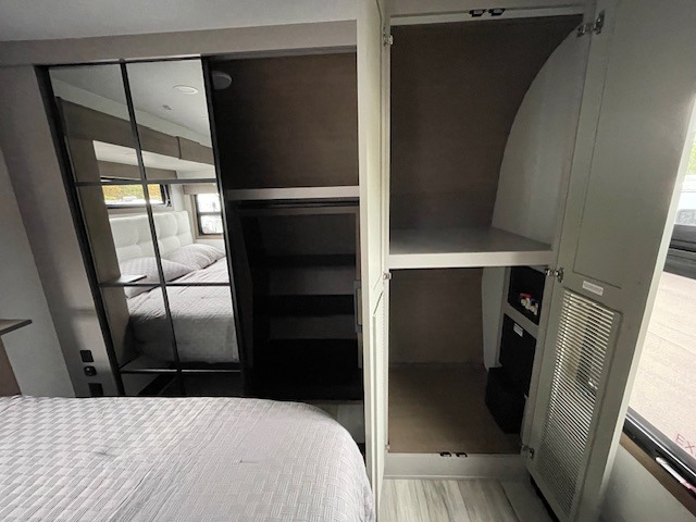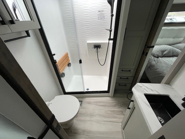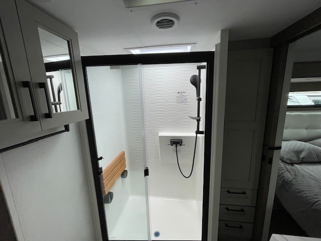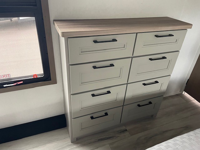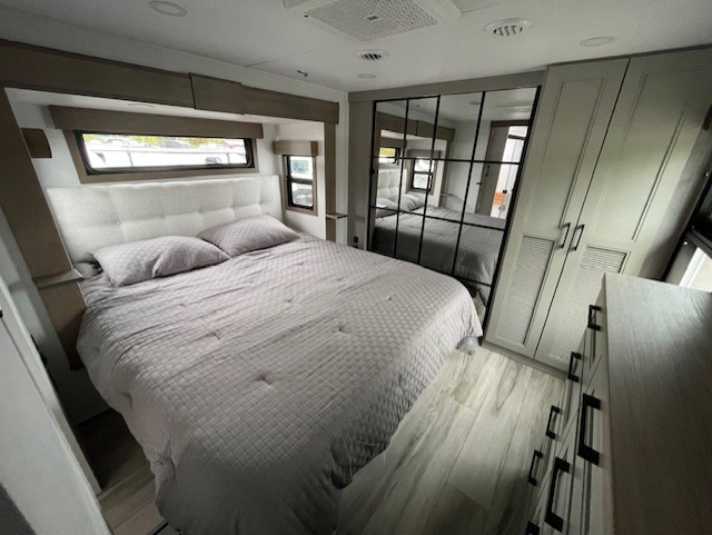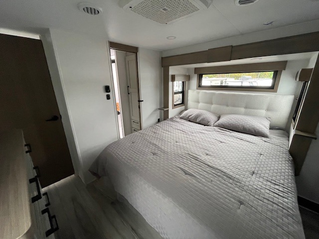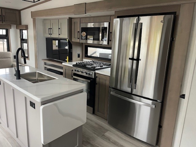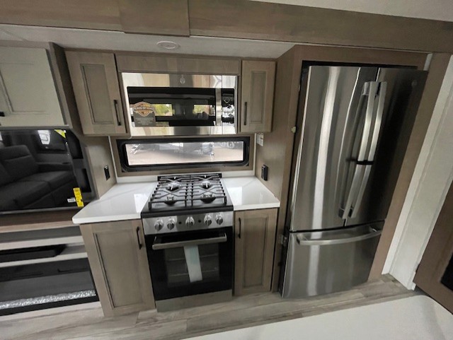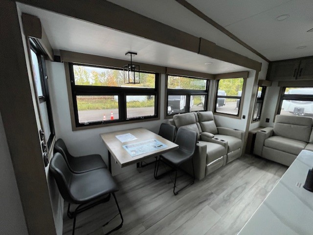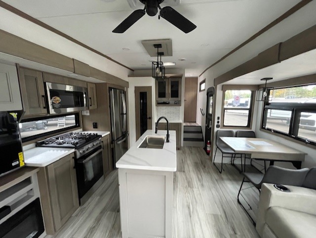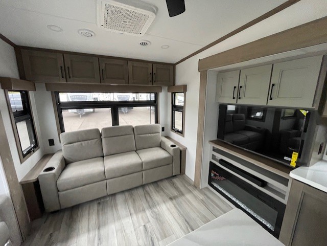Start camping in luxury with this fifth wheel! The front private bedroom has a king bed slide which can be switched for an optional queen instead, a dresser, and a front wardrobe with washer and dryer prep. Start each morning feeling clean and fresh after showering in the 48" x 30" residential shower with a seat in the full bathroom. The kitchen has an island ideal for enjoying your morning coffee while reading the newspaper and socializing with the chef whipping up some scrambled eggs on the four burner range. The hutch can store your dishes, the pantry can store your canned goods, and the 18 cu. ft. refrigerator will keep your perishables fresh. If mother nature is raining on your parade then read a book on the rear hide-a-bed sofa or relax in the theater seating which has USB charging. And the entertainment center with a fireplace and 43" smart LED TV will keep you entertained!