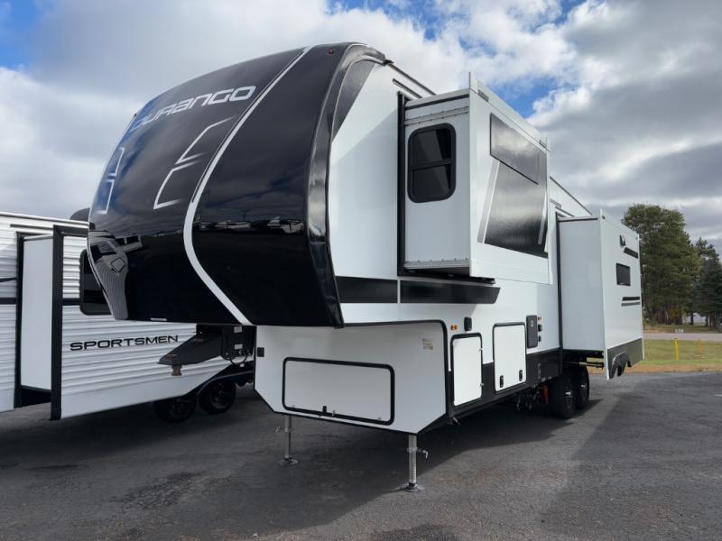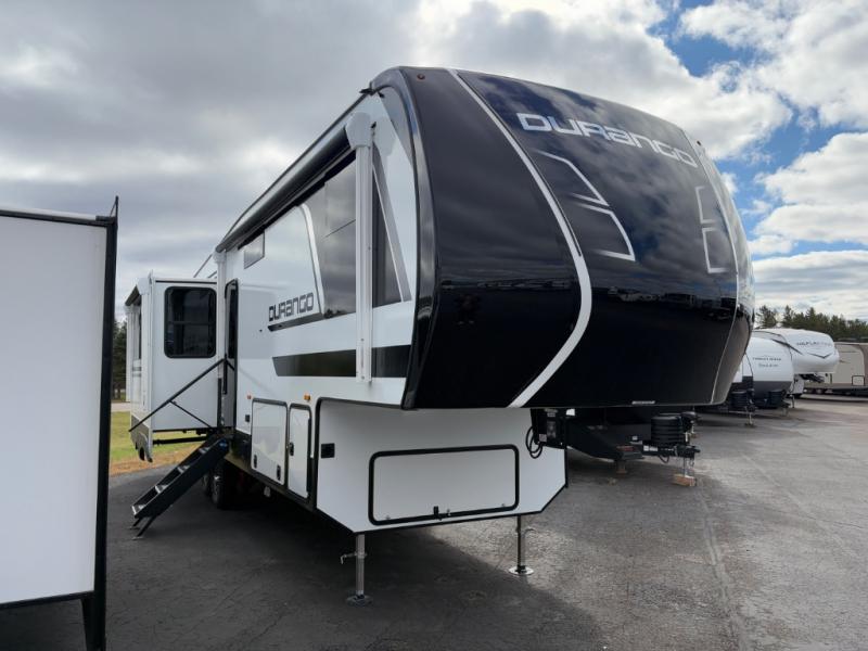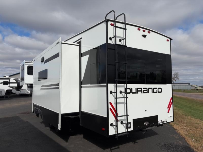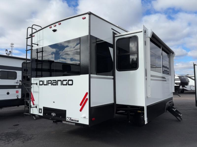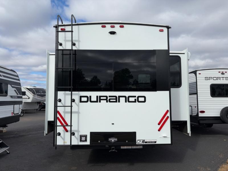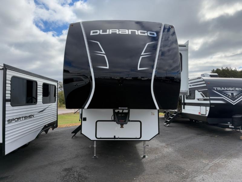 Enjoy full time living, an affordable price, and a wide body construction for more living space with every one of these KZ Durango light high-profile fifth wheels! These luxury units can be used all year round with the all-weather insulation package, the 3" x 14" foam-core in-floor straight-line heating system with a 35,000 BTU furnace, and the 15,000 BTU ducted roof A/C which optimizes the airflow by an average of 40% for better performance, cooling time, and reduction of noise. A few other construction features you will appreciate include a one piece, seamless walk-on Tufflex roofing material, Pex® in-floor heated waterlines, and a Lamilux® gelcoat fiberglass exterior. Inside, blancher maple & morel fog cabinetry , a king size bed, and smart TVs will have you feeling like you never left home!