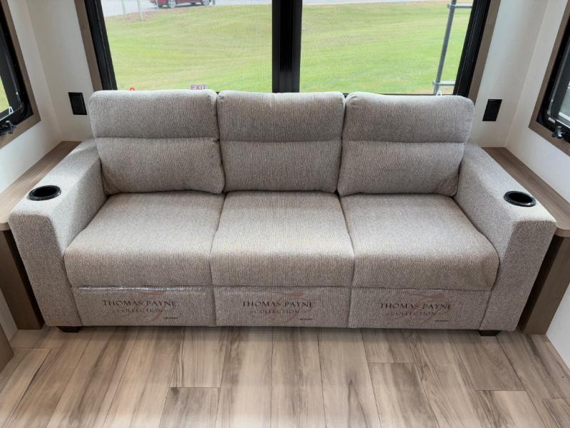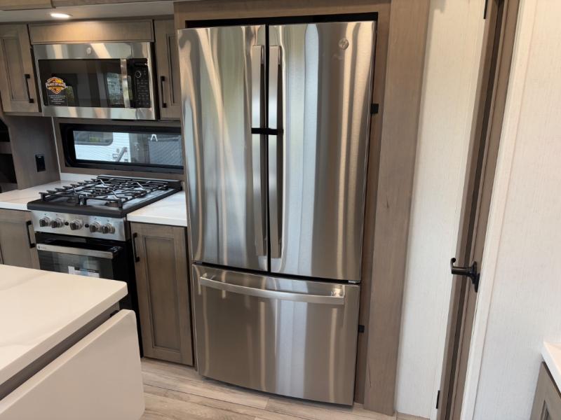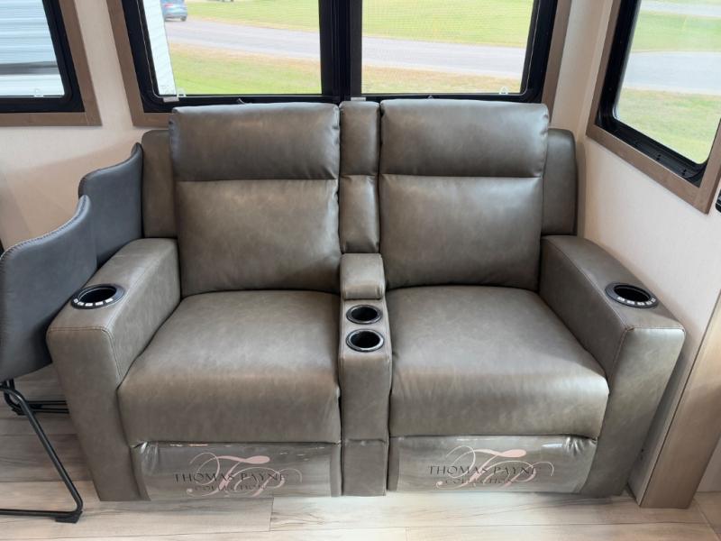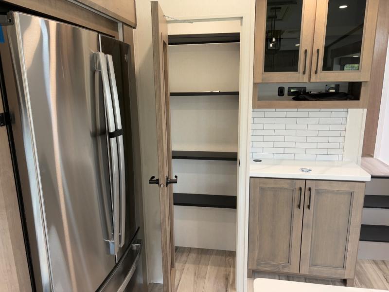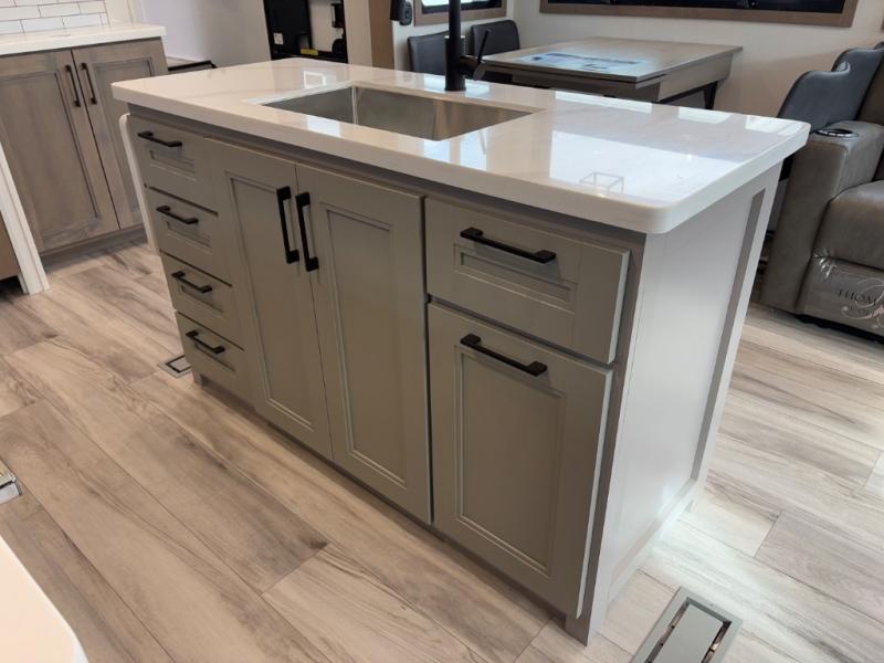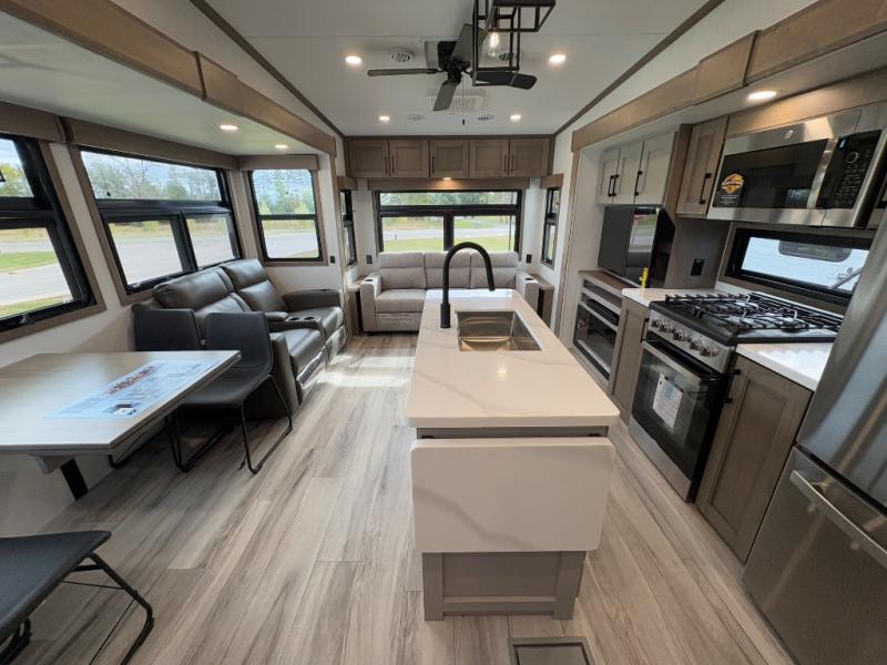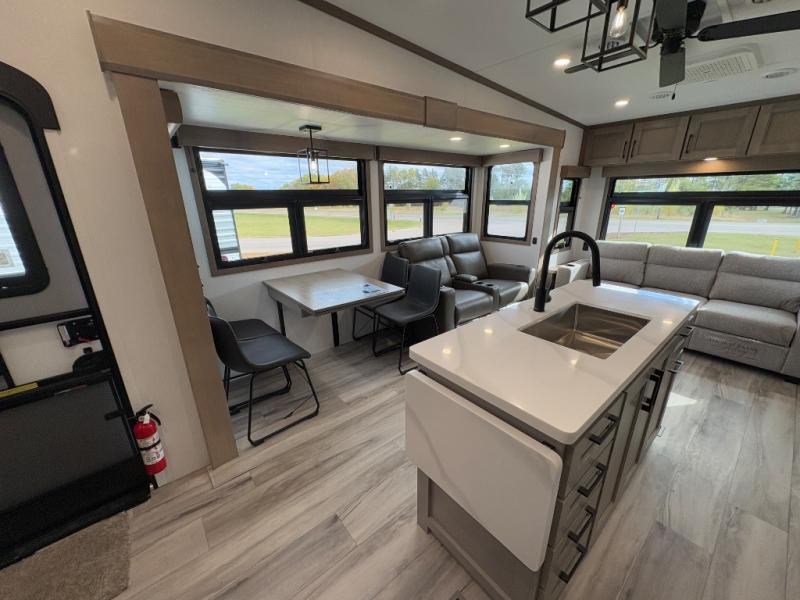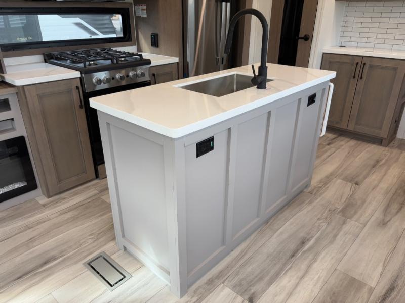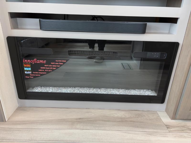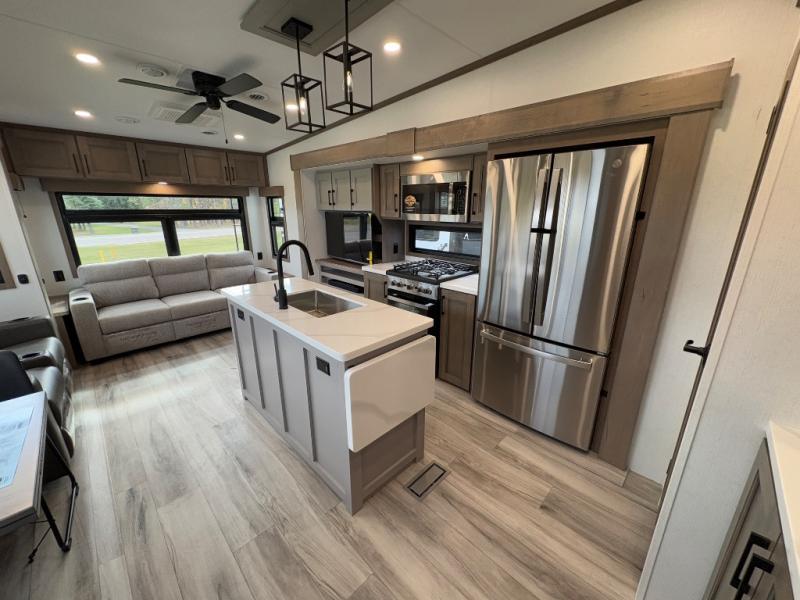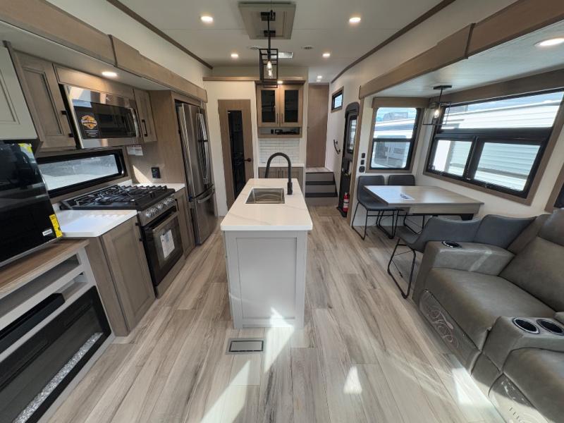Start camping in luxury with this fifth wheel! The front private bedroom has a king bed slide which can be switched for an optional queen instead, a dresser, and a front wardrobe with washer and dryer prep. Start each morning feeling clean and fresh after showering in the 48" x 30" residential shower with a seat in the full bathroom. The kitchen has an island ideal for enjoying your morning coffee while reading the newspaper and socializing with the chef whipping up some scrambled eggs on the four burner range. The hutch can store your dishes, the pantry can store your canned goods, and the 18 cu. ft. refrigerator will keep your perishables fresh. If mother nature is raining on your parade then read a book on the rear hide-a-bed sofa or relax in the theater seating which has USB charging. And the entertainment center with a fireplace and 43" smart LED TV will keep you entertained!