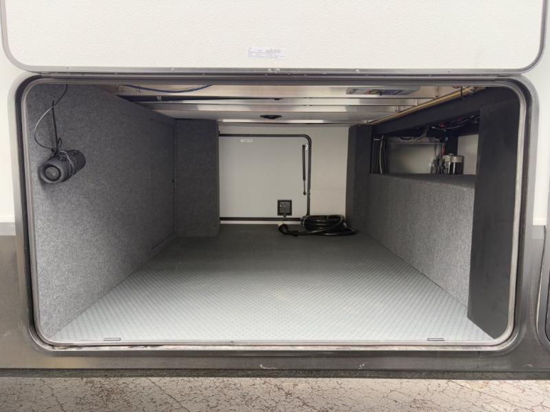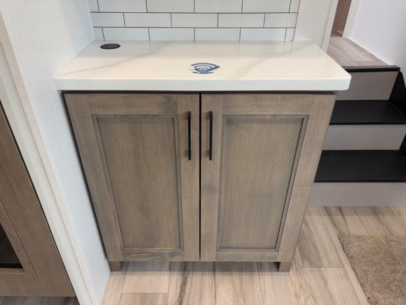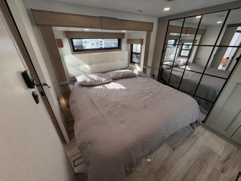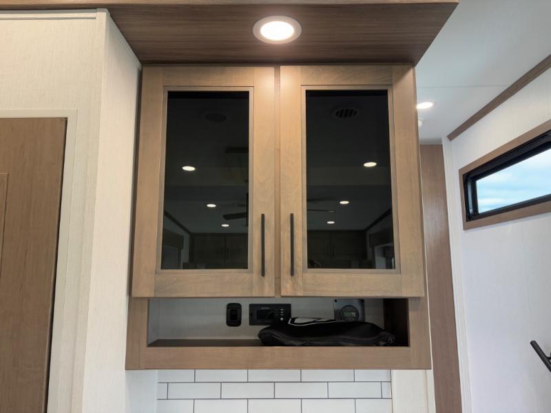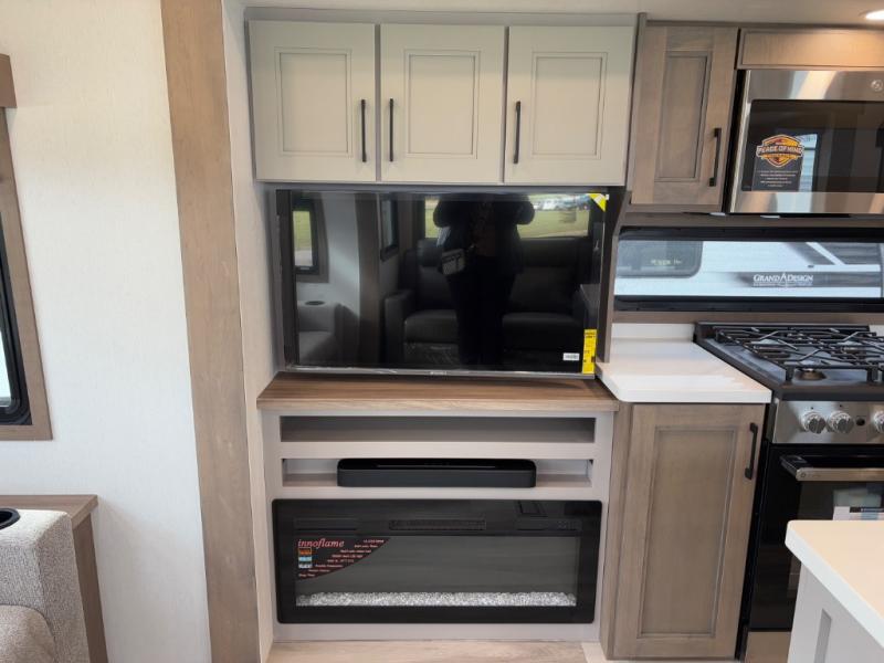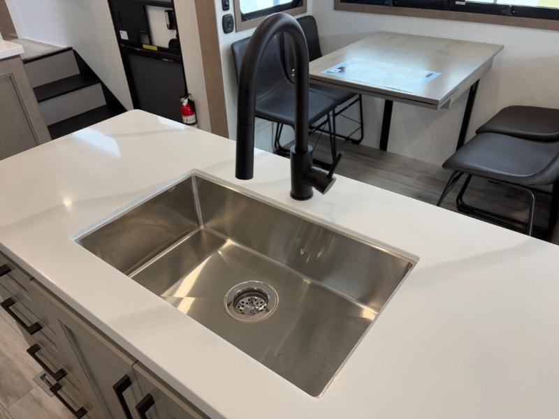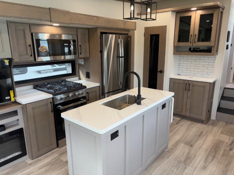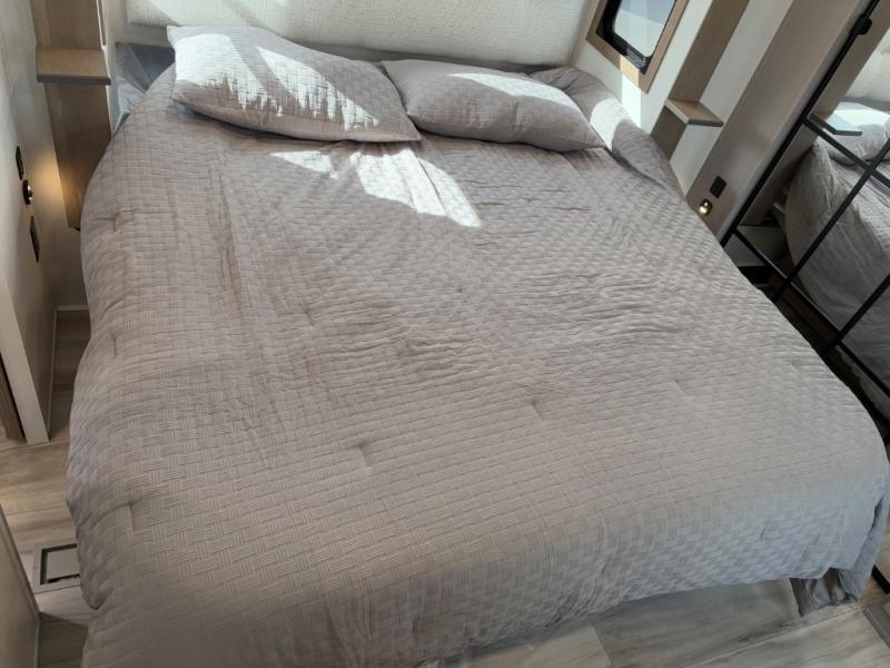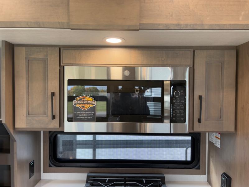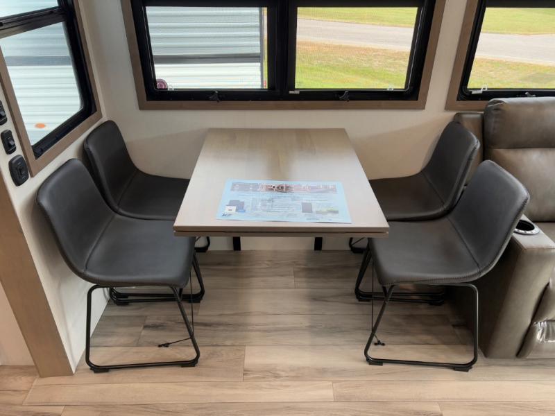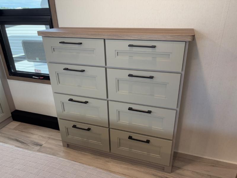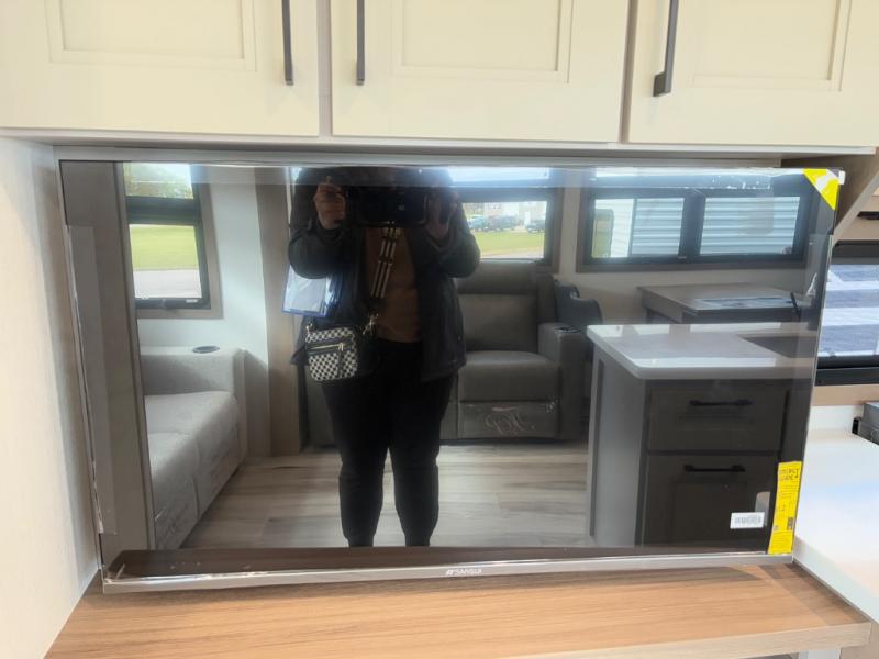 Start camping in luxury with this fifth wheel! The front private bedroom has a king bed slide which can be switched for an optional queen instead, a dresser, and a front wardrobe with washer and dryer prep. Start each morning feeling clean and fresh after showering in the 48" x 30" residential shower with a seat in the full bathroom. The kitchen has an island ideal for enjoying your morning coffee while reading the newspaper and socializing with the chef whipping up some scrambled eggs on the four burner range. The hutch can store your dishes, the pantry can store your canned goods, and the 18 cu. ft. refrigerator will keep your perishables fresh. If mother nature is raining on your parade then read a book on the rear hide-a-bed sofa or relax in the theater seating which has USB charging. And the entertainment center with a fireplace and 43" smart LED TV will keep you entertained!