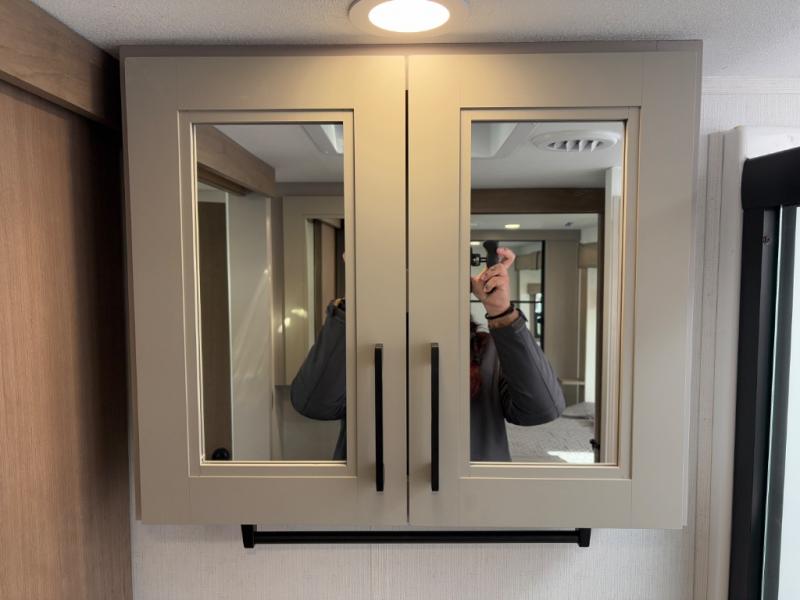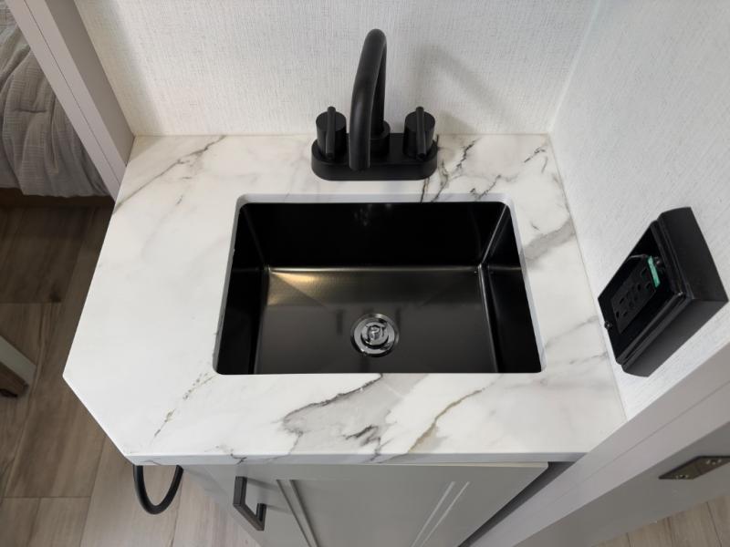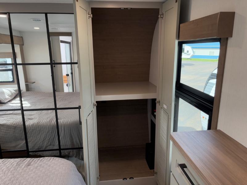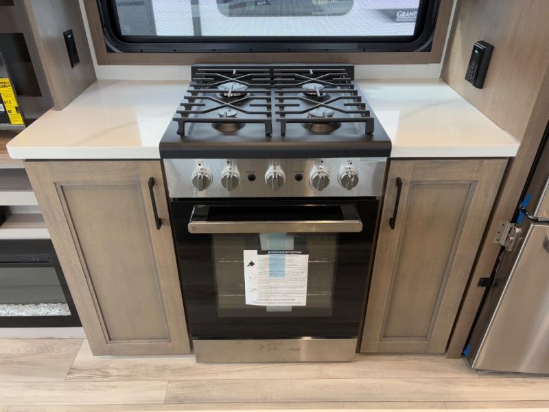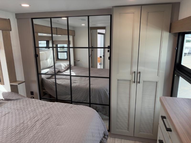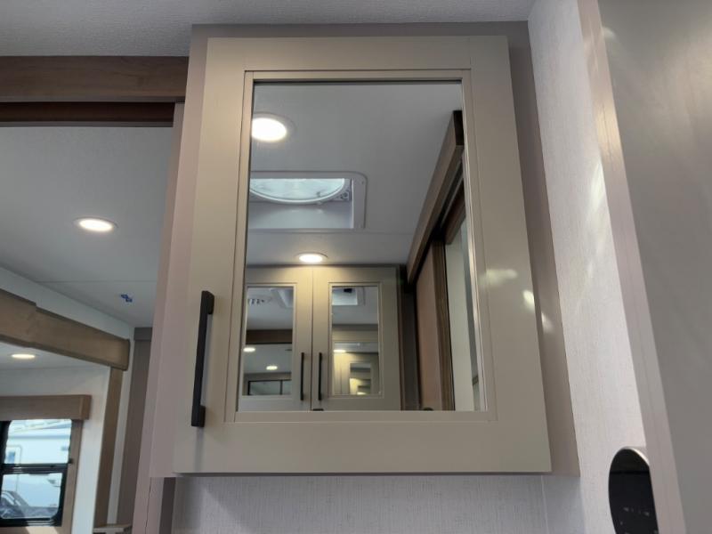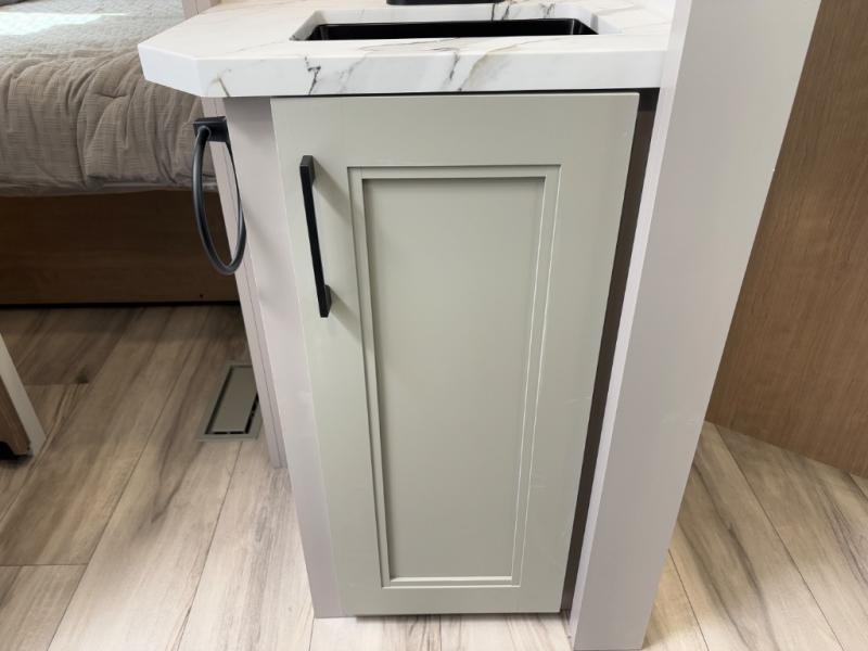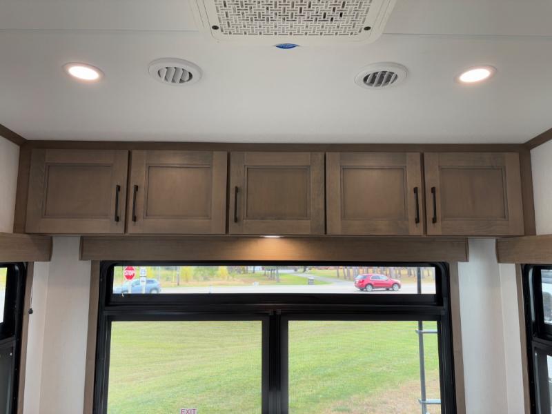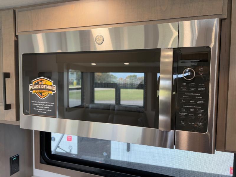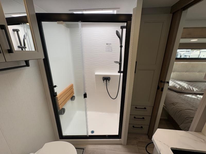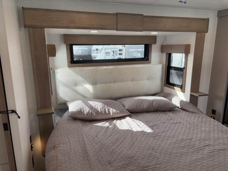 Start camping in luxury with this fifth wheel! The front private bedroom has a king bed slide which can be switched for an optional queen instead, a dresser, and a front wardrobe with washer and dryer prep. Start each morning feeling clean and fresh after showering in the 48" x 30" residential shower with a seat in the full bathroom. The kitchen has an island ideal for enjoying your morning coffee while reading the newspaper and socializing with the chef whipping up some scrambled eggs on the four burner range. The hutch can store your dishes, the pantry can store your canned goods, and the 18 cu. ft. refrigerator will keep your perishables fresh. If mother nature is raining on your parade then read a book on the rear hide-a-bed sofa or relax in the theater seating which has USB charging. And the entertainment center with a fireplace and 43" smart LED TV will keep you entertained!